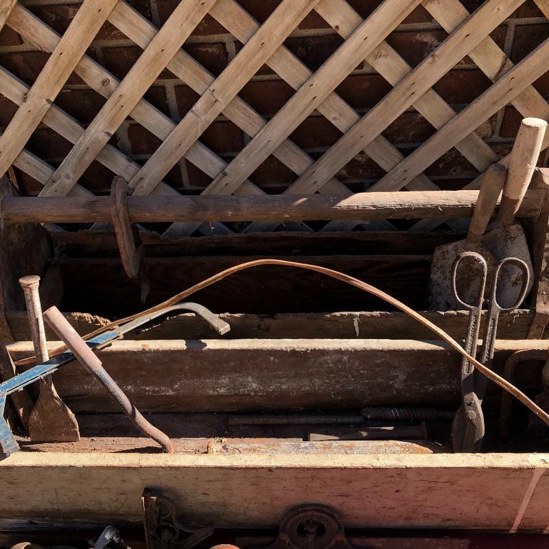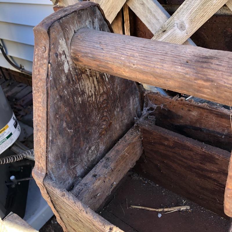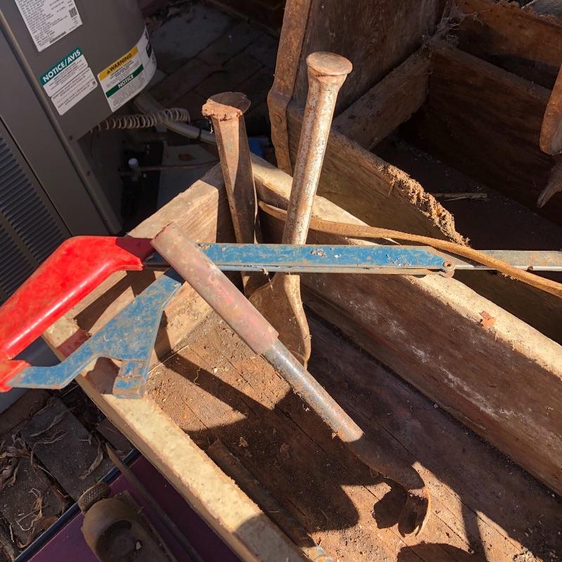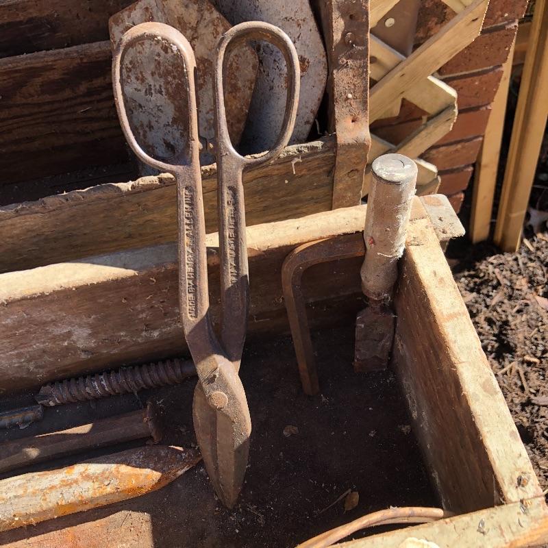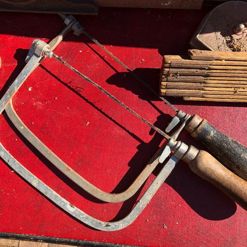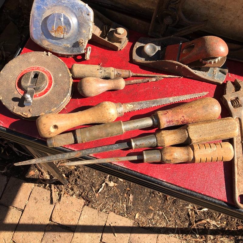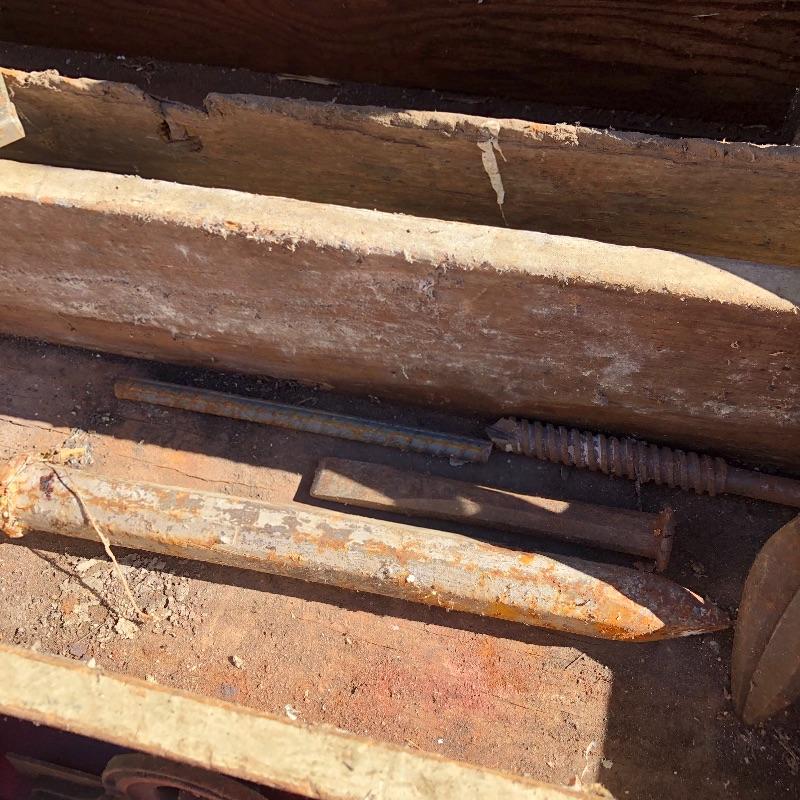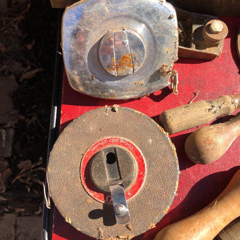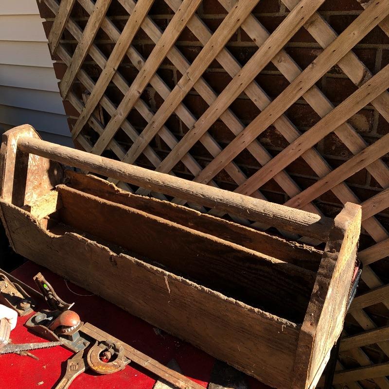 This lot contains two large wooden tool boxes. One of them has a wooden handle (34” x 8.5”’x 13.5”), and the other has a homemade handle made out of electrical tape. Some of the tools include small saws and chisels, a chalk line reel, two metal tape measures and one wooden tape measurer, and more. Local pickup only.