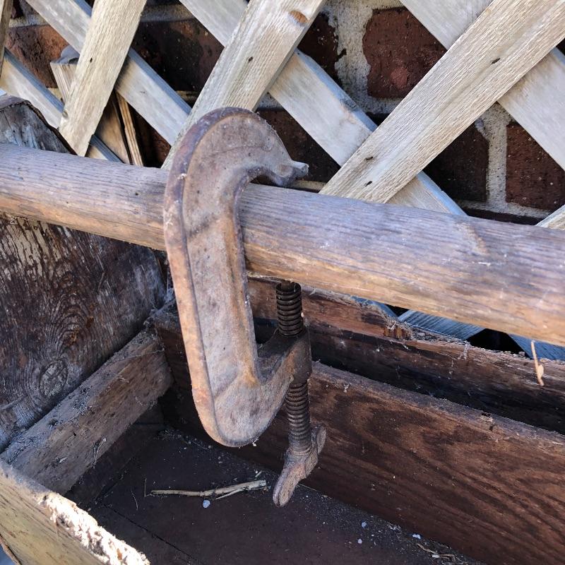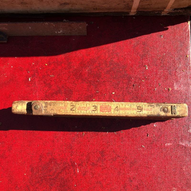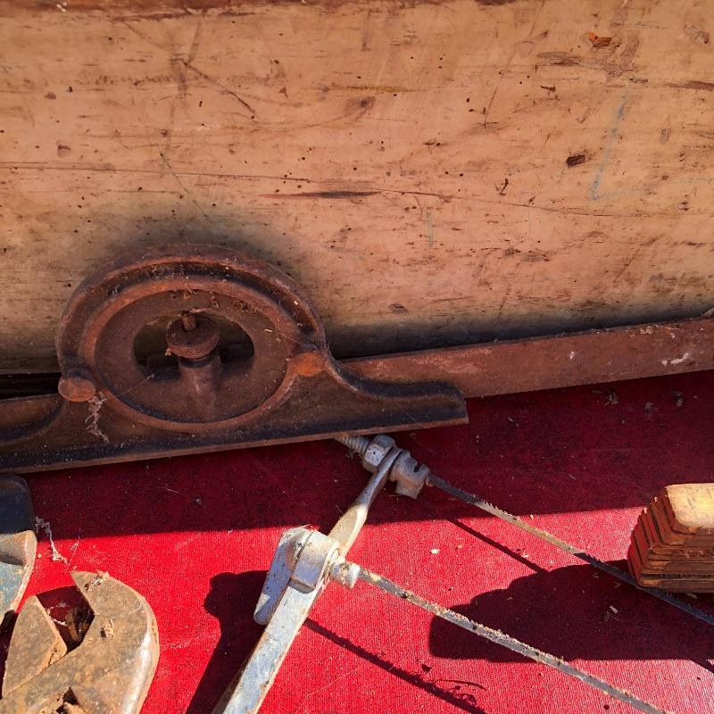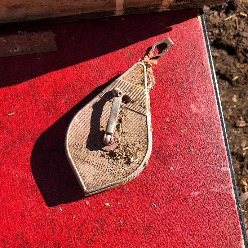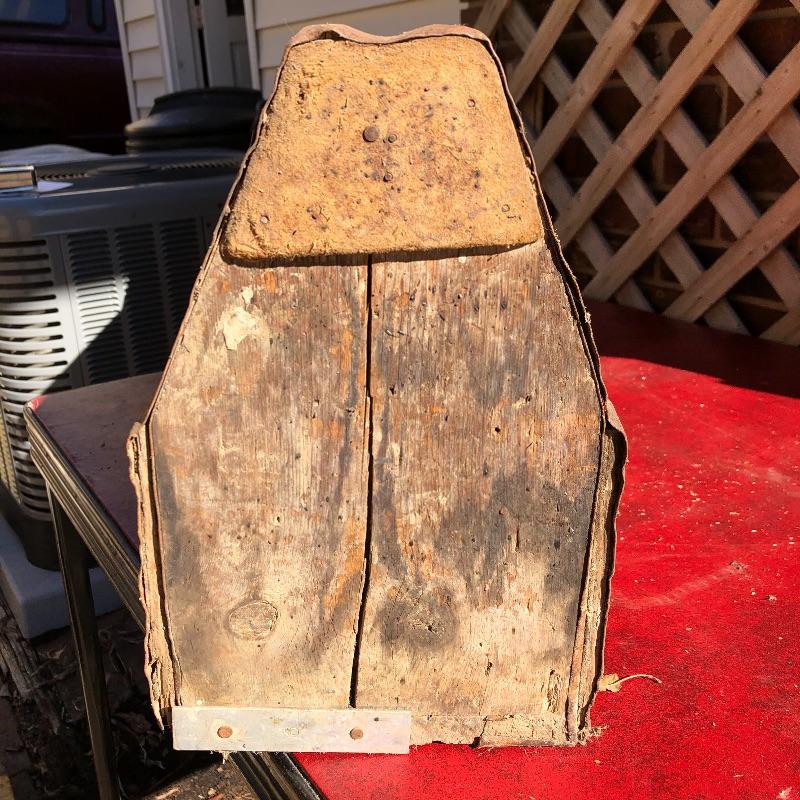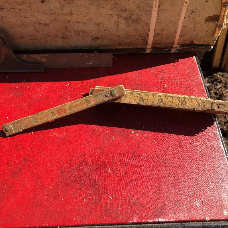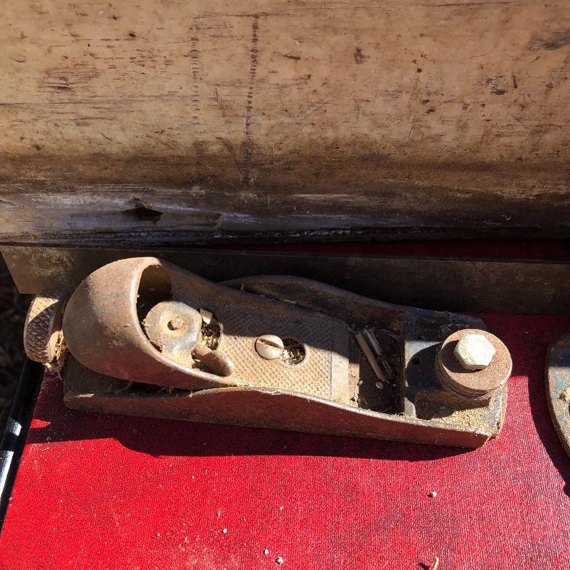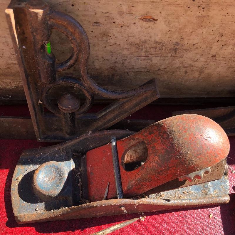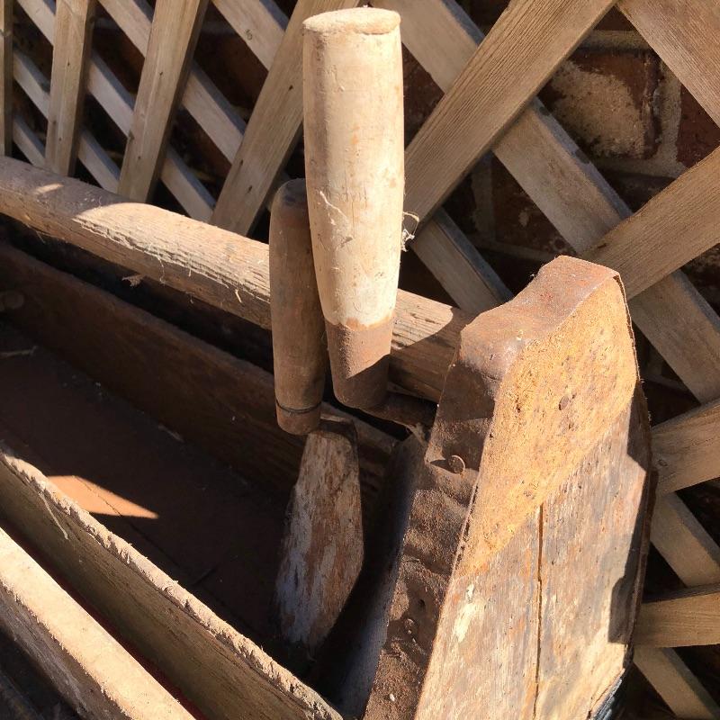 This lot contains two large wooden tool boxes. One of them has a wooden handle (34” x 8.5”’x 13.5”), and the other has a homemade handle made out of electrical tape. Some of the tools include small saws and chisels, a chalk line reel, two metal tape measures and one wooden tape measurer, and more. Local pickup only.