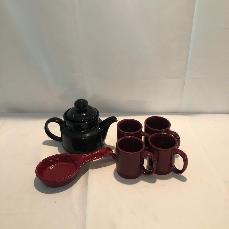 Are you a lover of tea? Perhaps you work in the tea industry? This one’s for you! This beautiful Waechtersbach teapot is jet black and ceramic, and in great condition (made in Spain). The mugs are a beautiful shade of dark red, and would make a great addition to any mug collection. All items are ceramic! Local pickup only.