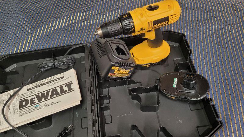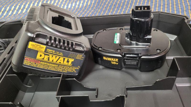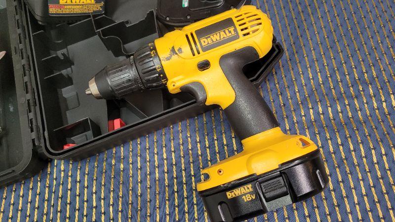 Lot 1372: DEWALT 18v Cordless Drill w 2 Batteries and Charger + Case TESTED A+