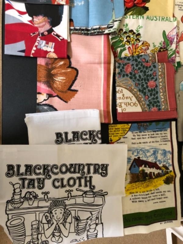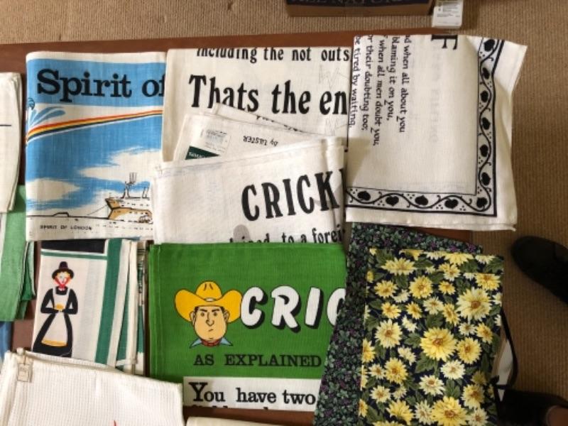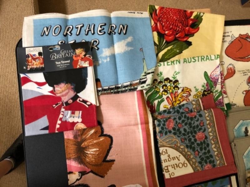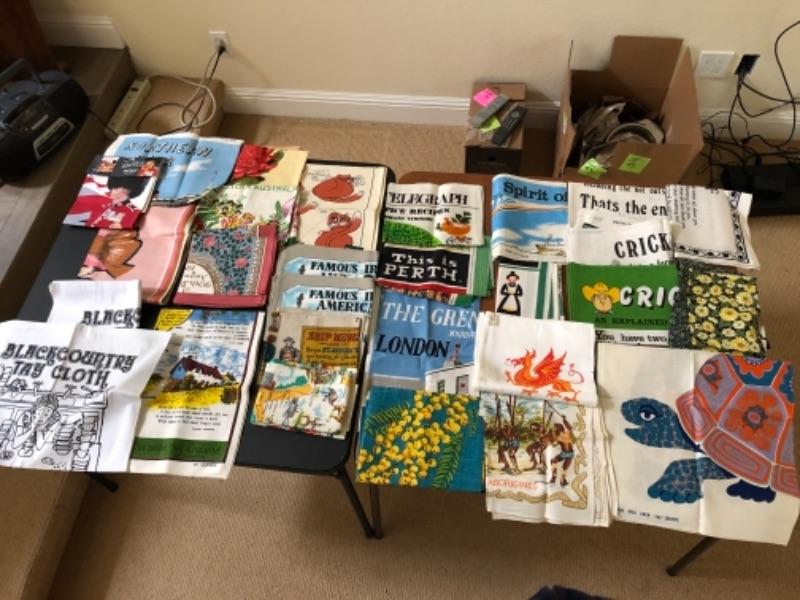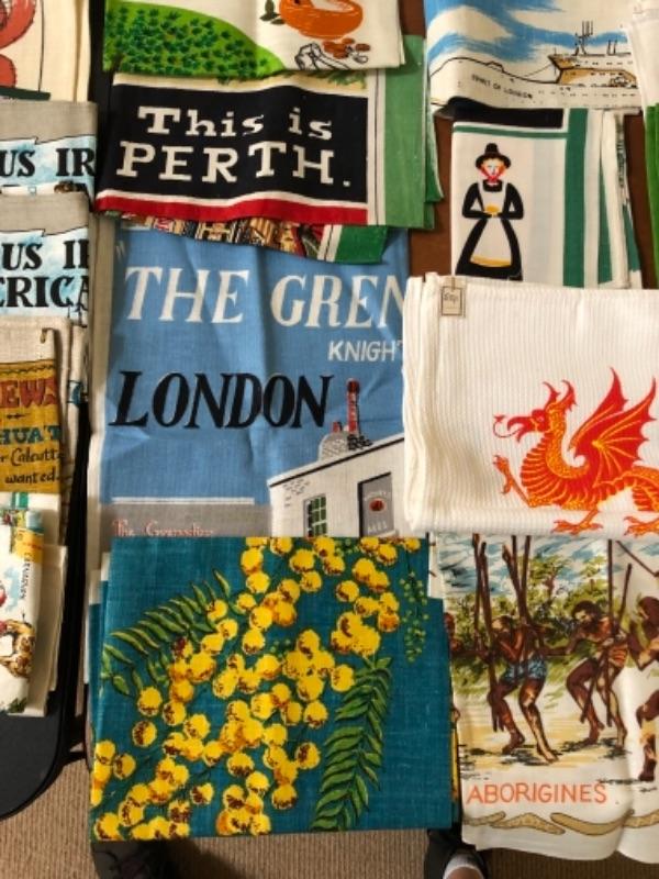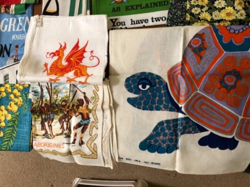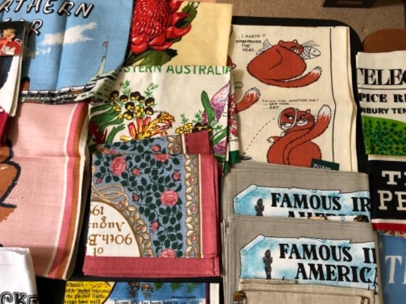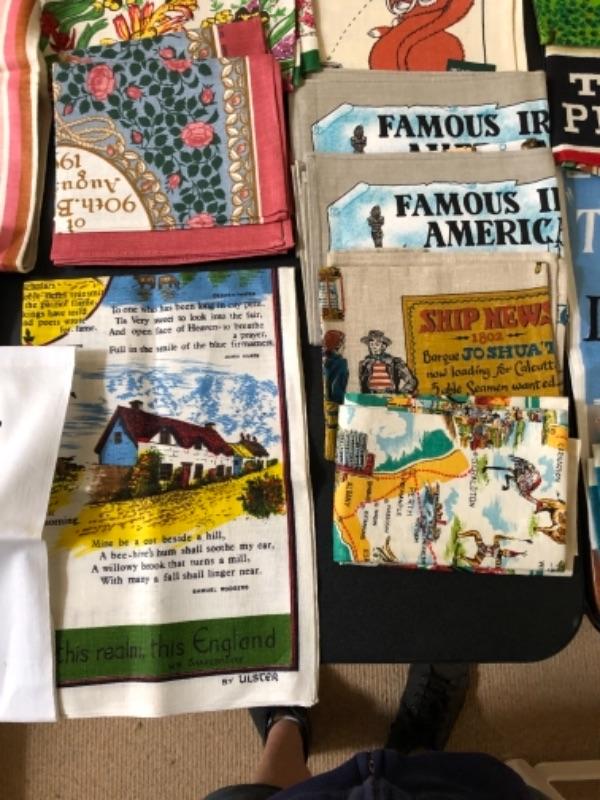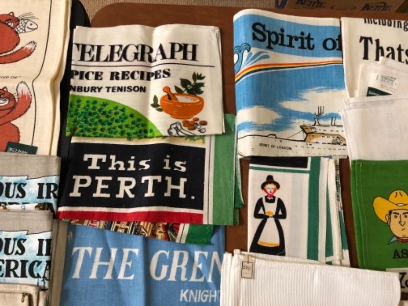 Lot 137U. Large assortment of vintage linen tea towels from around the world, mint condition, 2 wine bags--$75