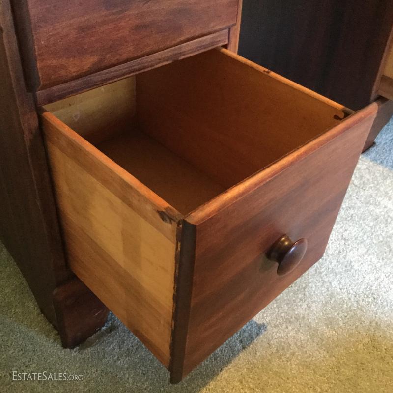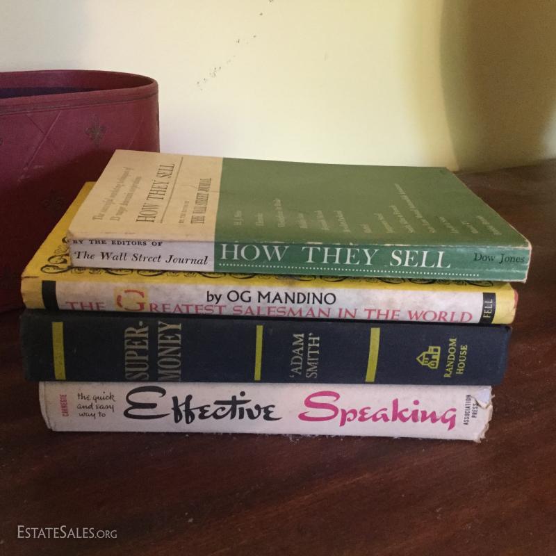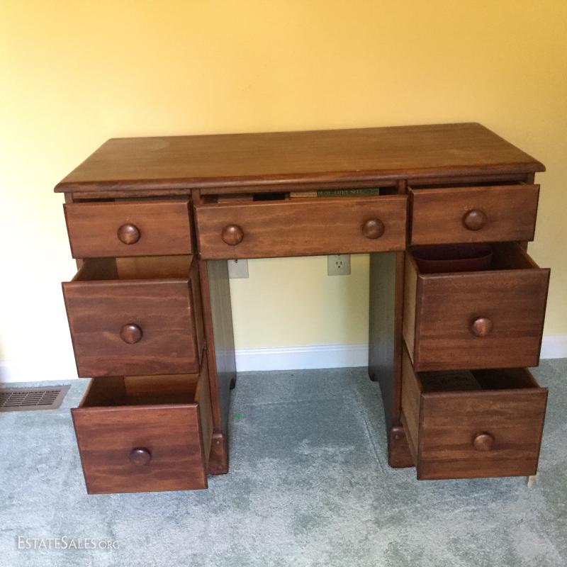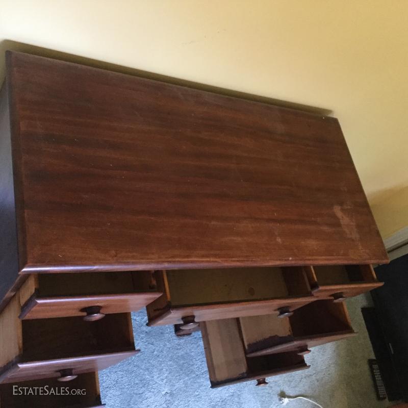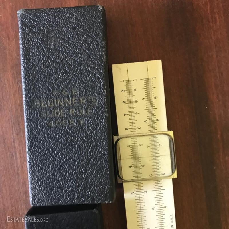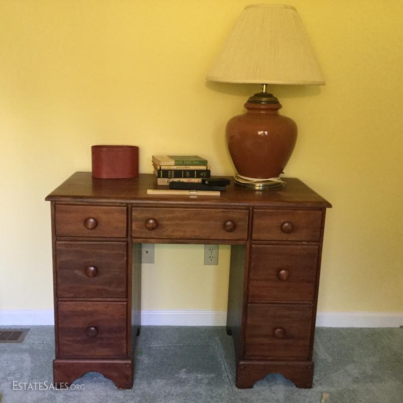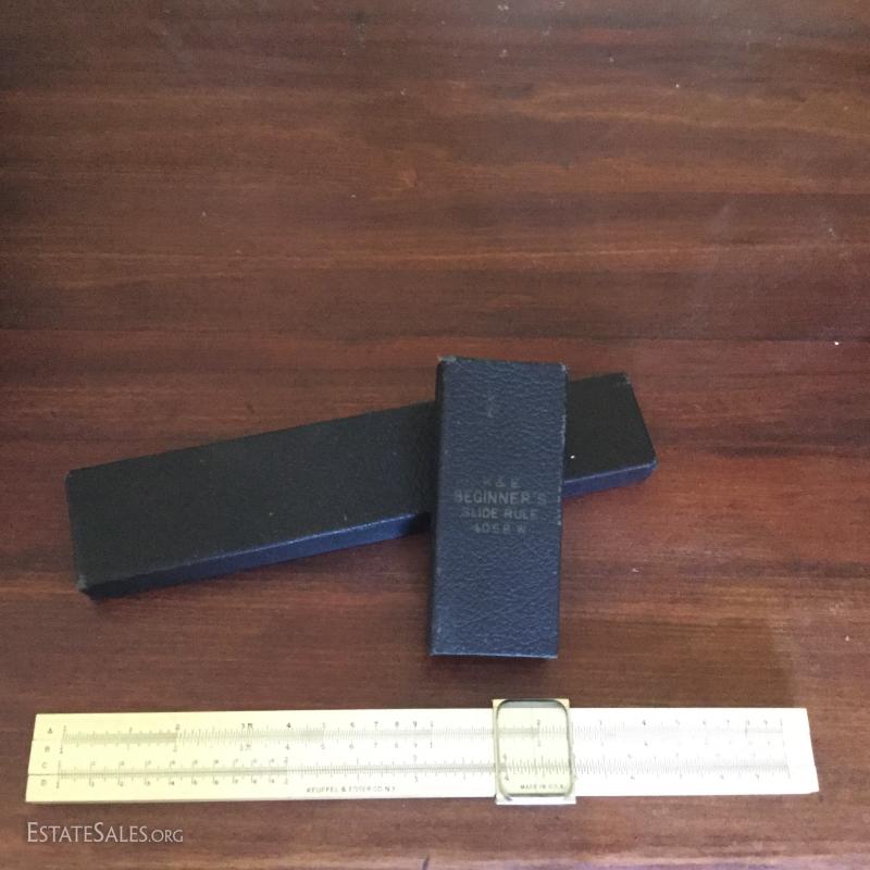 This lot includes items for your home office. Solid wood desk with 7 drawers measures 40"l x 20"w x 30"h. Four vintage books on making money and sales, slide rule by Keiffel & Esser in case, and a brown colored lamp measuring 11"l x 27.5"tall. See photos for details. No Shipping. Only local pick up in Flat Rock, NC.