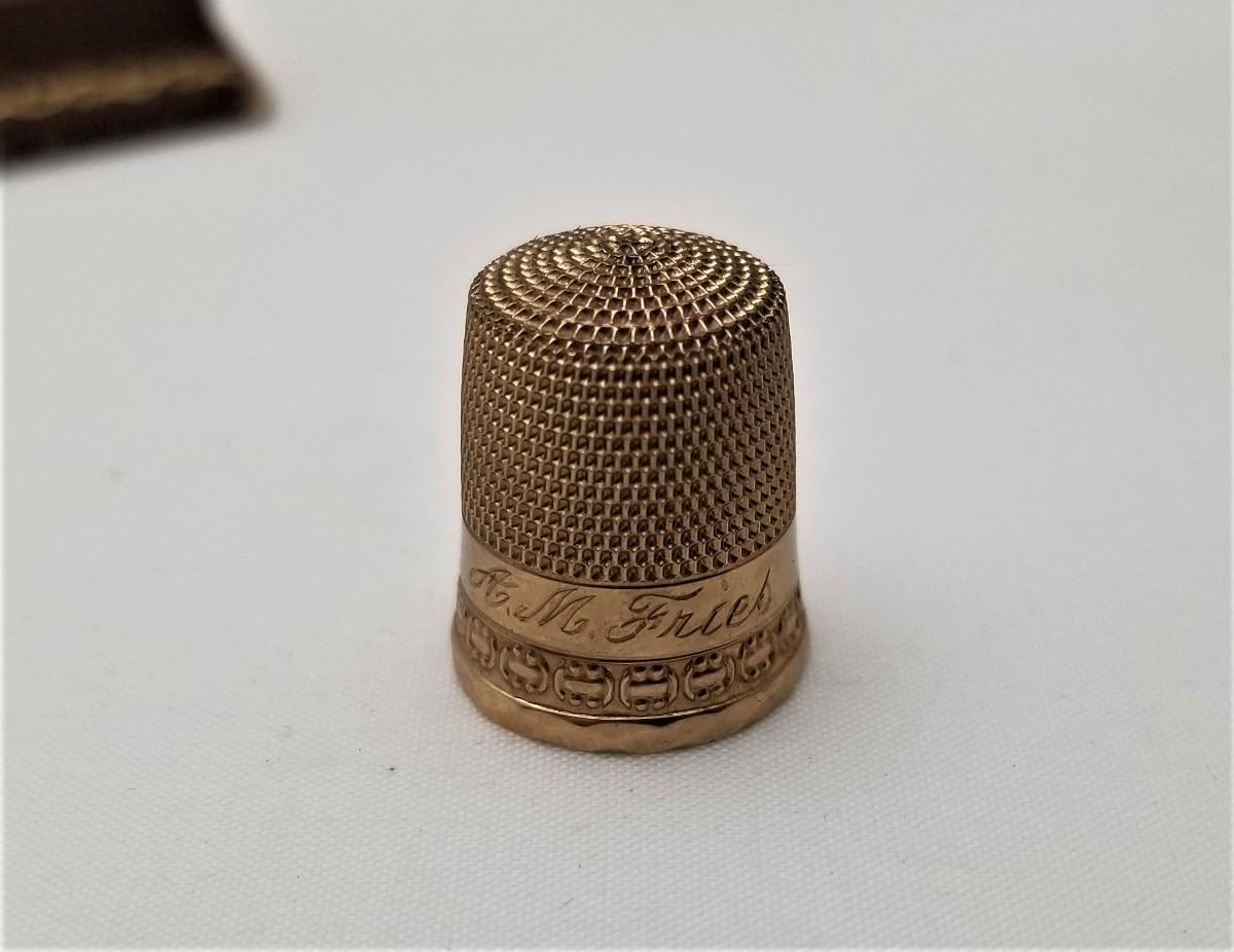 What a beauty! 14kt Gold (tested) thimble in the original jeweler's box - it's a #9 Thimble engraved "A.M. Fries". Gold thimbles were usually engraved when presented as a special gift. I haven't seen one of these in AGES. Thimble is .75" tall.