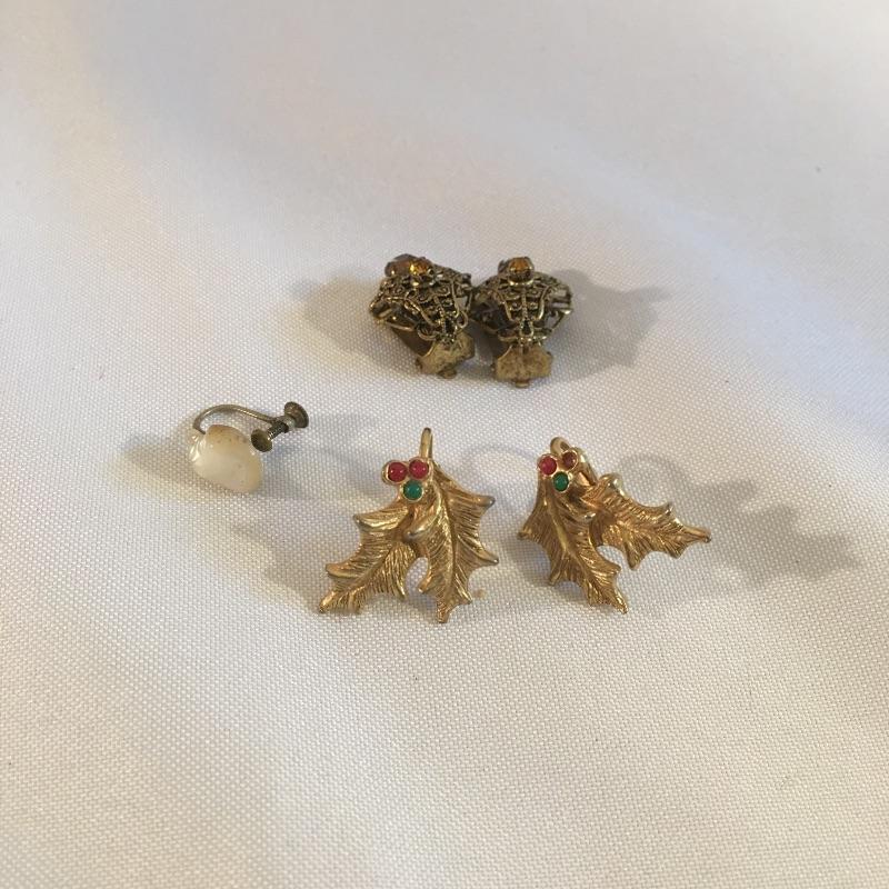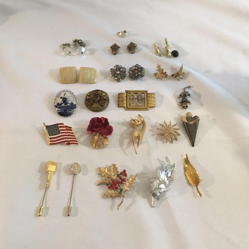 Lovely selection of pins in a variety of styles and five pairs of clip on earrings. You can have a pin for every mood with this great lot.