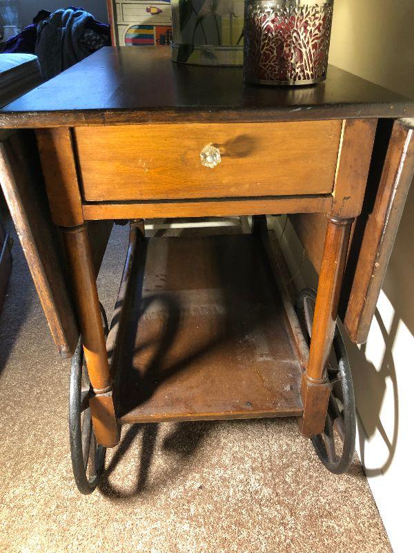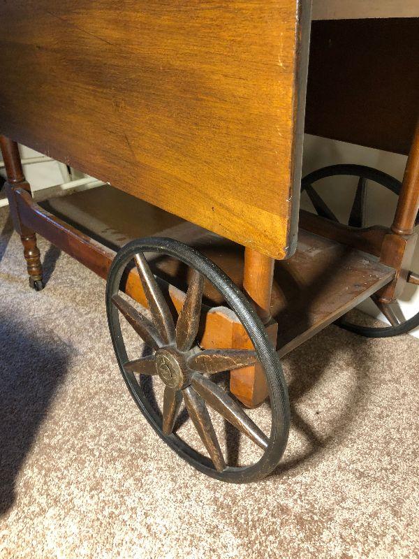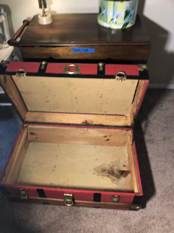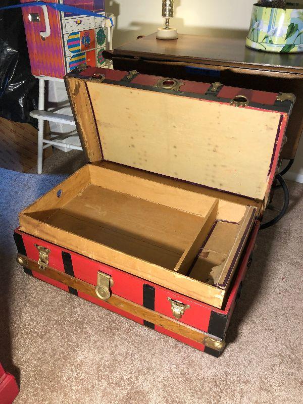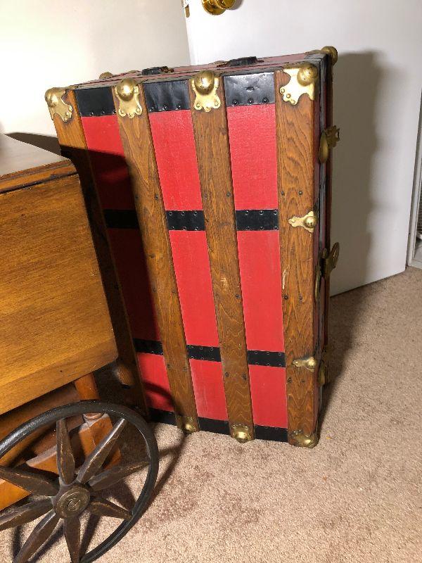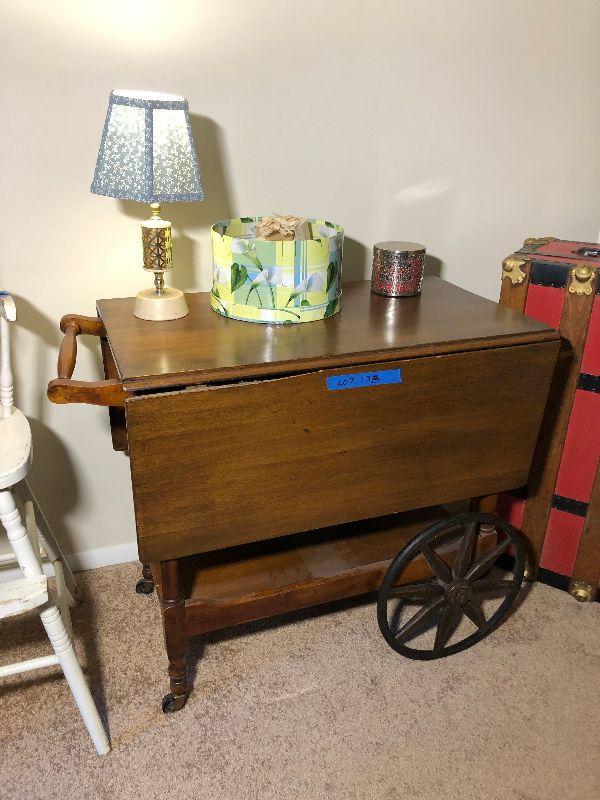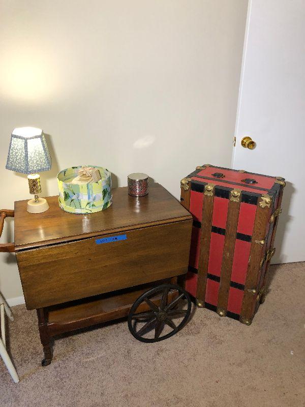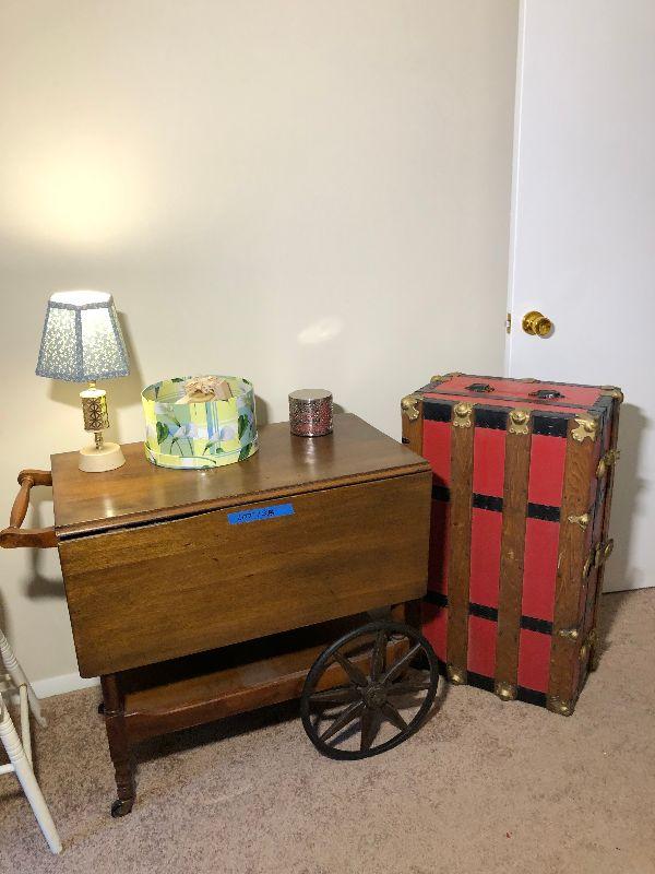Vintage wood tea cart, red trunk and miscellaneous other items.