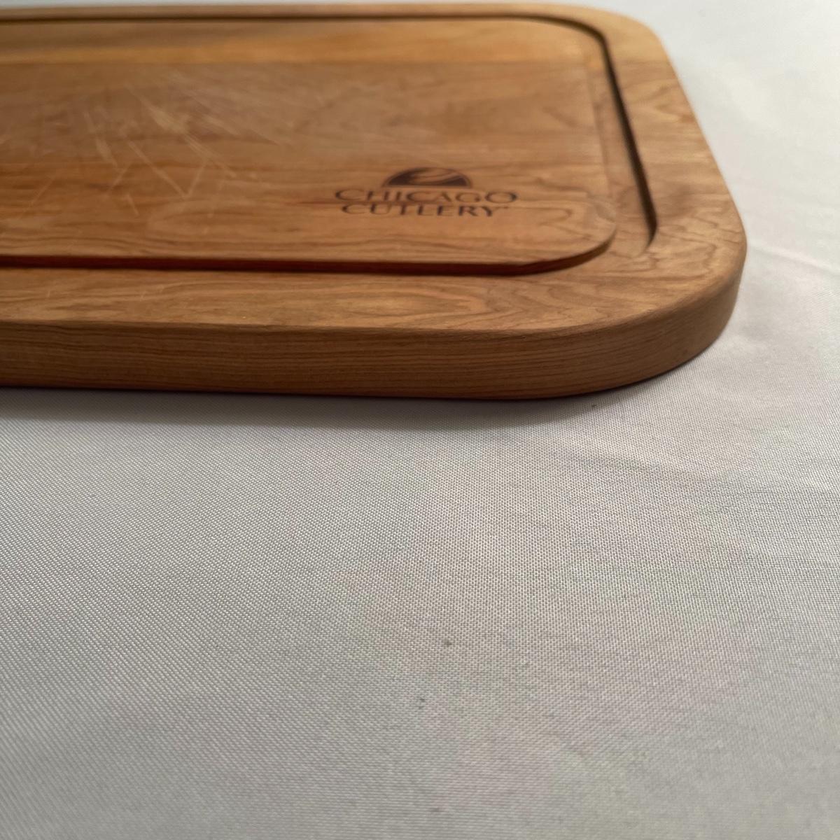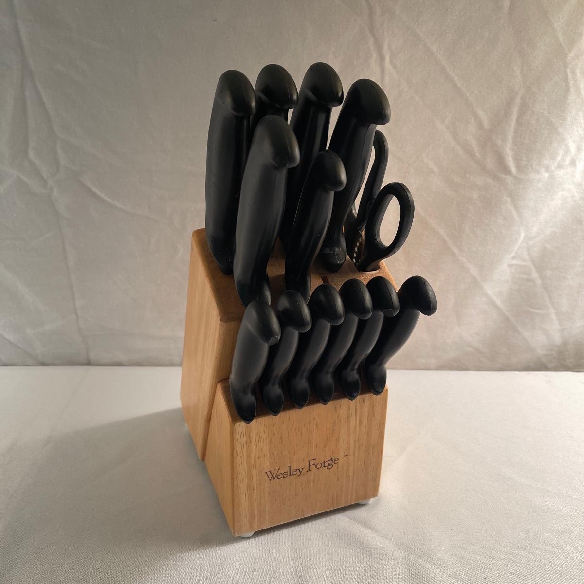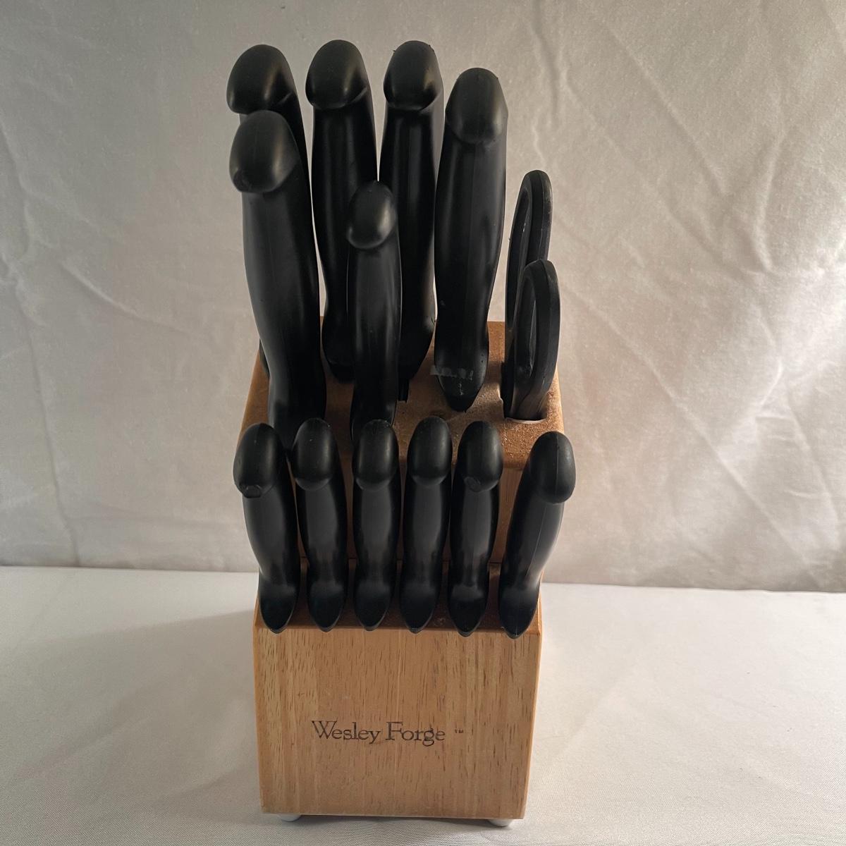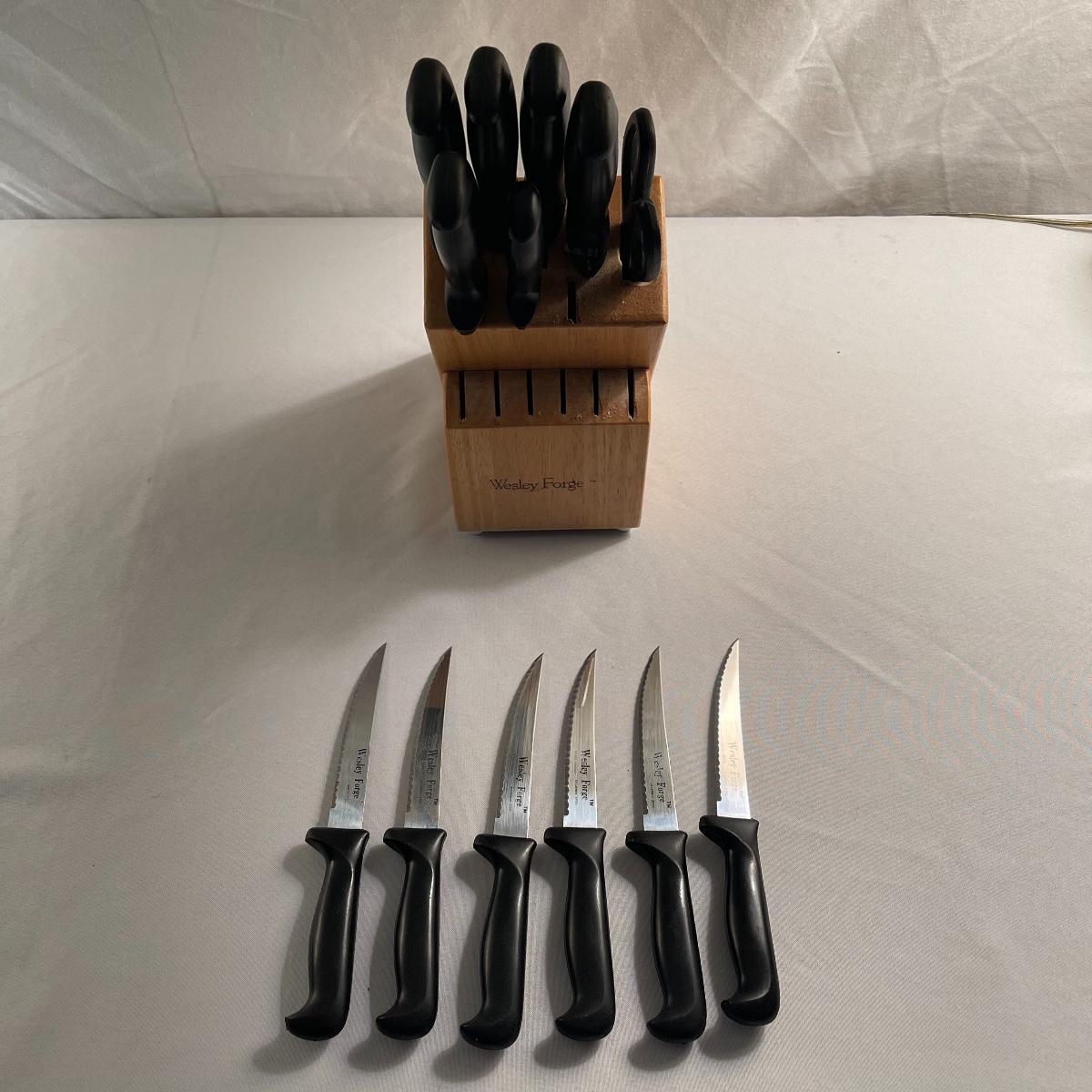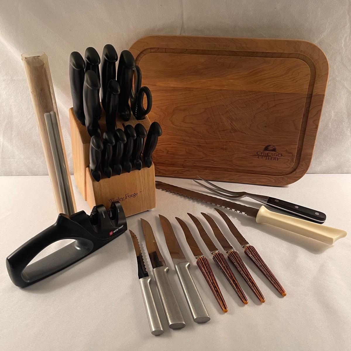 This variety of kitchen knives includes a set of Wesley Forge knives, wooden handled knives, knives with silver handles, and a few assorted single knives. If any of those get dull, no worries; knife sharpeners are also included in this lot! One of those sharpeners is a Wüsthof brand. A Chicago cutlery cutting board is a perfect addition to this lot full of knives. Chicago Cutlery cutting board measures approximately 15.5” x 11.5”