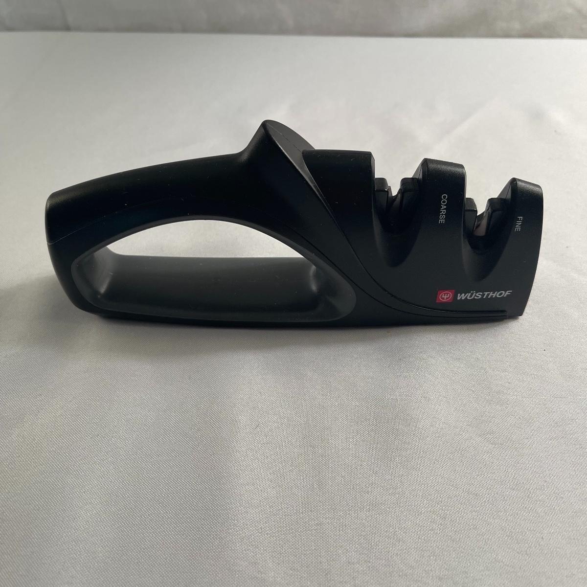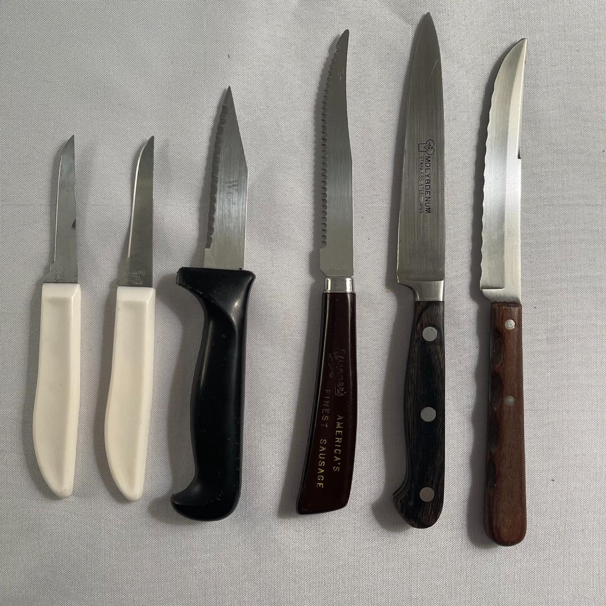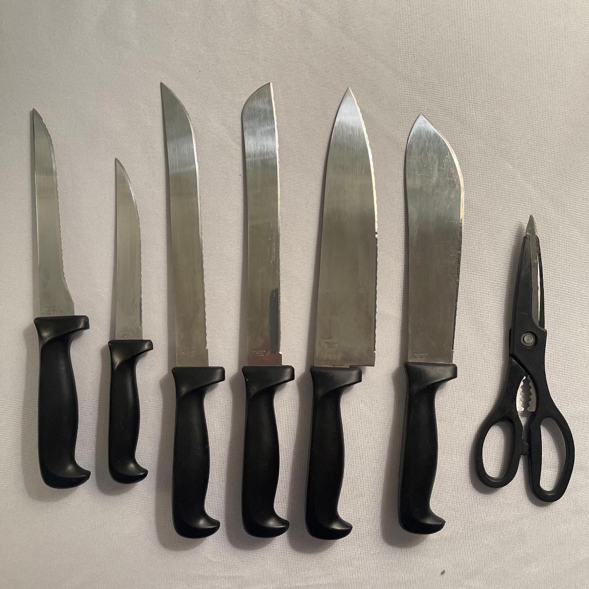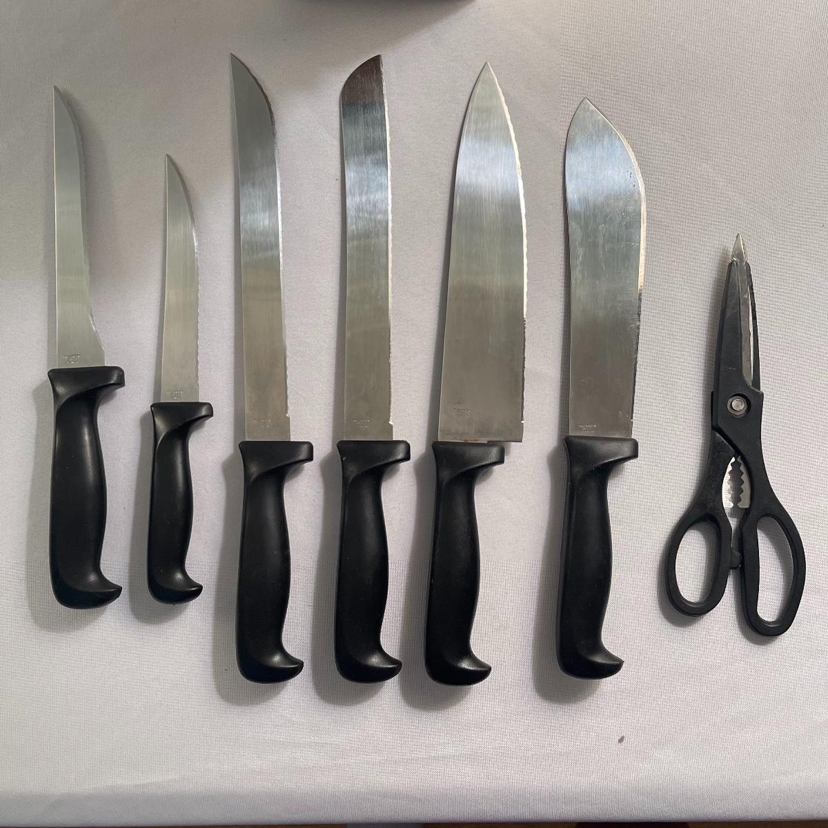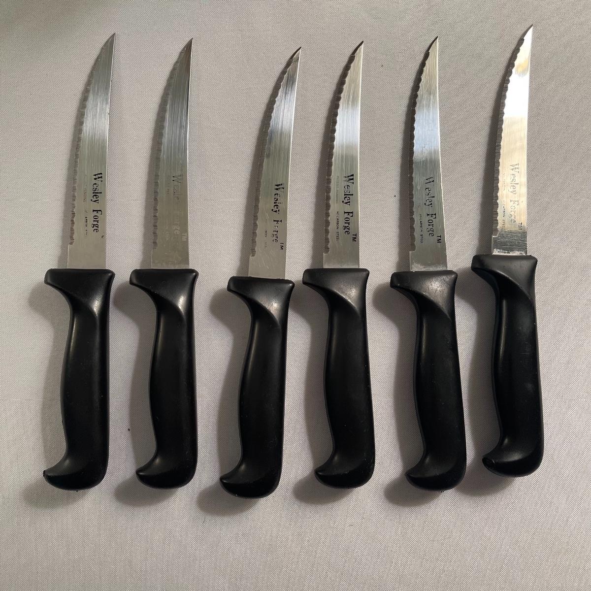 This variety of kitchen knives includes a set of Wesley Forge knives, wooden handled knives, knives with silver handles, and a few assorted single knives. If any of those get dull, no worries; knife sharpeners are also included in this lot! One of those sharpeners is a Wüsthof brand. A Chicago cutlery cutting board is a perfect addition to this lot full of knives. Chicago Cutlery cutting board measures approximately 15.5” x 11.5”
