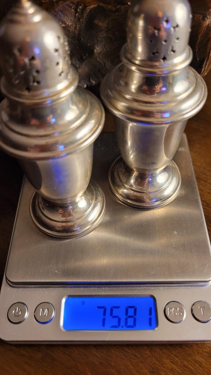 Vintage Set Of GORHAM Sterling Salt and Pepper Shakers. Each measures about 4.5" Tall. Appear to weigh just over 75 grams total for both. These are solid Sterling - not Weighted.