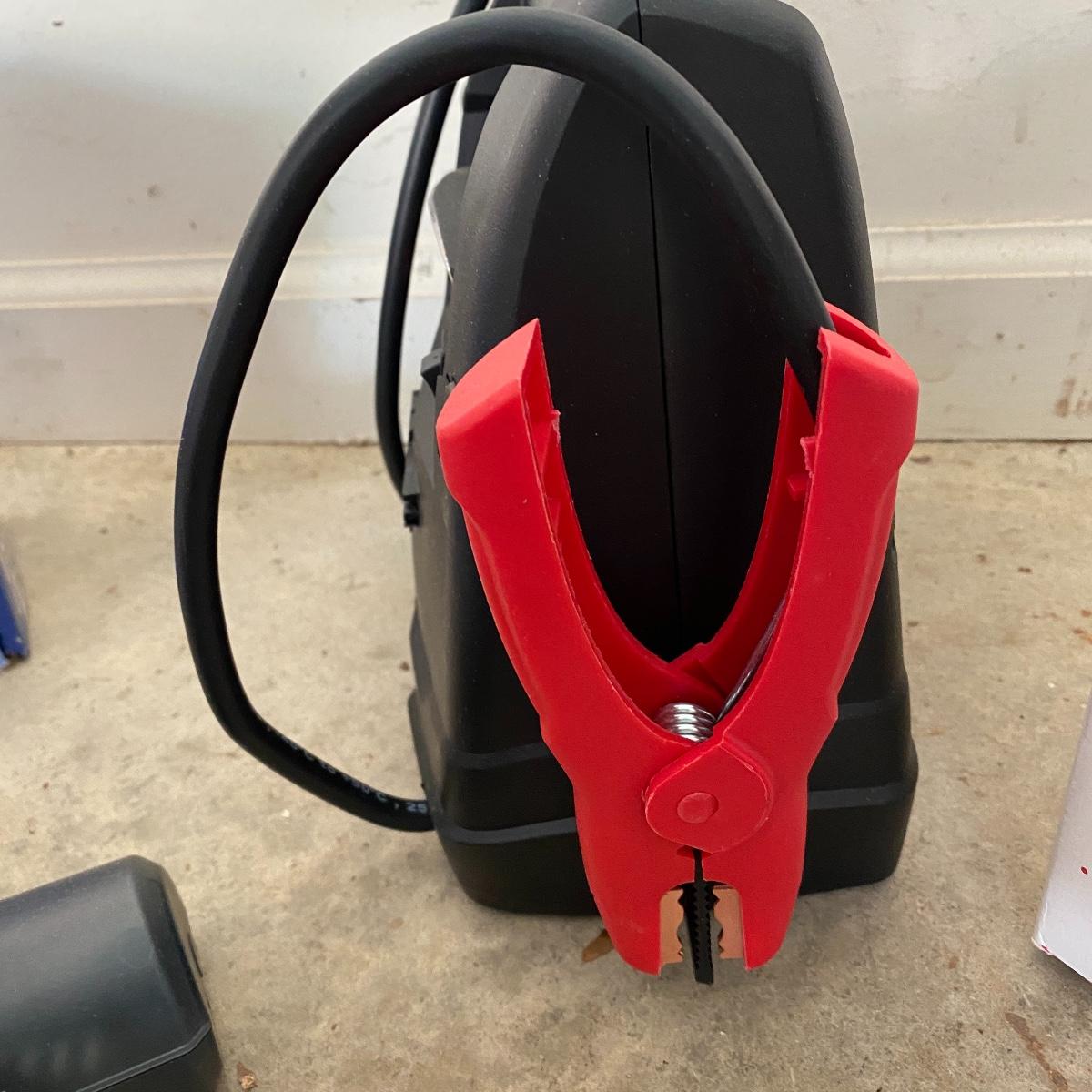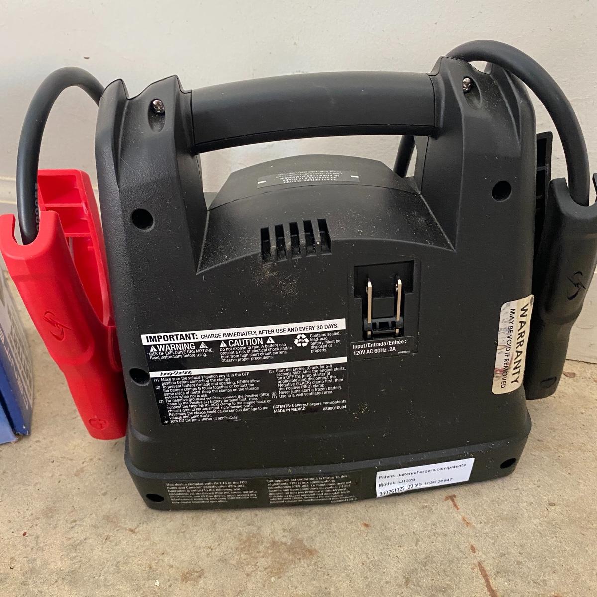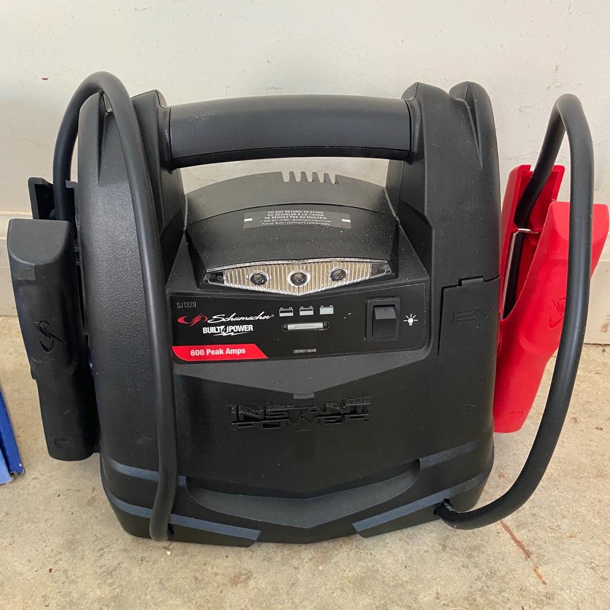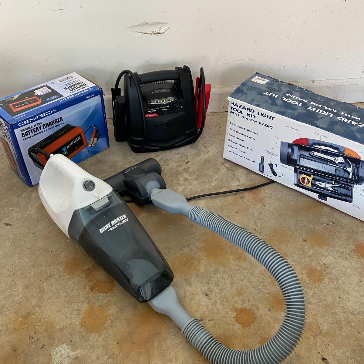 A collection of car accessories is perfect for staying safe and clean. It includes a battery charger that is new in box. a Black & Decker Dust Buster, an “Instant Power” jump power pack, a hazard light tool kit in box, parking aids and more. Vacuum worked when tested.