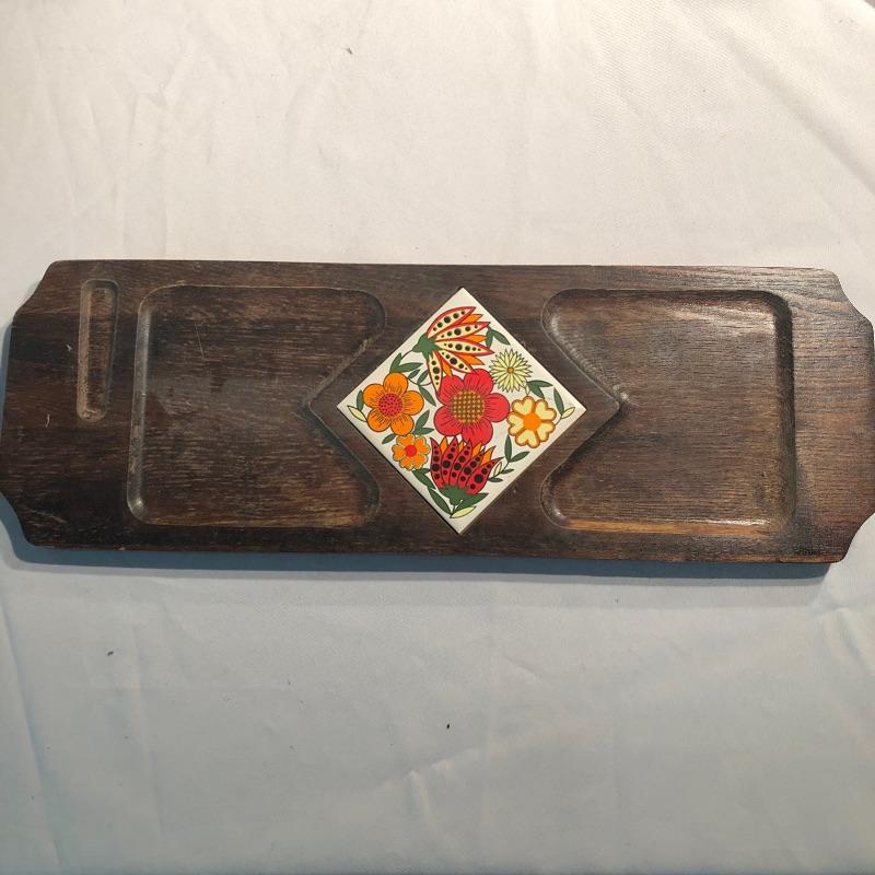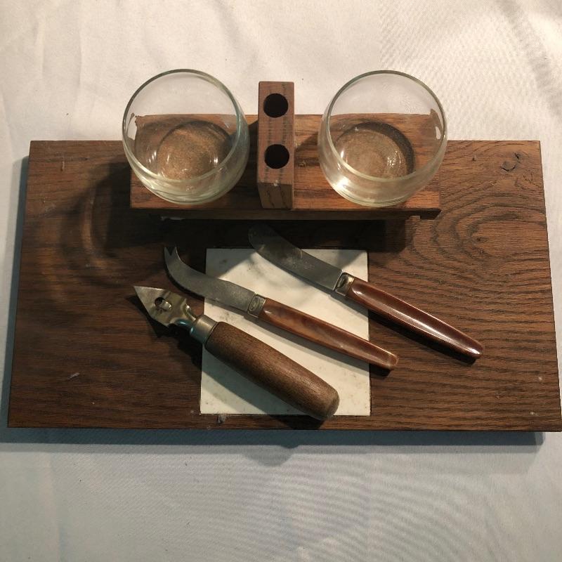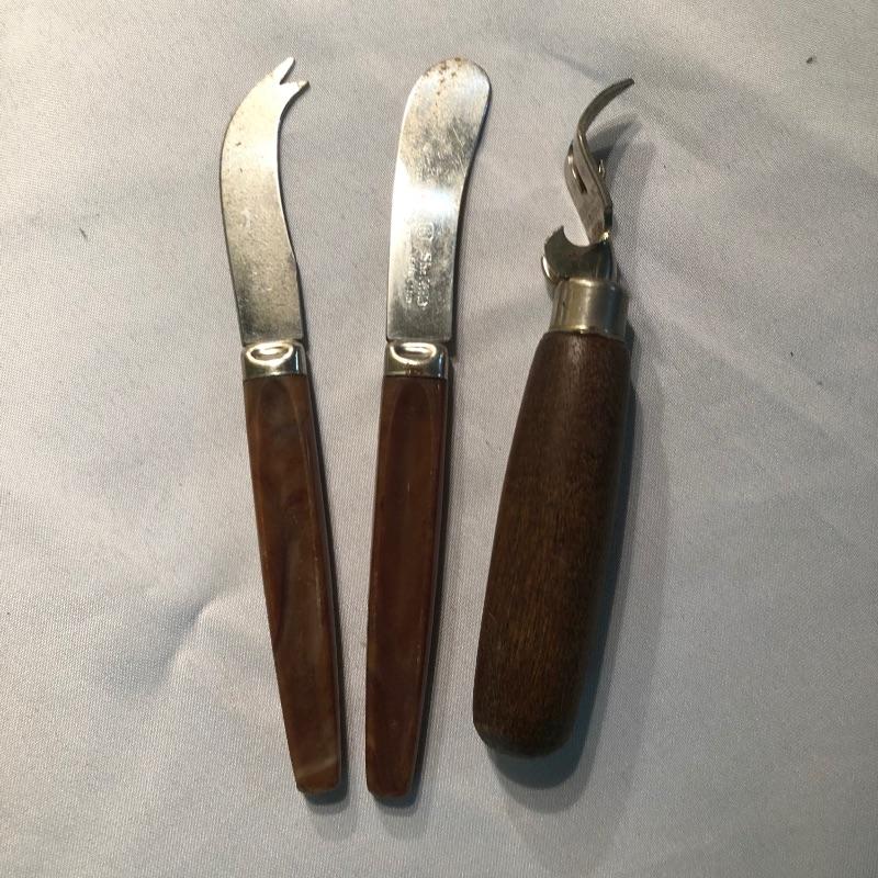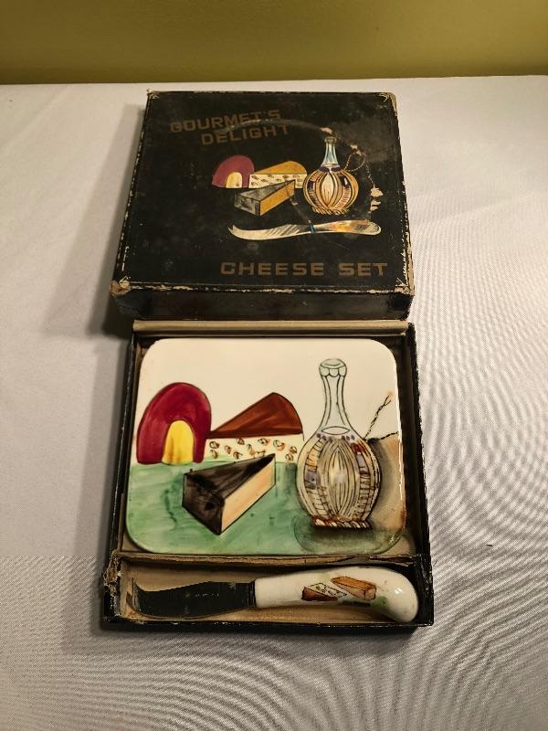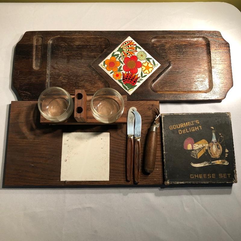 This lot includes 2 wooden serving platters, three cheese knives, and a Gourmet’s Delight cheese set. The cheese set has a cheese knife and a matching ceramic platter. The wood is in very good condition, and there are almost no stains or cracks in the wood. The knives are also in good condition, with almost no rust. Shipping available.