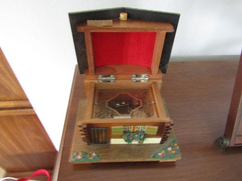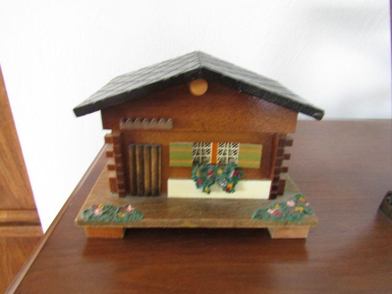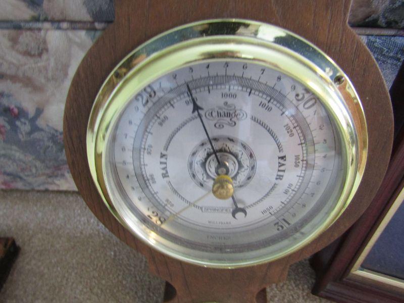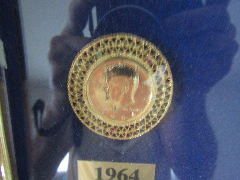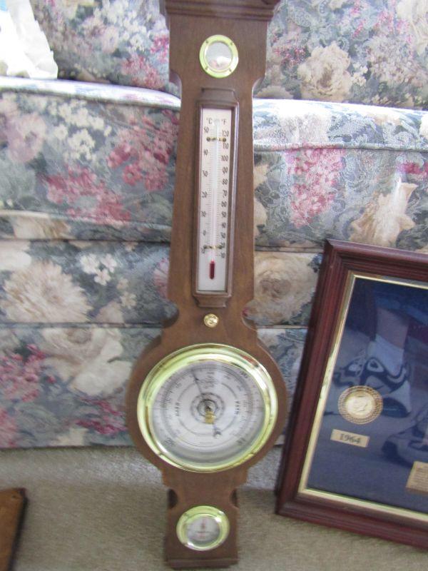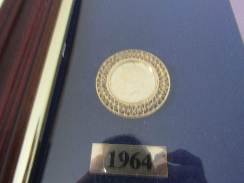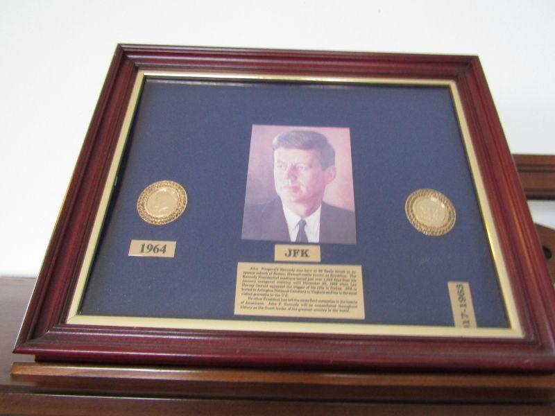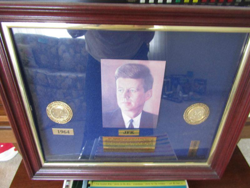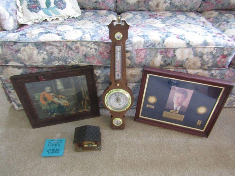 WALL BAROMETER, LOG CABIN MUSIC BOX, 1964 FRAMED PICTURE OF JFK & 2 1964 JFK 1/2 DOLLAR COINS IN NICE FRAME