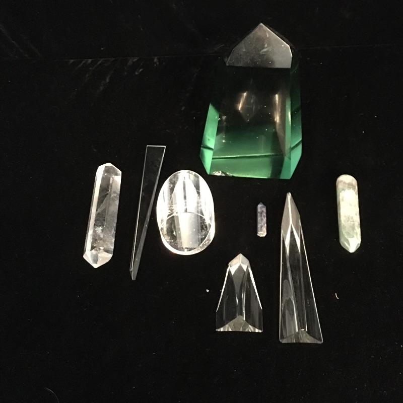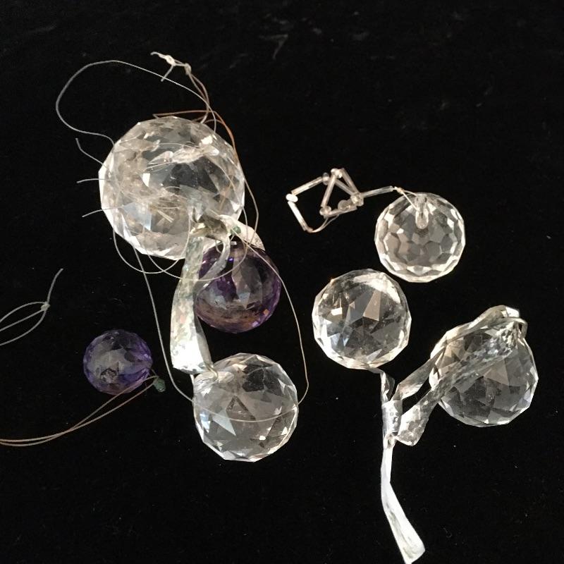 Nice array of crystals, prisms and glass in an assortment of sizes and colors. Largest crystal measures 2.25” x 4” x 6.5”.