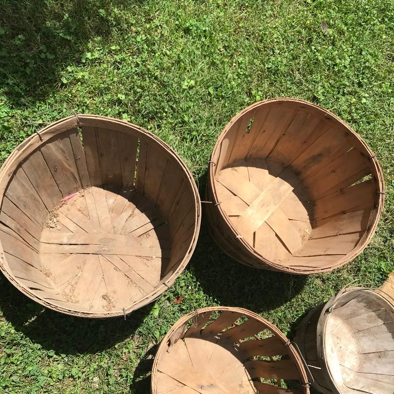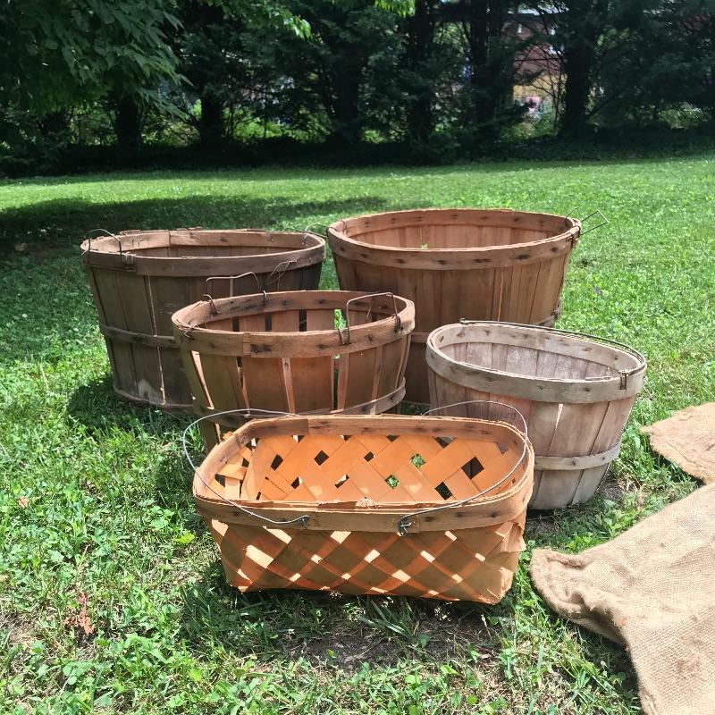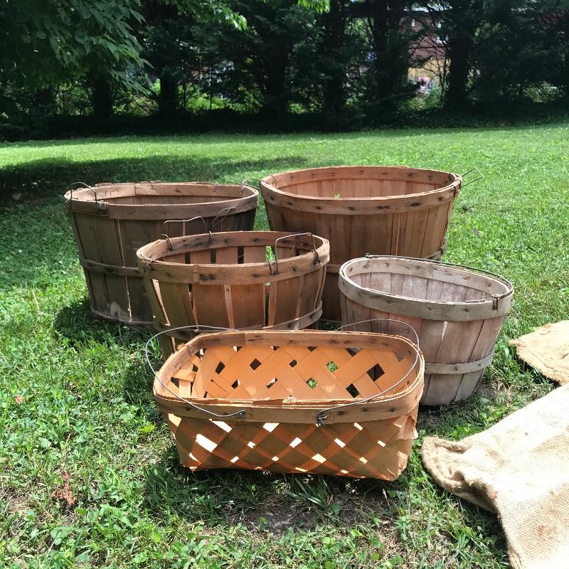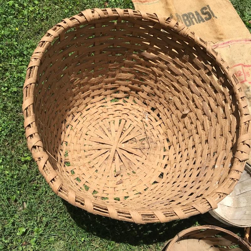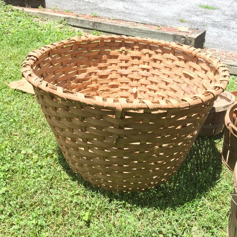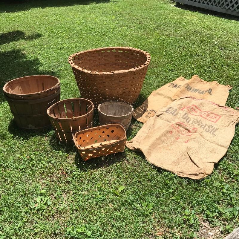Amazing find here - what appears to be an antique cotton picking basket measuring approximately 30.5d x 17” at the top, basket tapers in towards the bottom. The previous owner said it came from relatives in Alabama and was used for picking cotton back in the day. This basket is beautiful and in wonderful condition. Lot also includes two burlap coffee bags and a variety of baskets perfect for harvesting or farmer market shopping. Burlap bags are approximately 28” x 37”. All items were found in garage and need some dust washed off. See photos. Local pick up only.