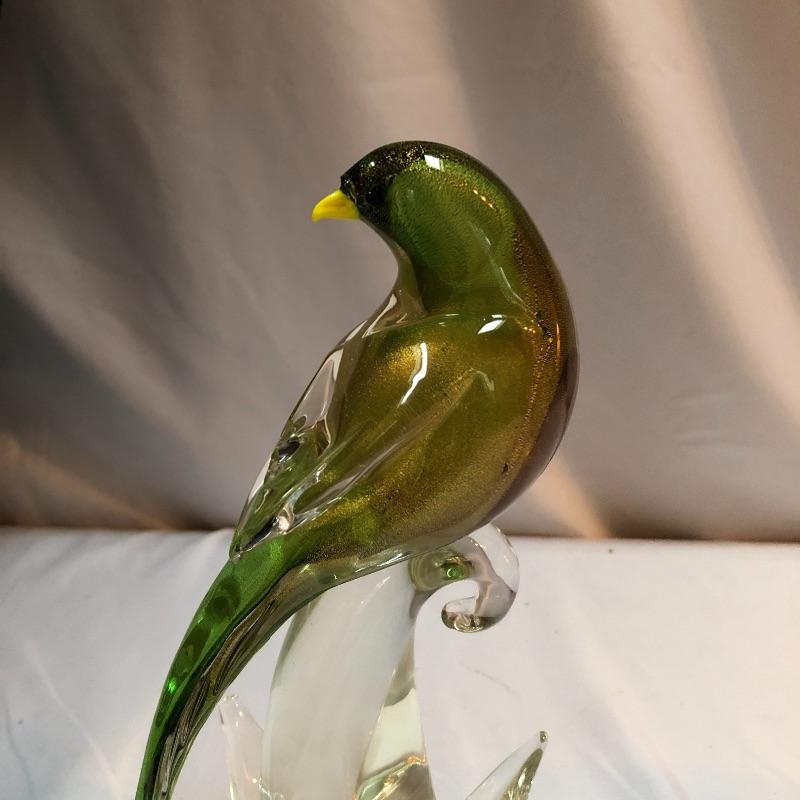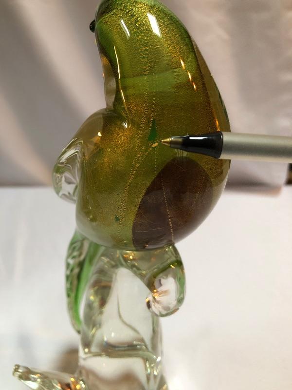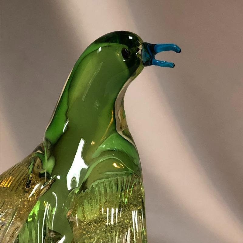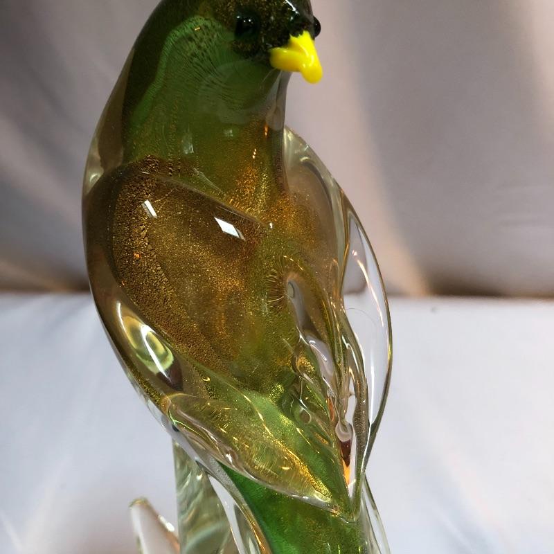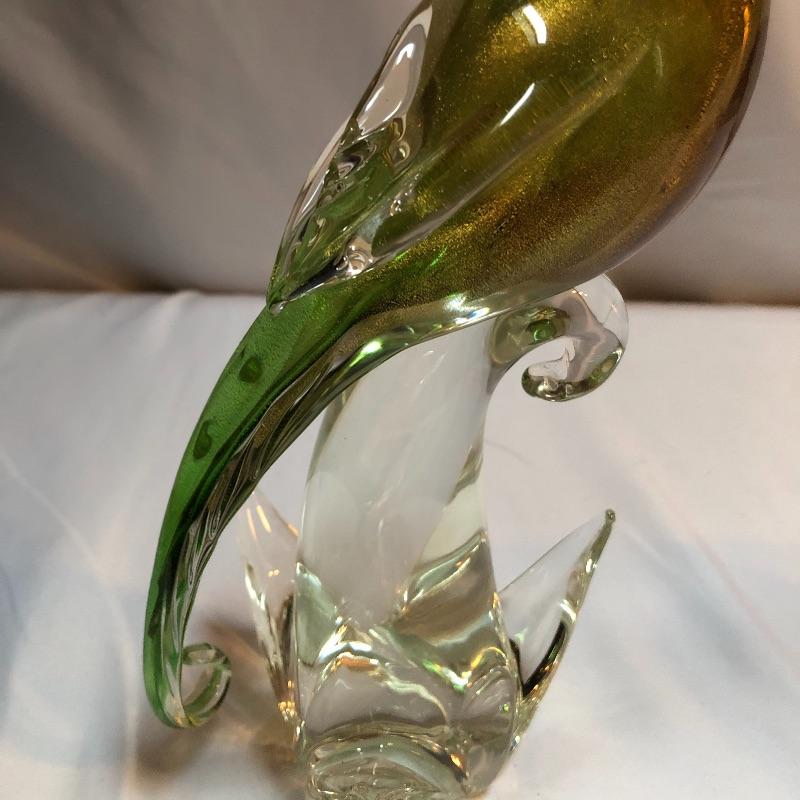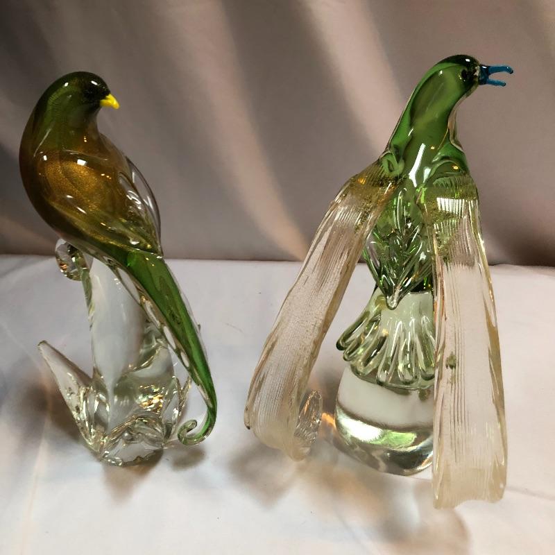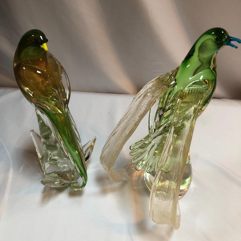 This stunning pair of hand blown glass birds have no makers marks but are in the style of Formia Vetri Di Murano. The larger bird has a decadent gold speckled tail feathers with a green body and electric blue beak and measures 10” tall. The other bird has a yellow beak and a green body with a translucent gold color on the inside which shimmers in the light. We noticed a few marks in the gold that are shown in last image.