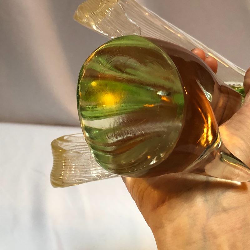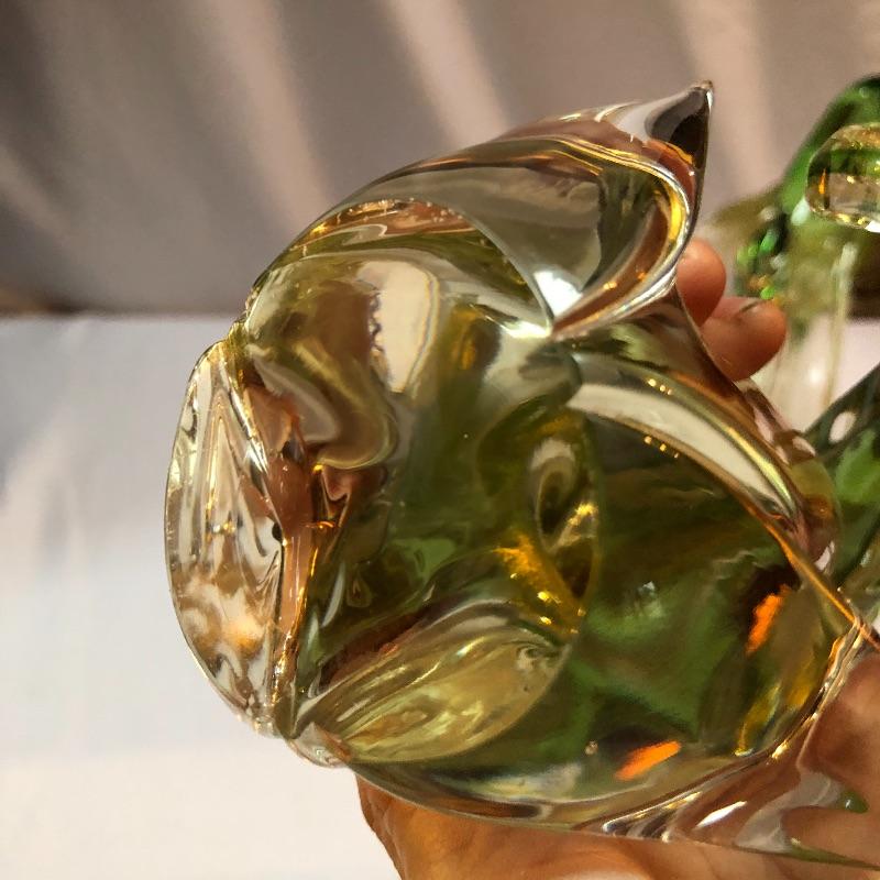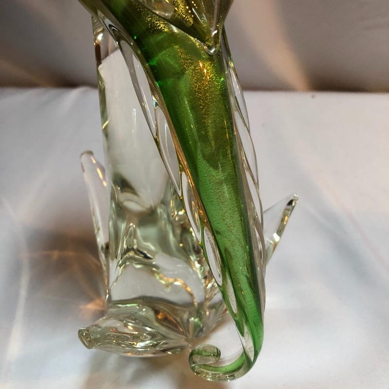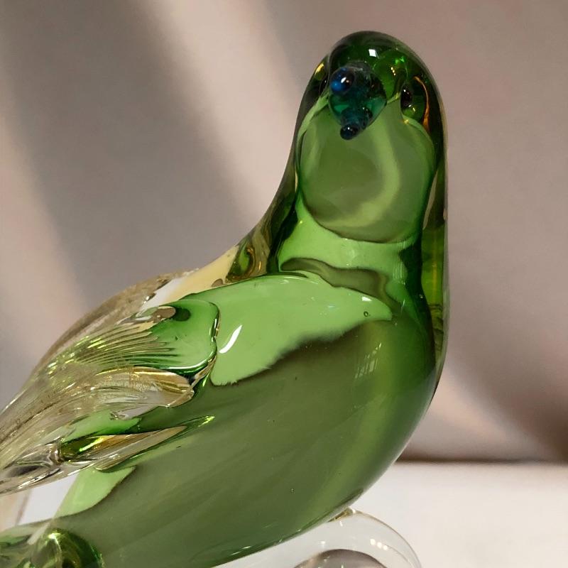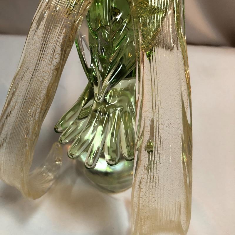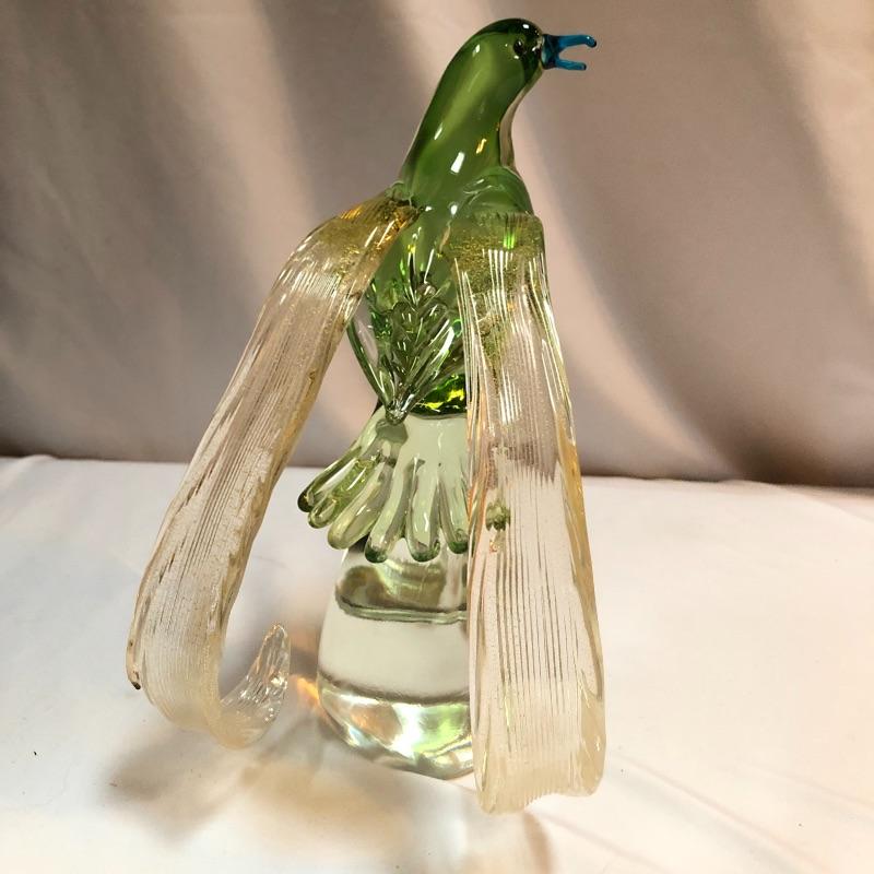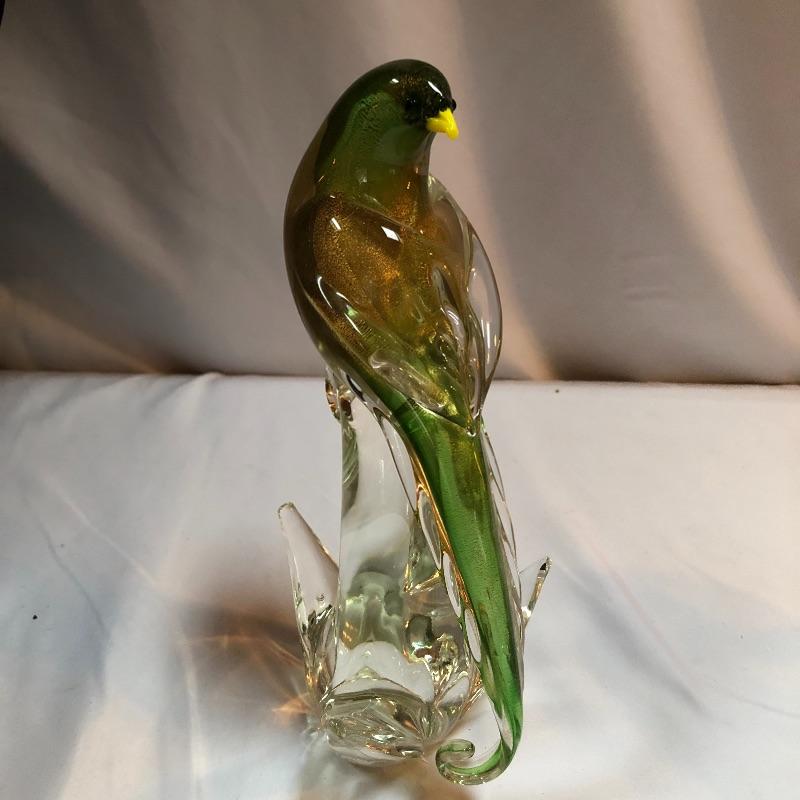 This stunning pair of hand blown glass birds have no makers marks but are in the style of Formia Vetri Di Murano. The larger bird has a decadent gold speckled tail feathers with a green body and electric blue beak and measures 10” tall. The other bird has a yellow beak and a green body with a translucent gold color on the inside which shimmers in the light. We noticed a few marks in the gold that are shown in last image.
