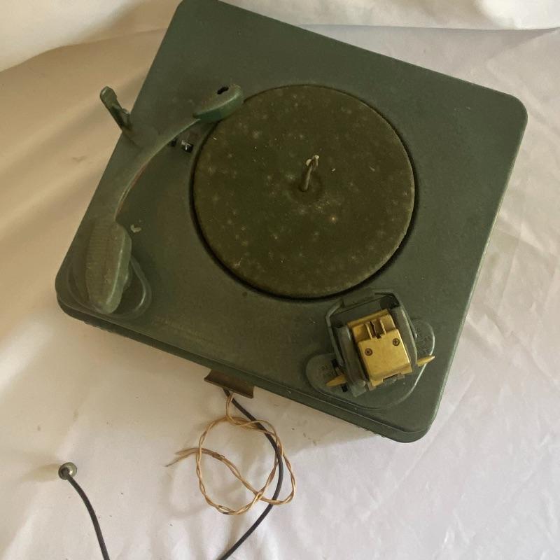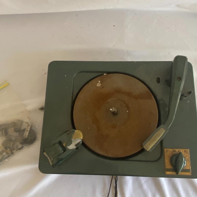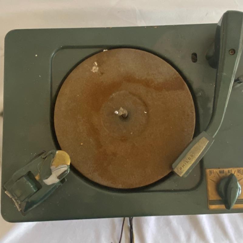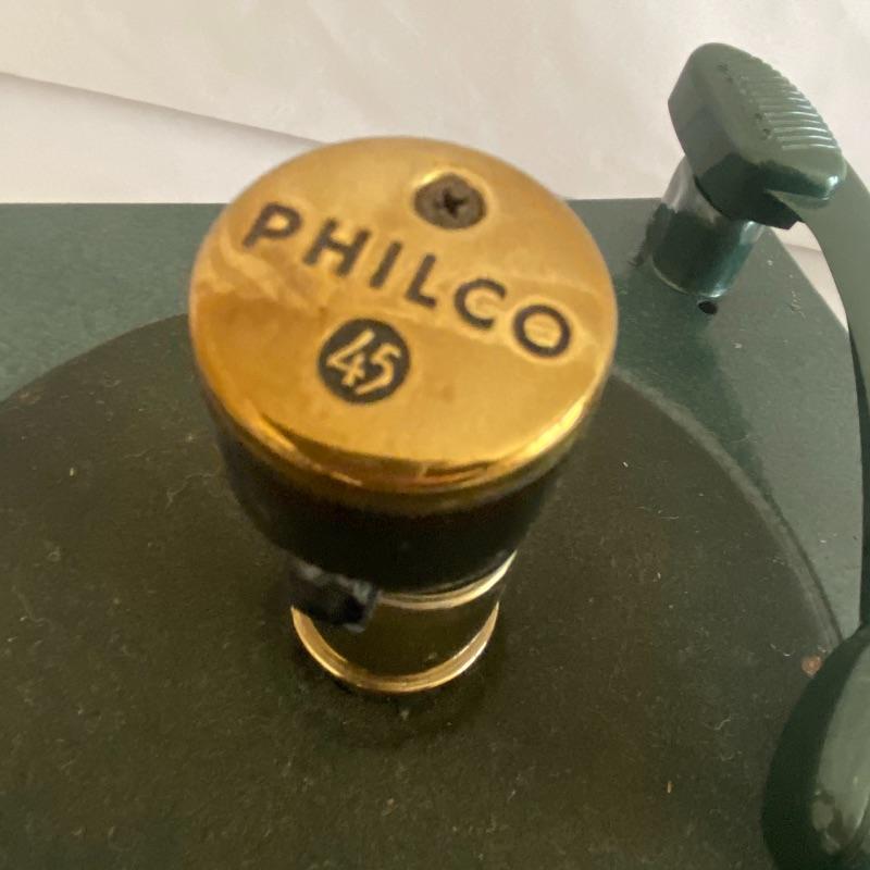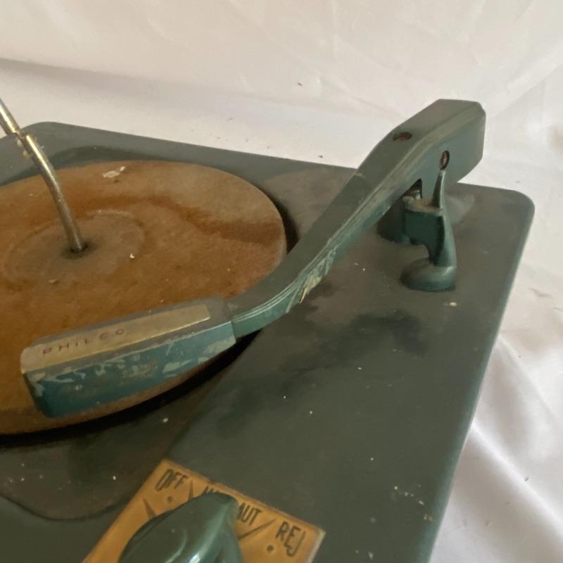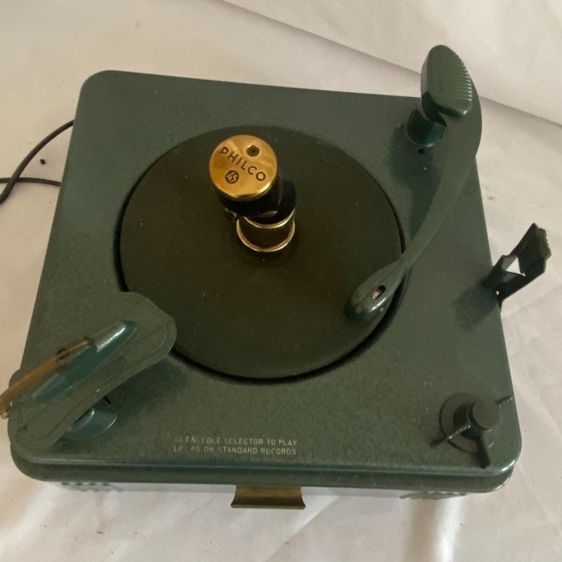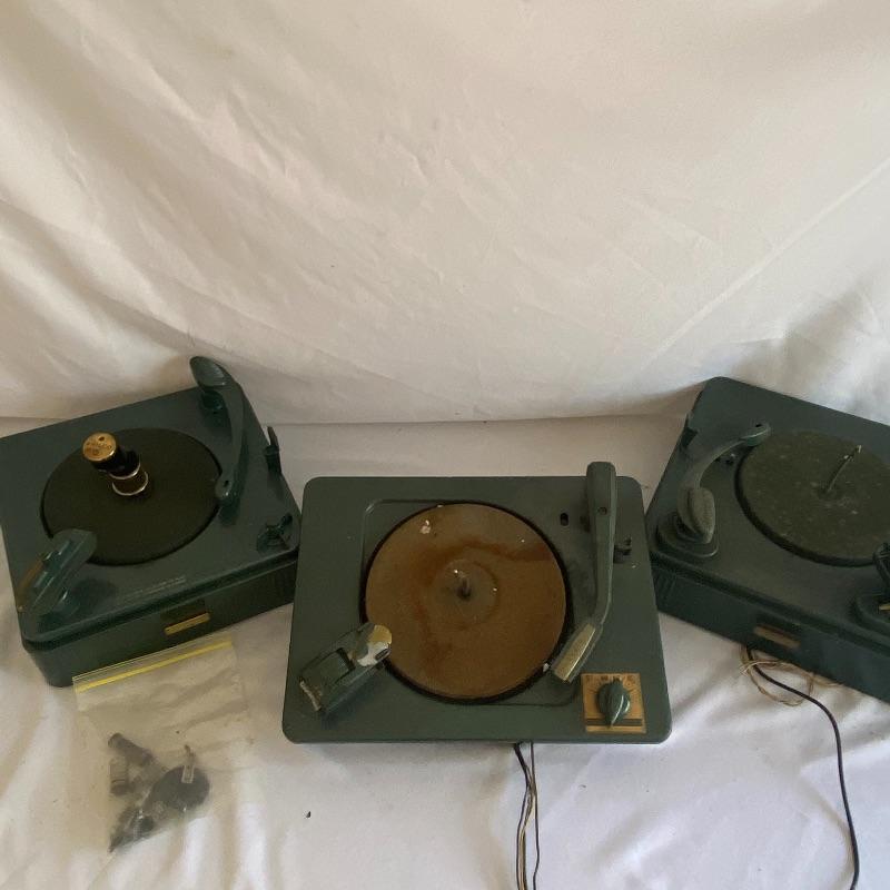 Incredible lot includes three green Philco metal turntables. Powered on when tested. Cords and parts included. See photos.
