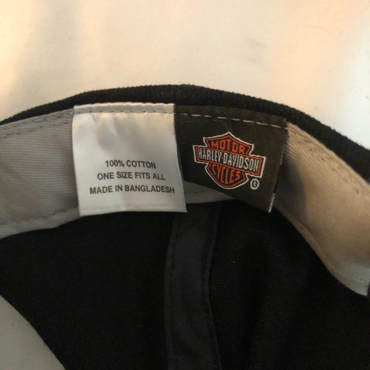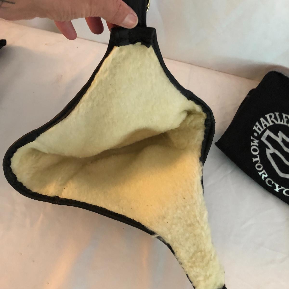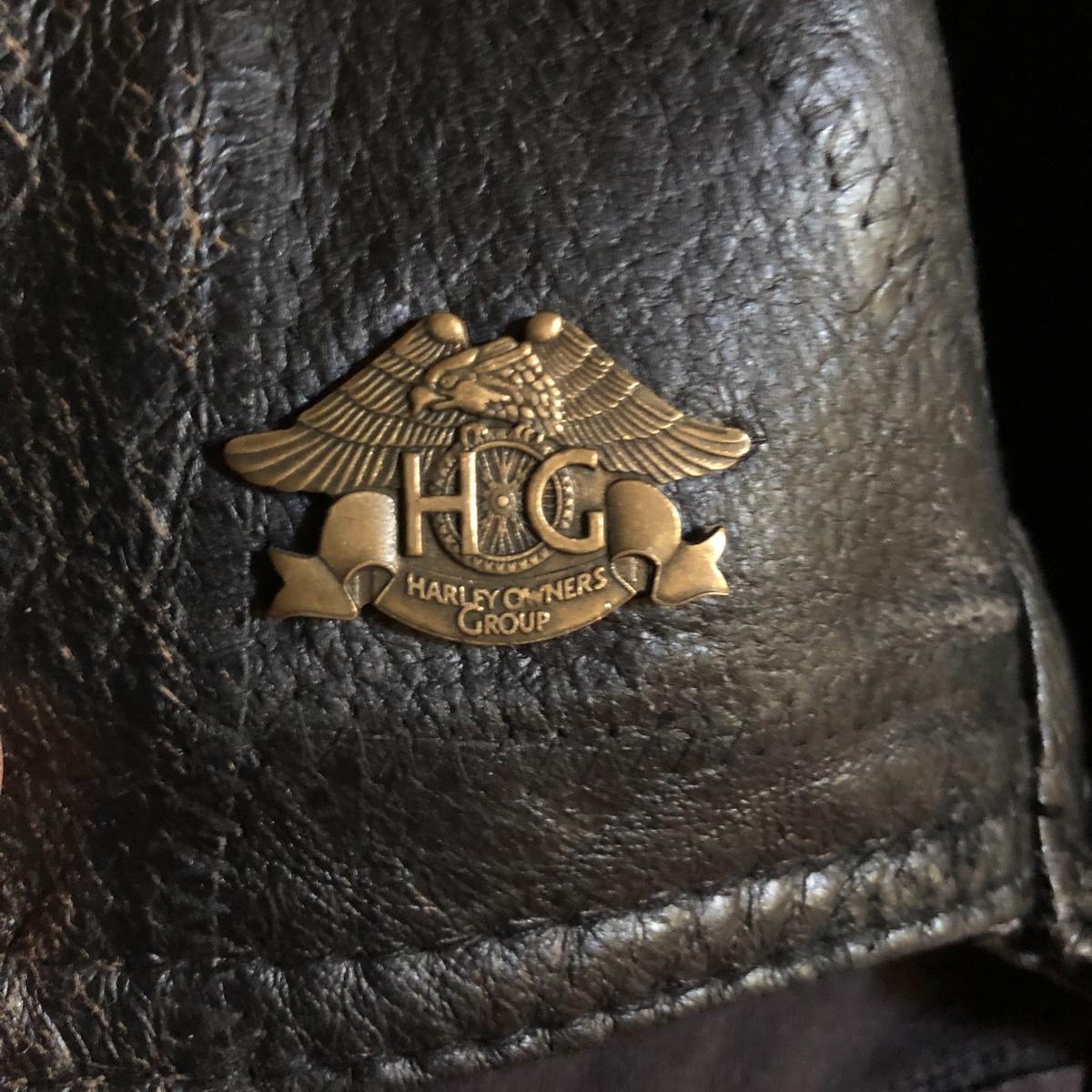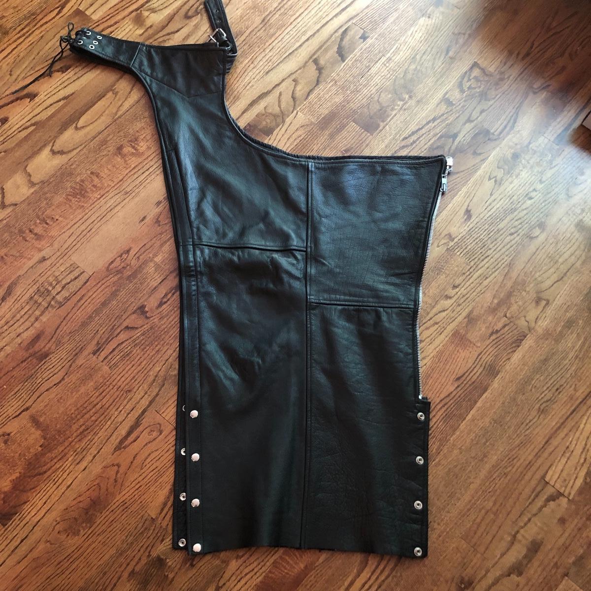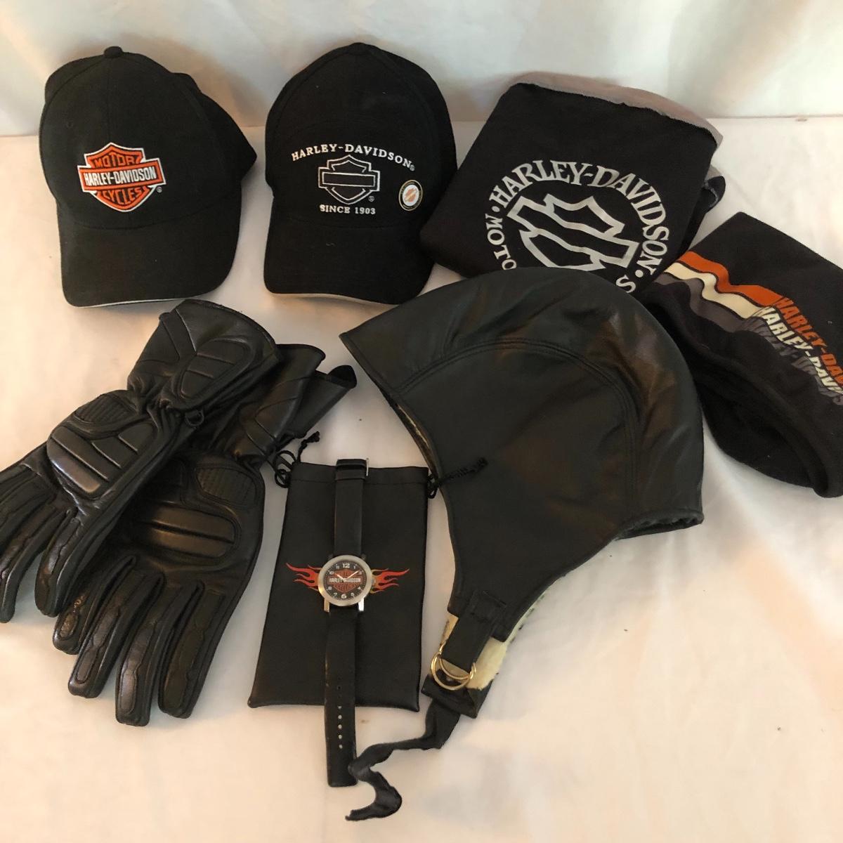 Bikers and Harley fans this amazing lot is for you! Lots of genuine leather items include a jacket, chaps and waistcoat along with a cool denim jacket plus baseball caps, helmet bag, balaclava and more. Sizes are shown in images, note that although the chaps say small, they fit on the small to medium size and they are adjustable to the waist, leg inseam measure 31” (42” from waistband to floor). The watch has a dead battery and is also missing the back. Caps are one size fits all, the sheepskin lined skull hat has no label for make, material or size. Leather jacket has a small area that is worn on the sleeve (last image).