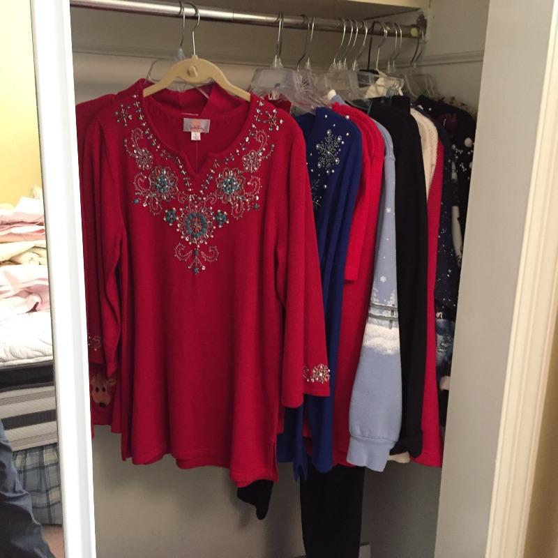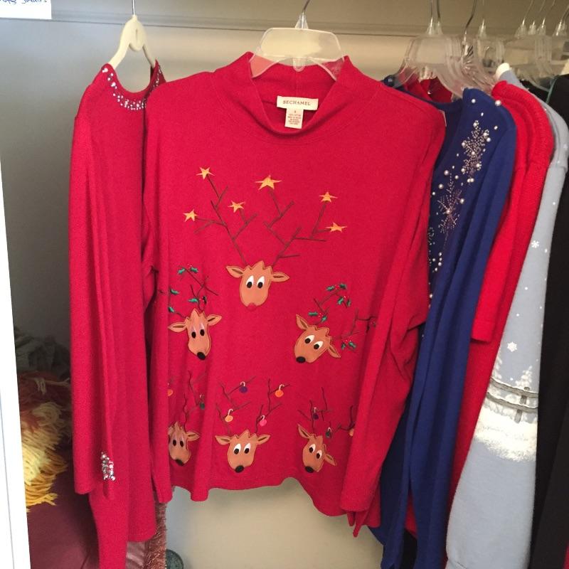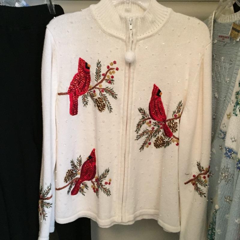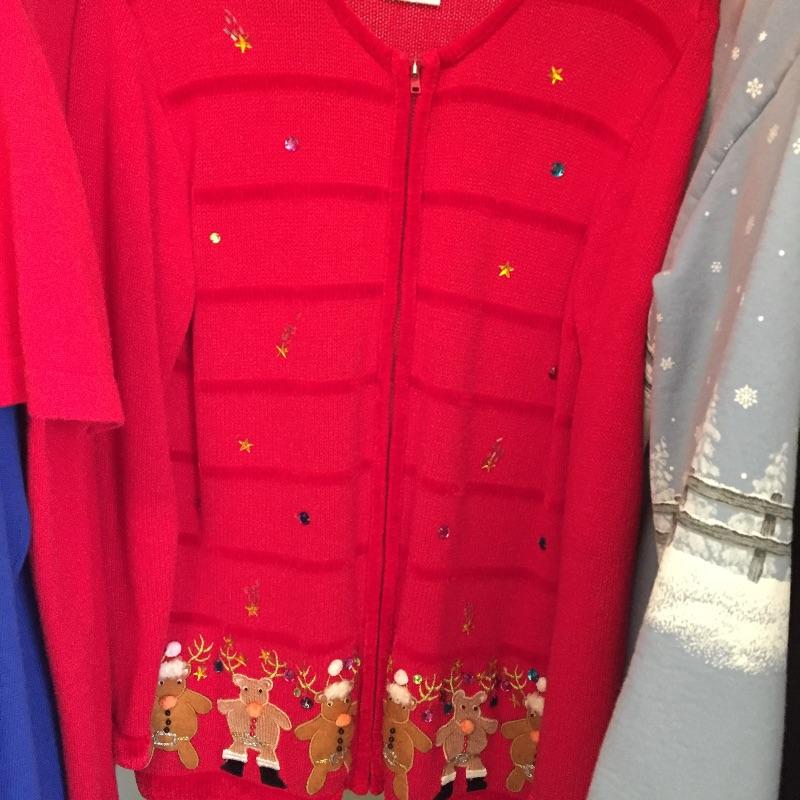 Just in time for the holidays, this large selection of mostly Christmas themed sweaters will surely get you in the festive spirit and give you so many choices for your holiday outfits. There are even a few Fall themed garments which includes a 100% leather jacket with pumpkins in size small. The sweaters are a mix of Small and medium sizes.