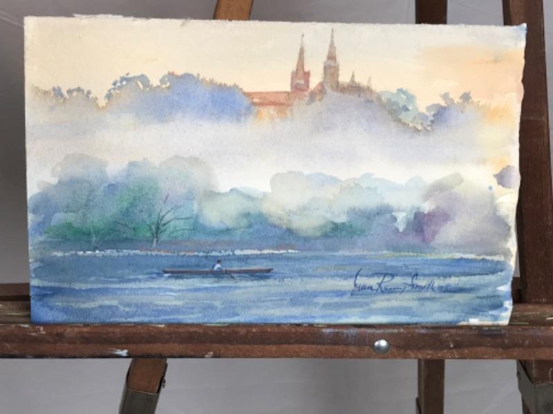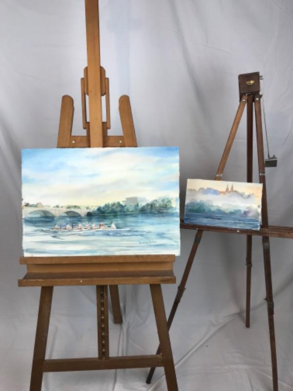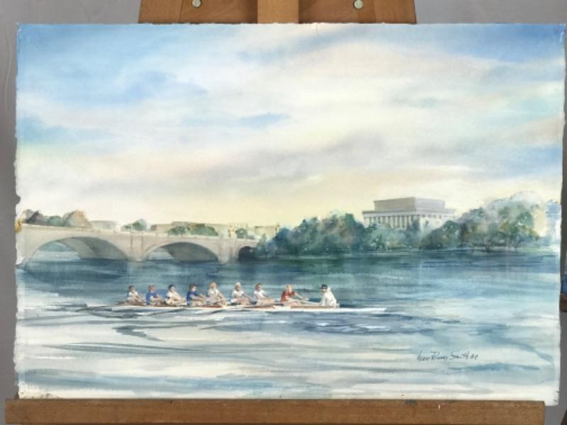 Pair of Jean Ranney Smith signed original watercolor paintings “Row Team” measures 23”x16”, “Single Rower “ measures 11”x7”