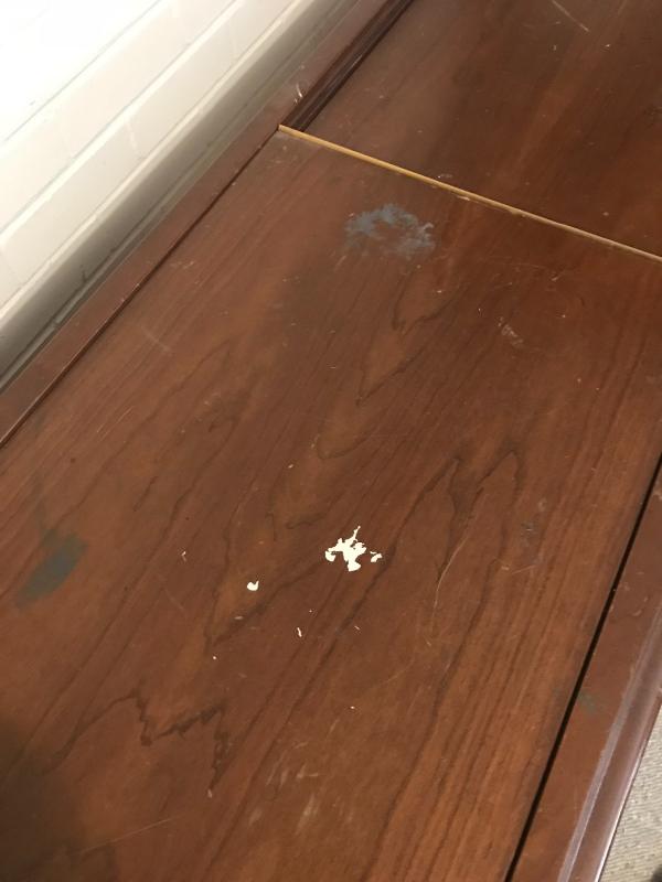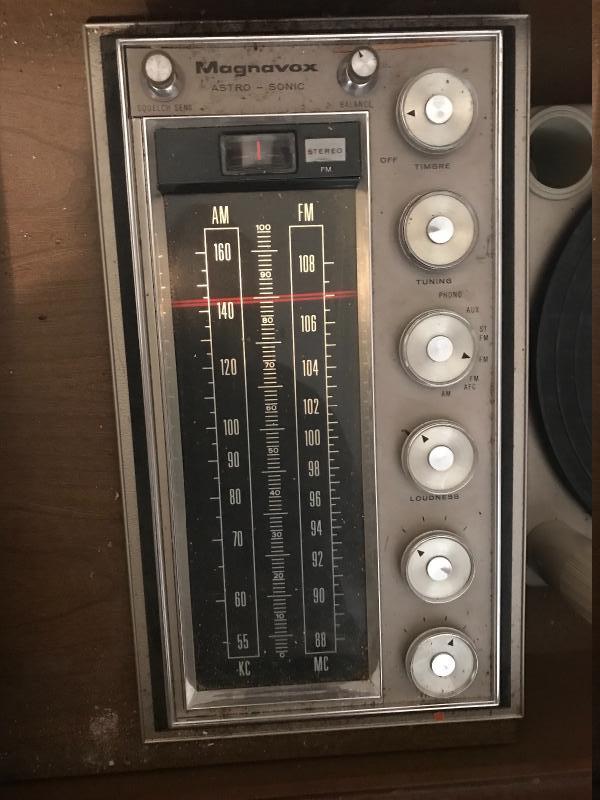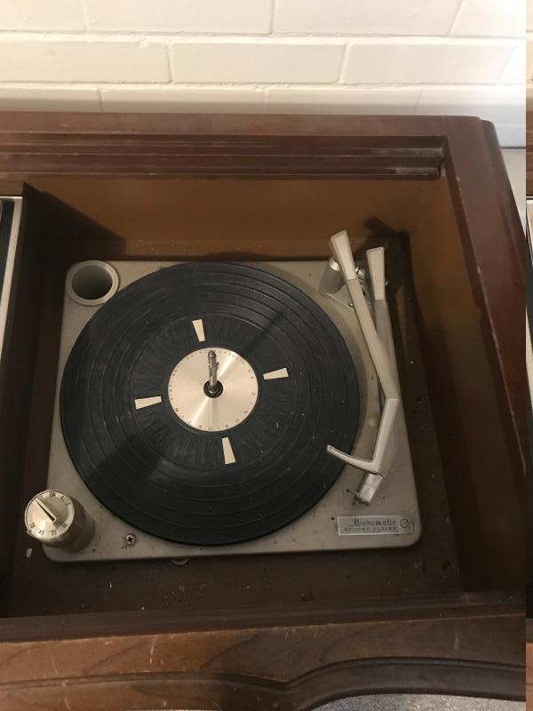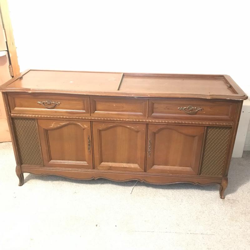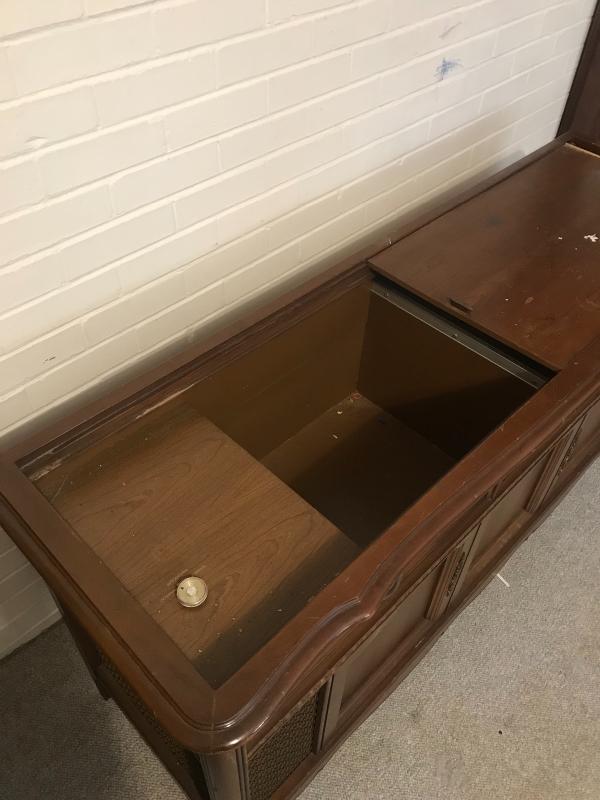 Substaintial piece measuring 60” x 19” x 29.5”. Unit turns on, though we could not find a channel. Radio and turntable only. We did not try turn table. Local pick up only. You will need help for loading.