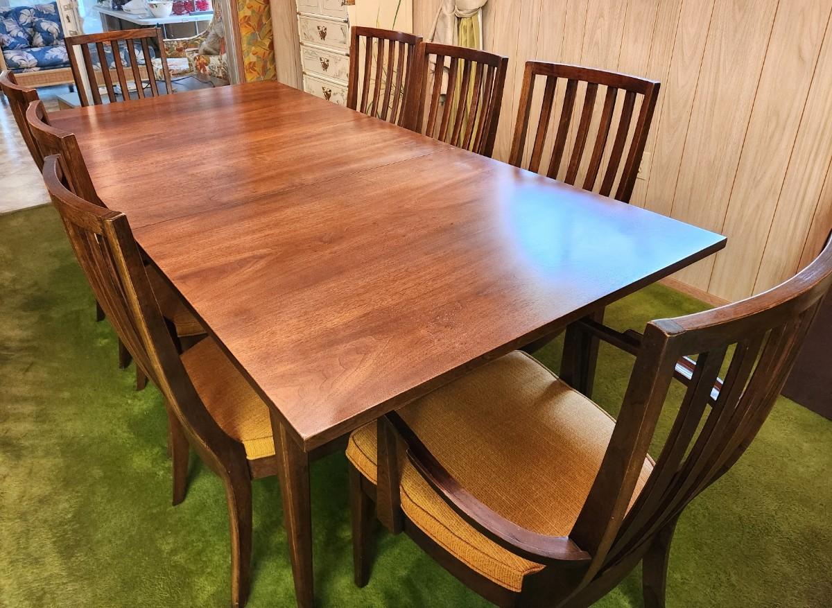 Classic MidCentury Modern Dining set in excellent condition that would still go well with today's decor. 6 side chairs, 2 armchairs - custom table pad set, 1 leaf. When fully extended, table is 7 feet long. Leaf is 18" long. Table 40" across, - 8 people can dine very comfortably. Really outstanding condition.