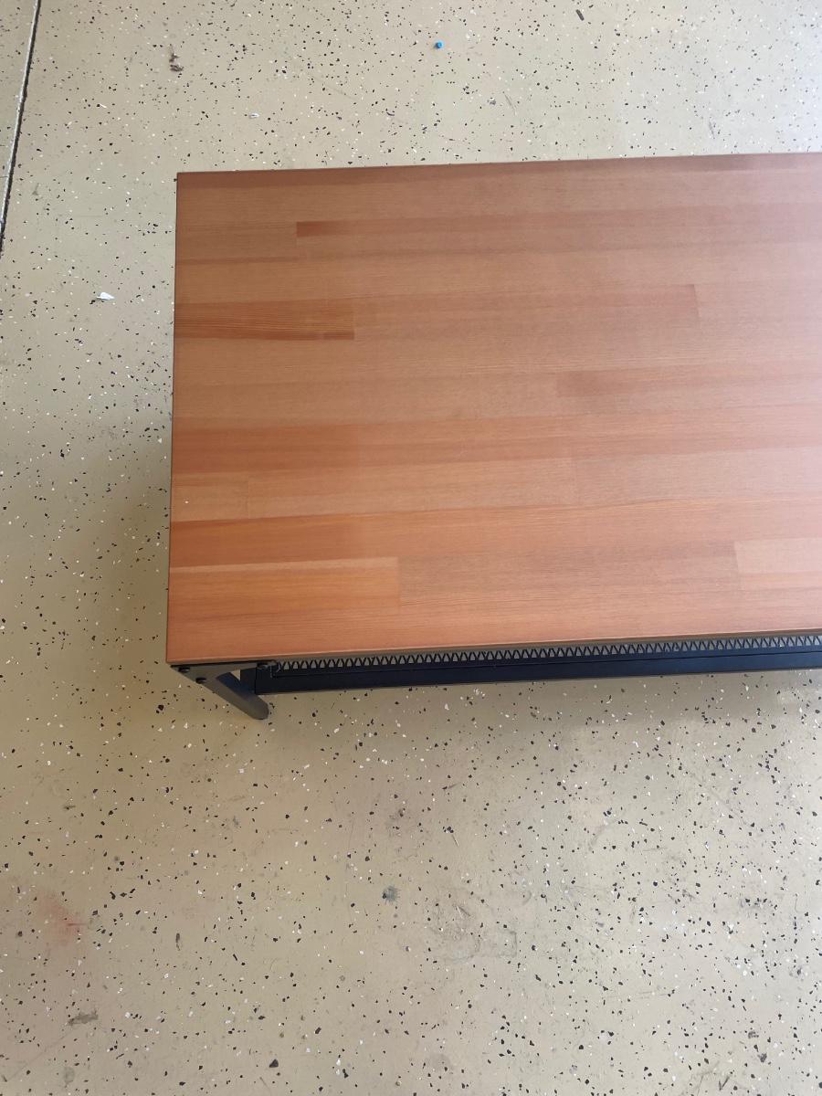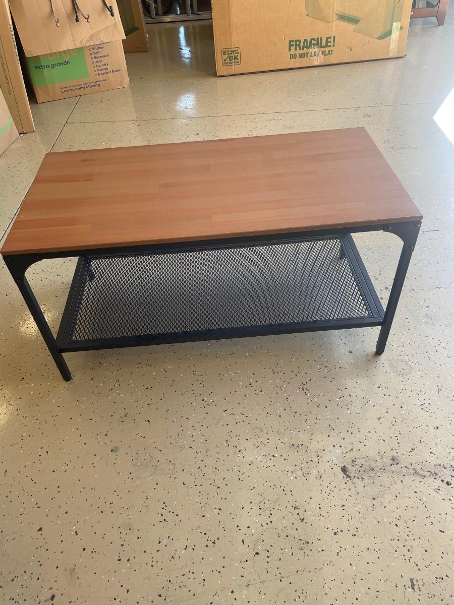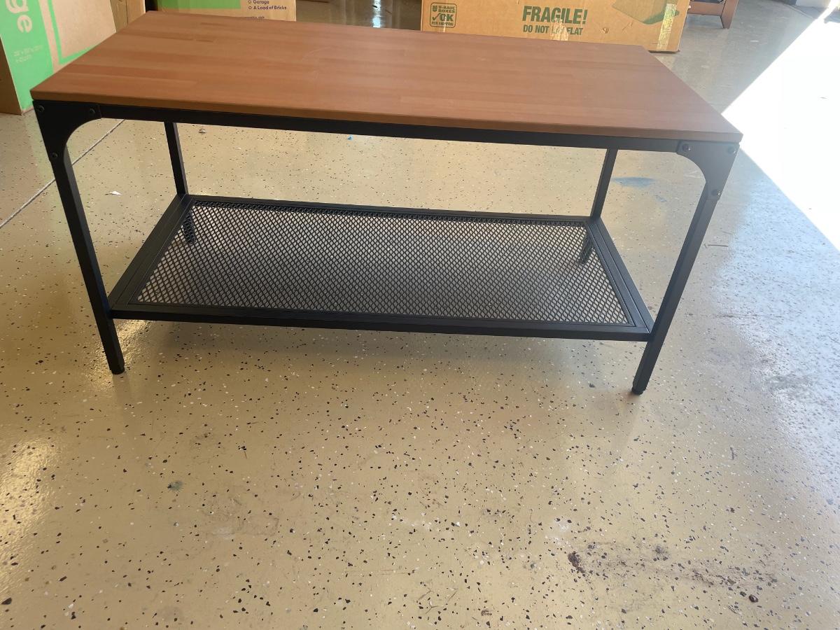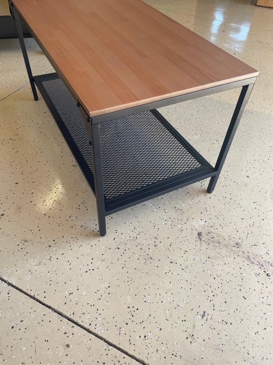 coffee table style with wood top and metal frame. Suitable for outdoors