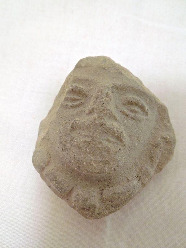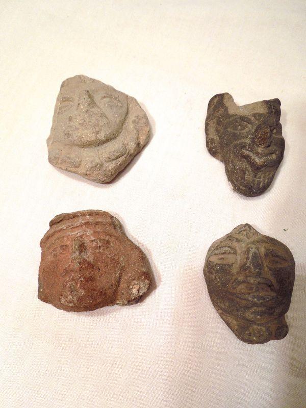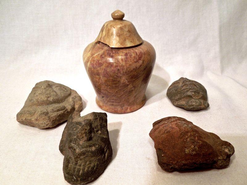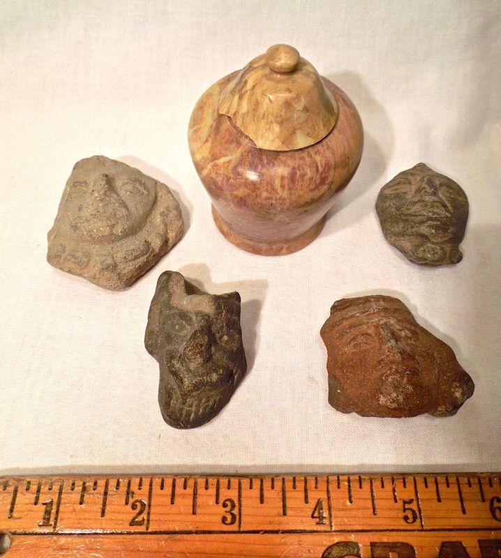 Reproduction pottery shards with greek God inspired faces; a stone ginger shaped jar with chipped lid.