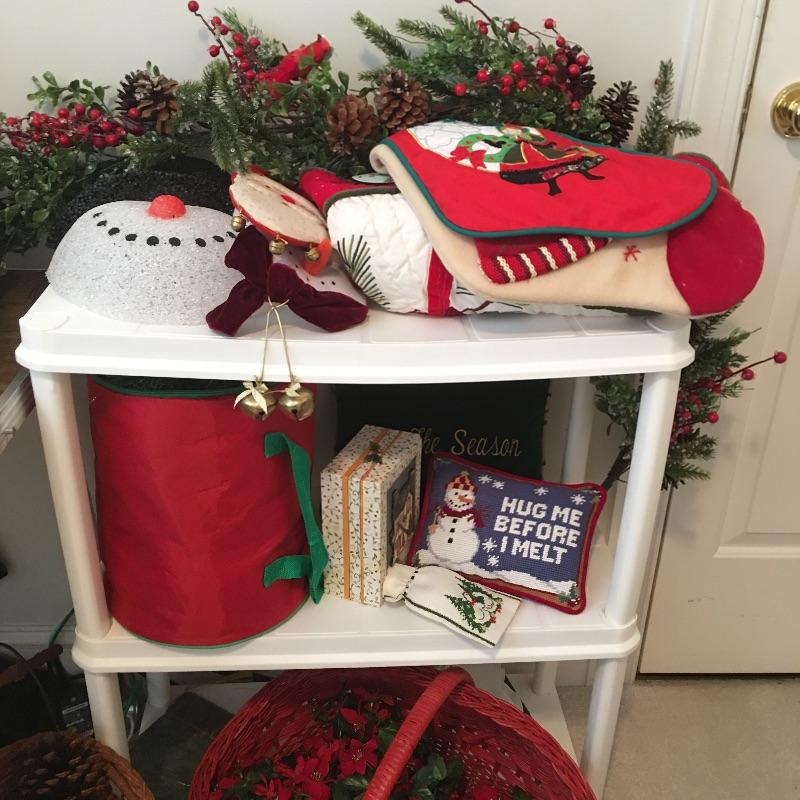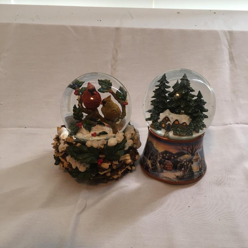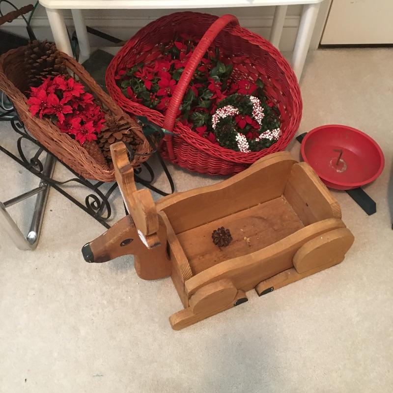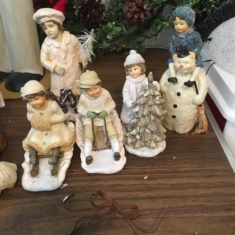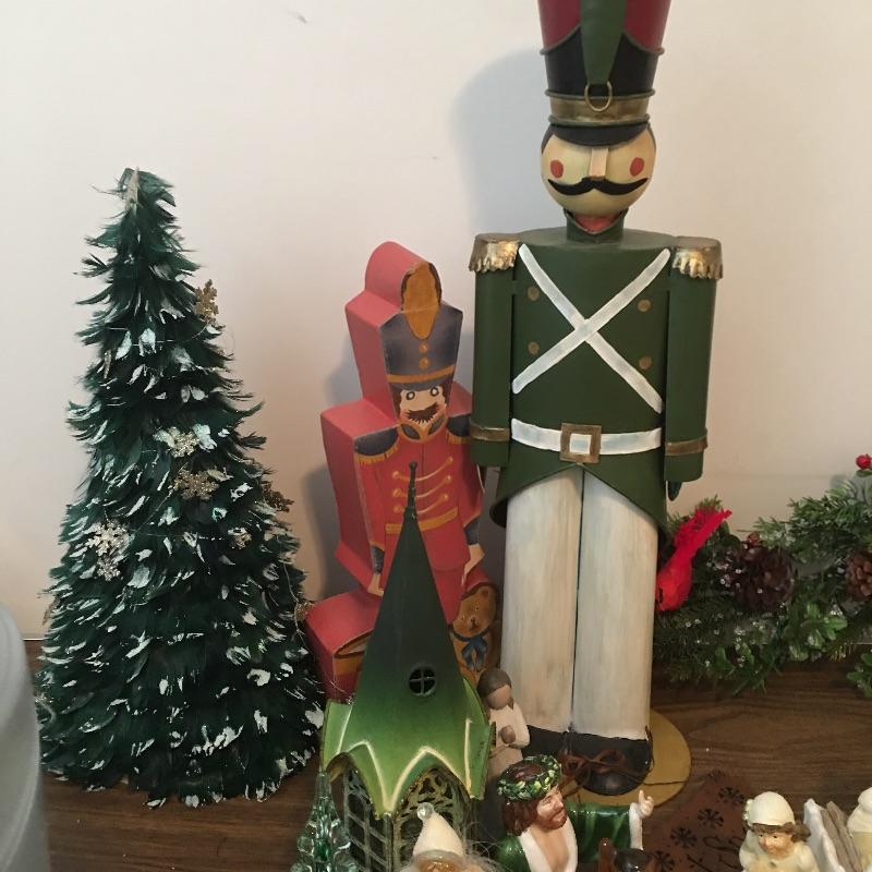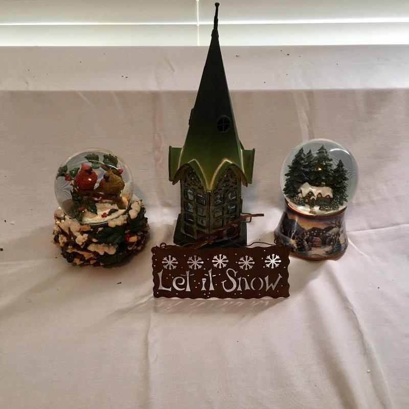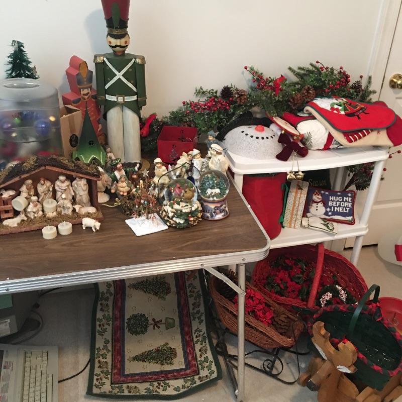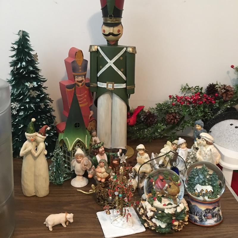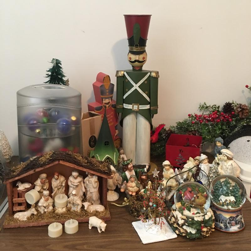 Oodles of Christmas decorations includes pair of musical snow globes, lights, small pillows, baskets, deer box, nativity scene, ornaments, stockings, large decorative nut cracker, welcome mat and more.
