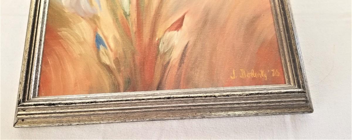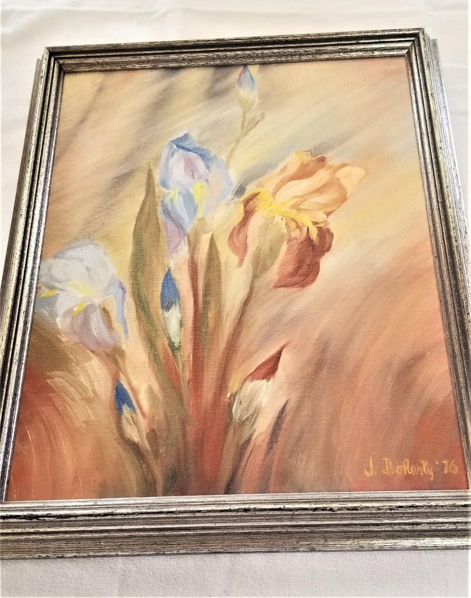 Sweet original oil on canvas, signed J. Doherty '76 - measures 12.5" x 15.5". Louisiana Iris - well executed. Good condition.