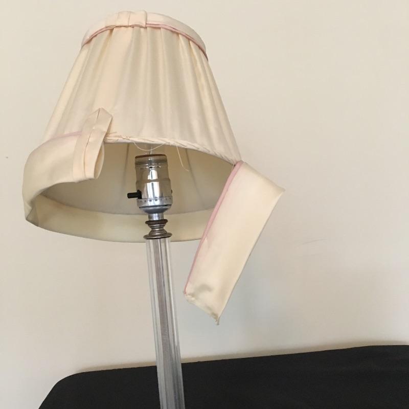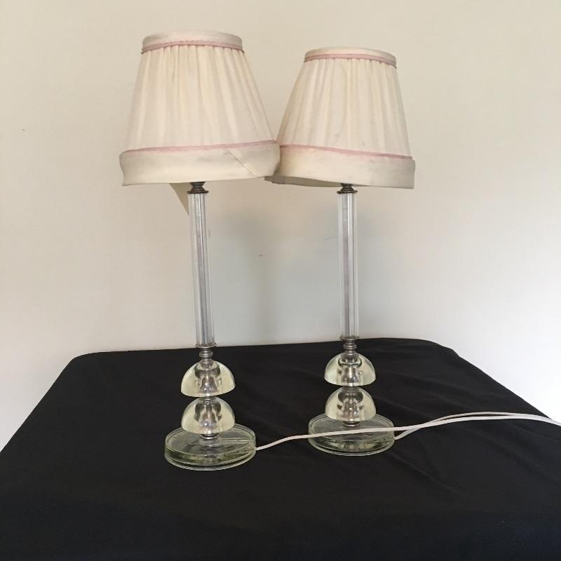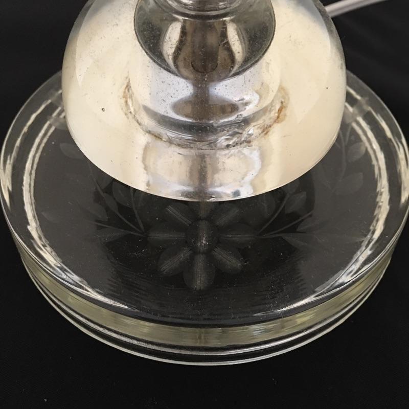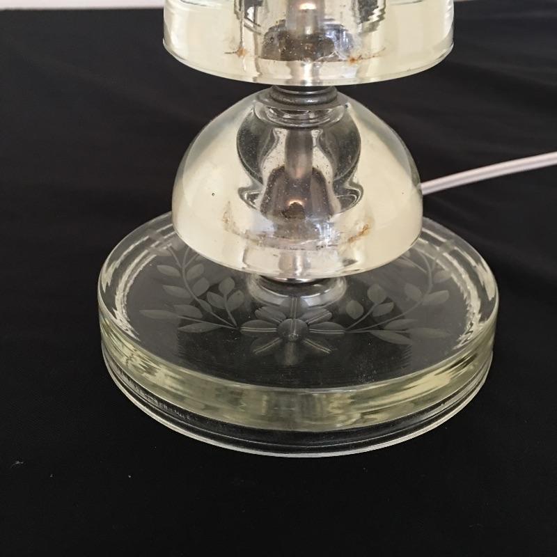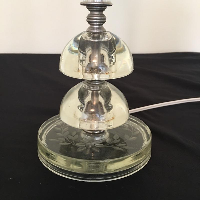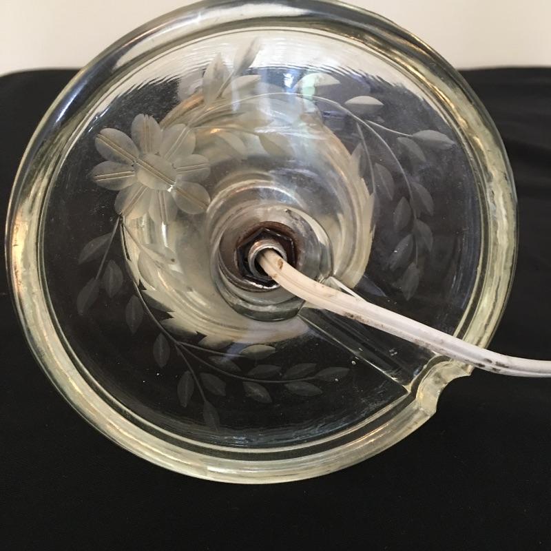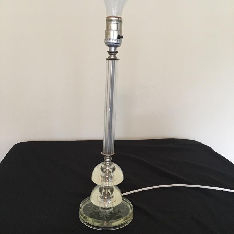 This pair of matching lamps have a floral design etched on base and is glass on the base while the long narrow piece appears to be plastic. Both lamps worked when tested. Lamps measure 4.75”D x 20” tall without shades.