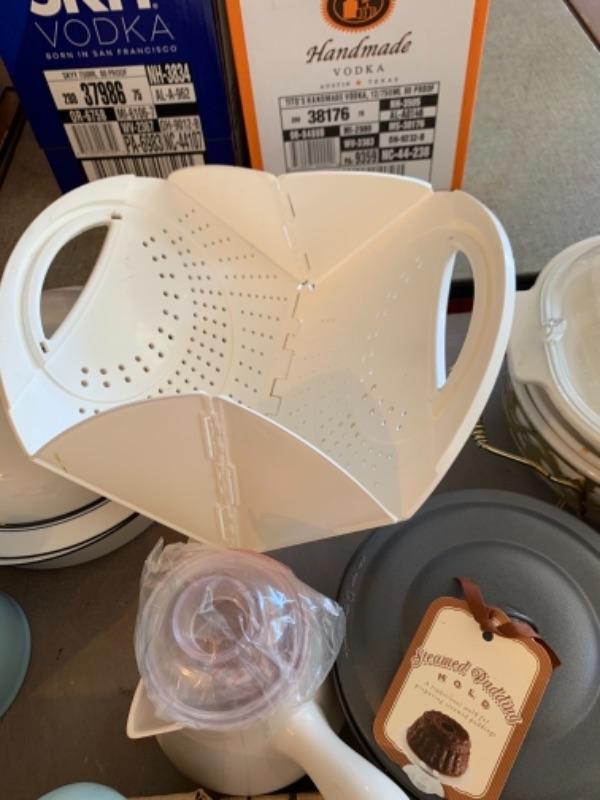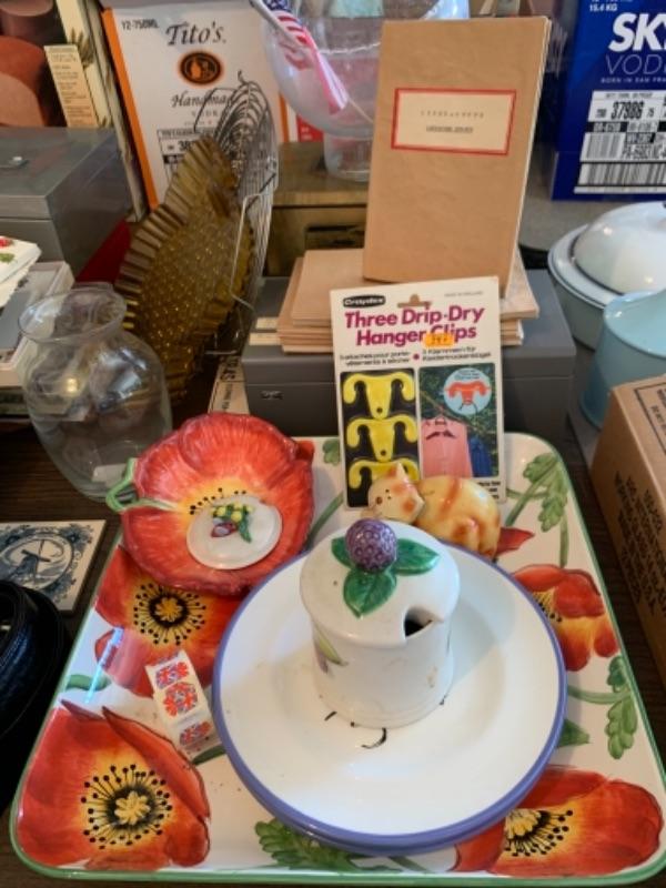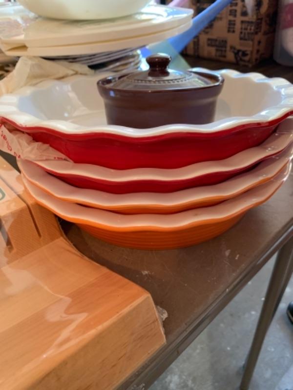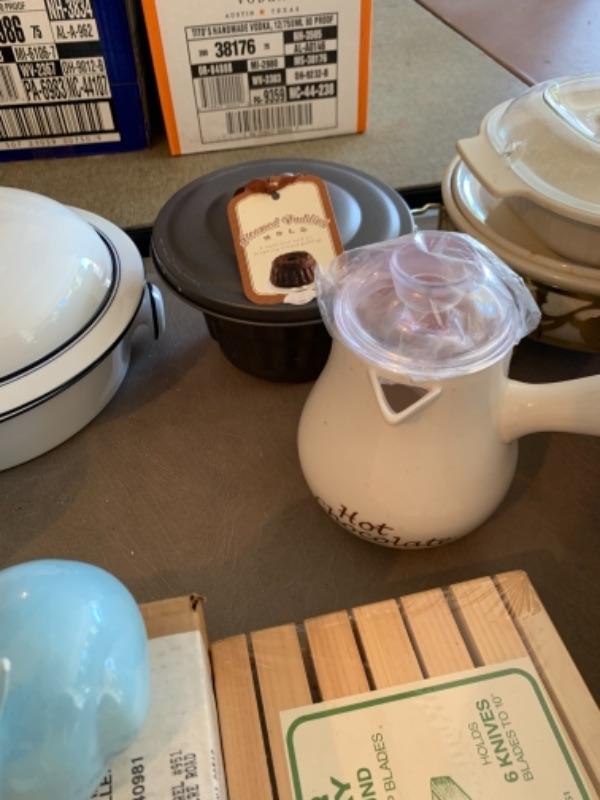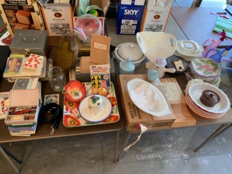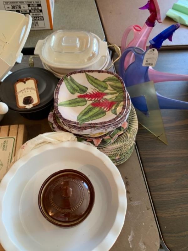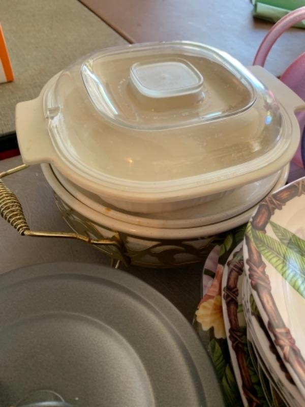 Lot 138. Plastic plates, French glass jars, ceramic cookware, boxes, trays, casserole, brass trinket box, cookware, vintage stationery, lock boxes, and vintage Bauer casserole in holder--$125