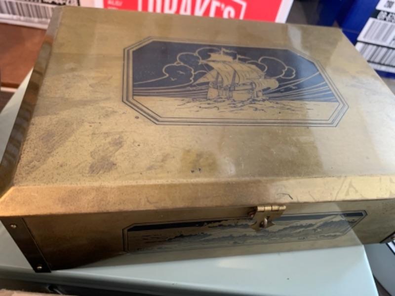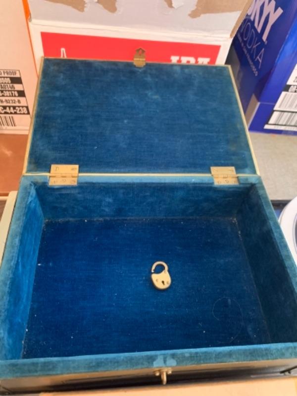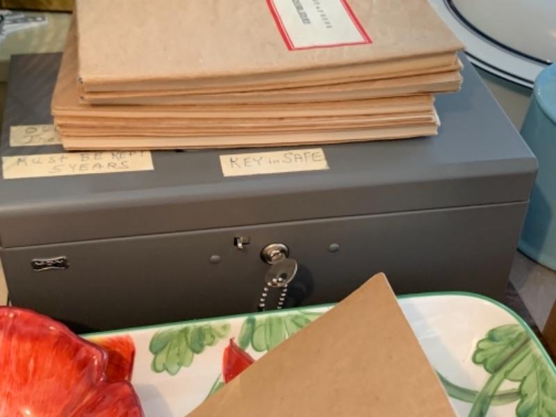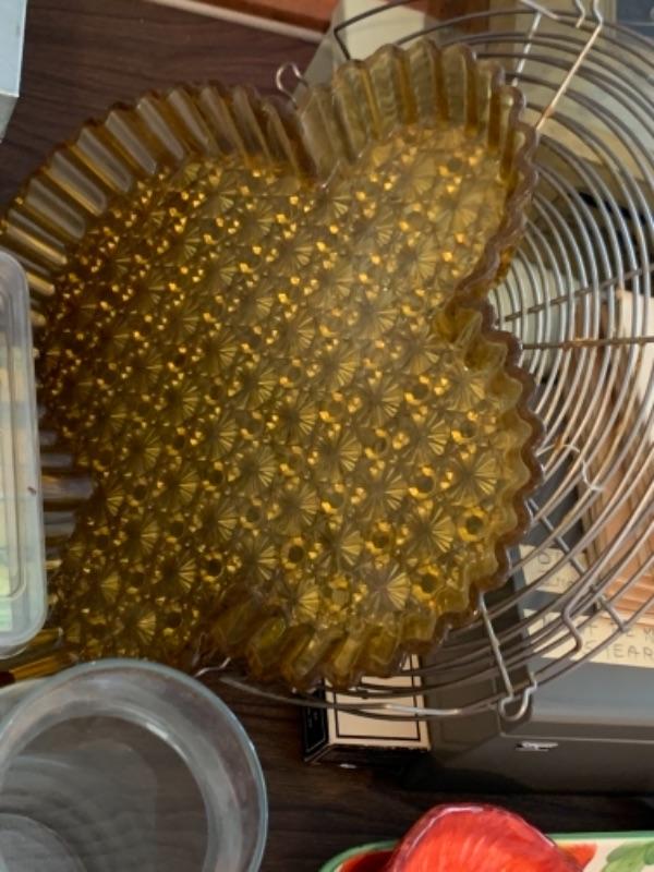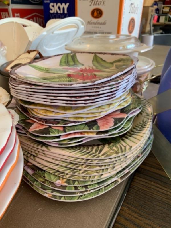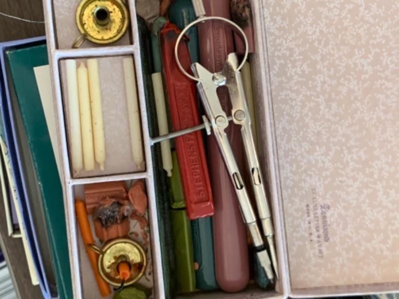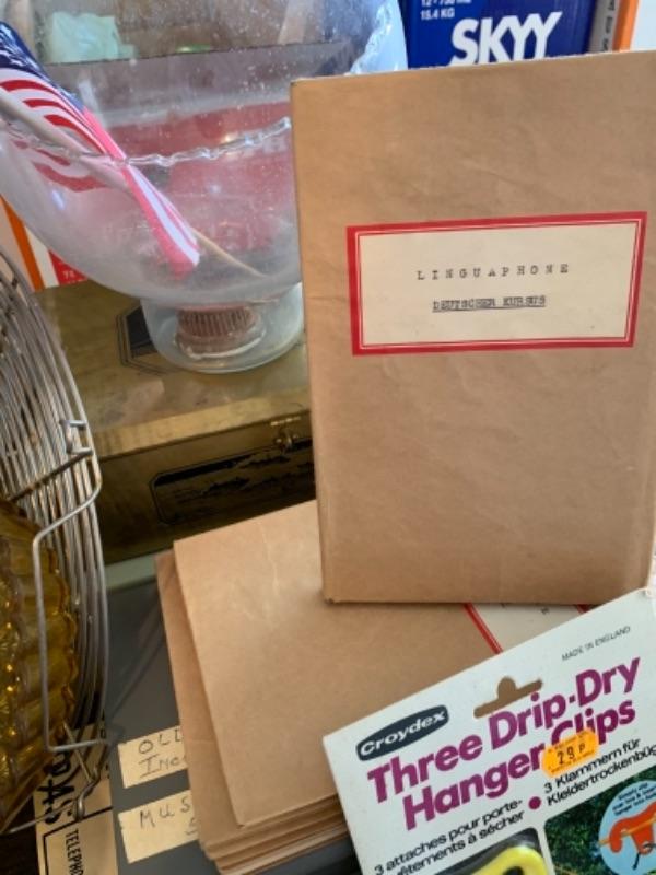 Lot 138. Plastic plates, French glass jars, ceramic cookware, boxes, trays, casserole, brass trinket box, cookware, vintage stationery, lock boxes, and vintage Bauer casserole in holder--$125