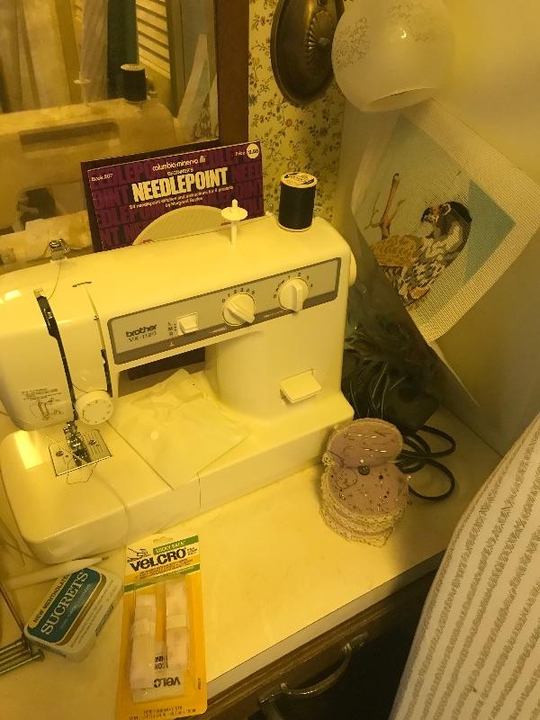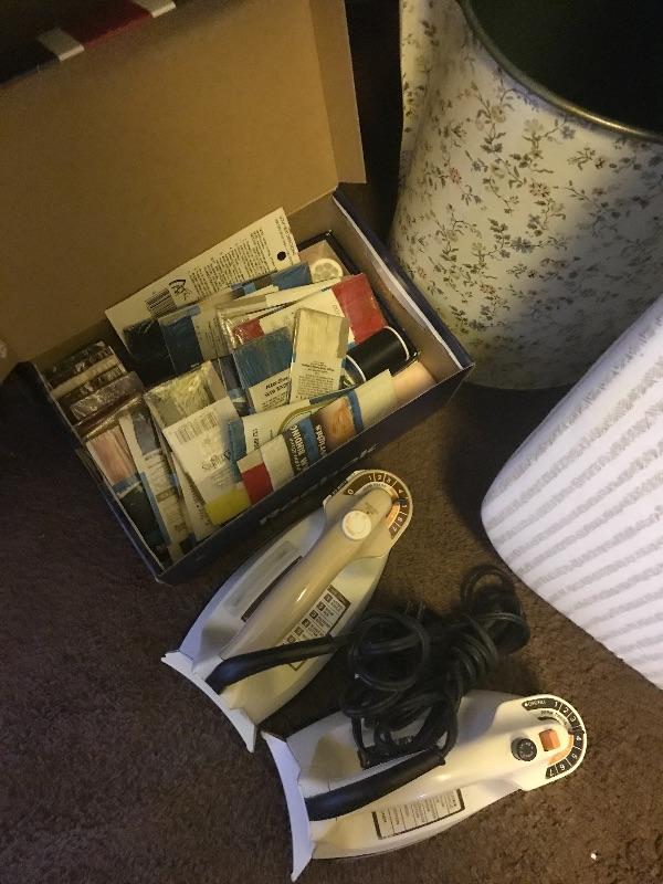 This lot consists of a Sewing box, Brother VX-1120 sewing machine, thread, needles, knitting supplies, ironing board, with two irons and a lot more