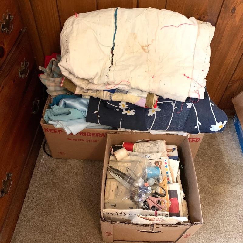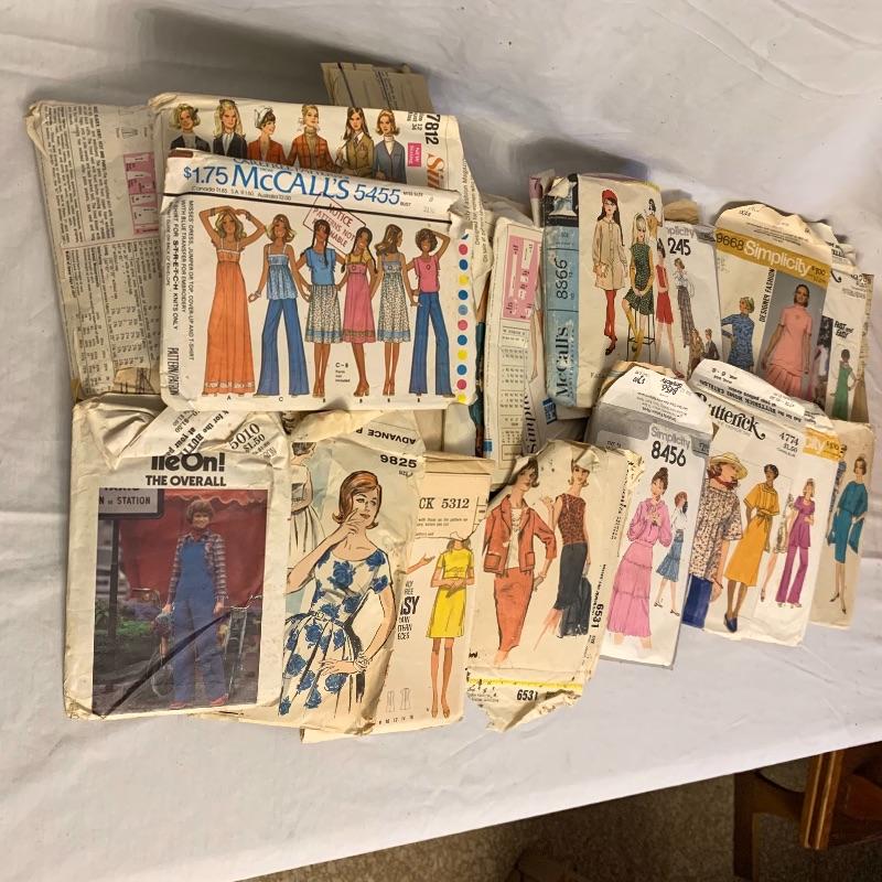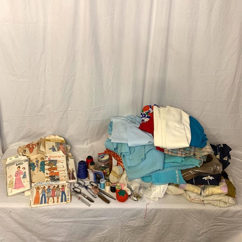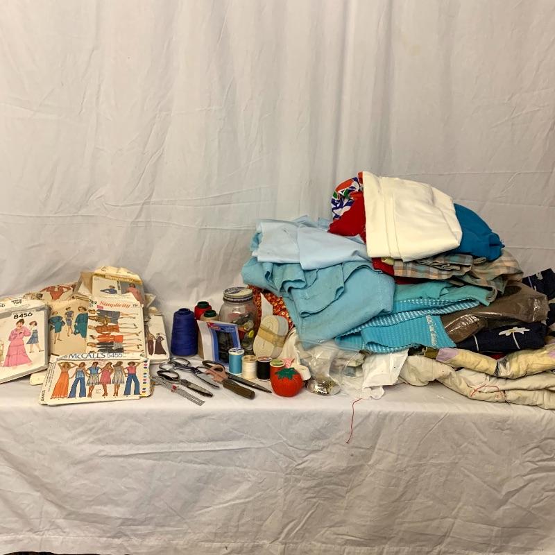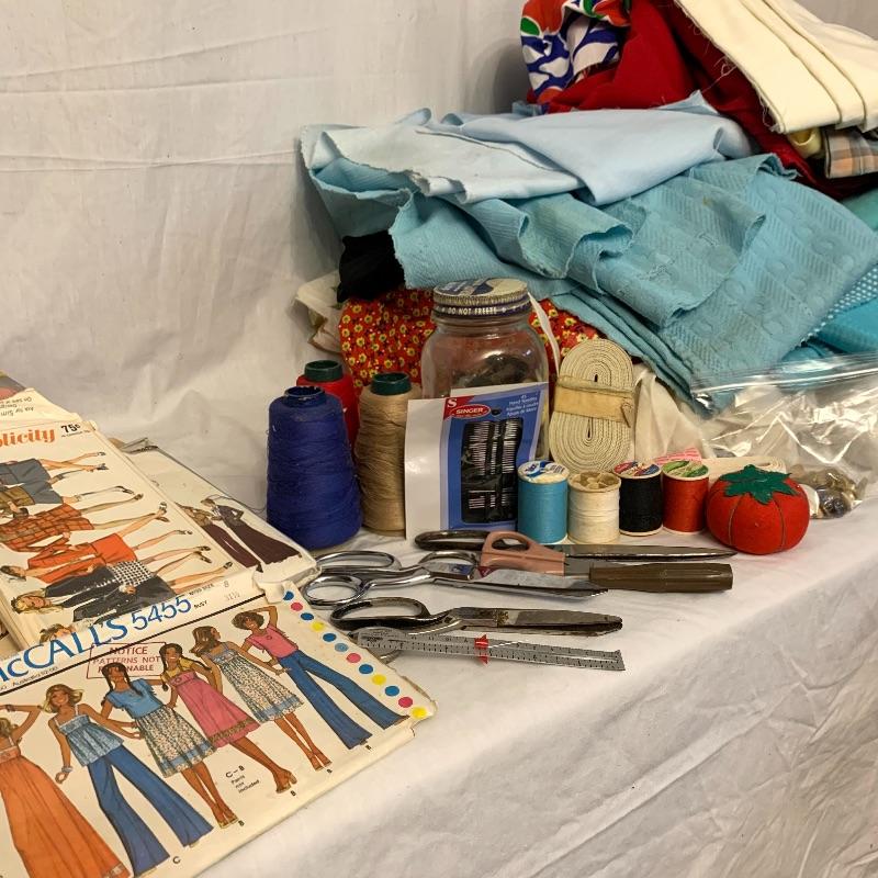 Sew some beautiful vintage style dresses with all the supplies found in this crafty lot! There are many sewing notions and supplies including scissors, thread, buttons, elastic, zippers, a tomato pin cushion, and more. There are also many patterns (Butterick, Simplicity, McCalls, etc.) for women’s clothing (and a few for girls clothing) and a large stack of various fabrics. There are some satiny fabrics, some floral, some plaids, some solids, and much more. There are also two unfinished quilts that you could finish or cut up to use the fabric for your own quilt. Local pickup only.