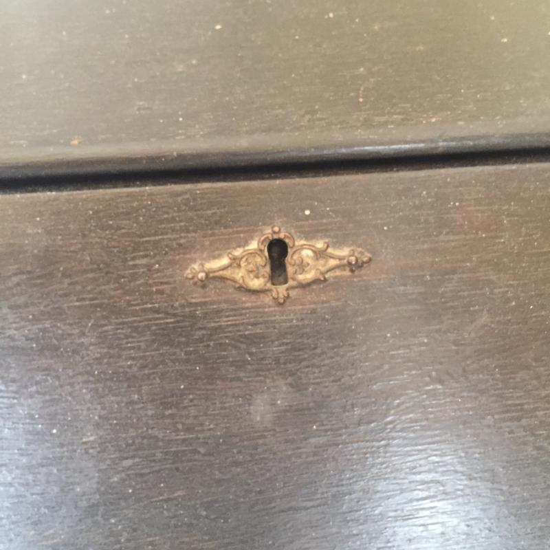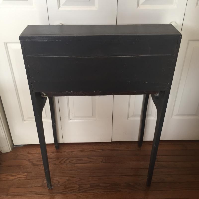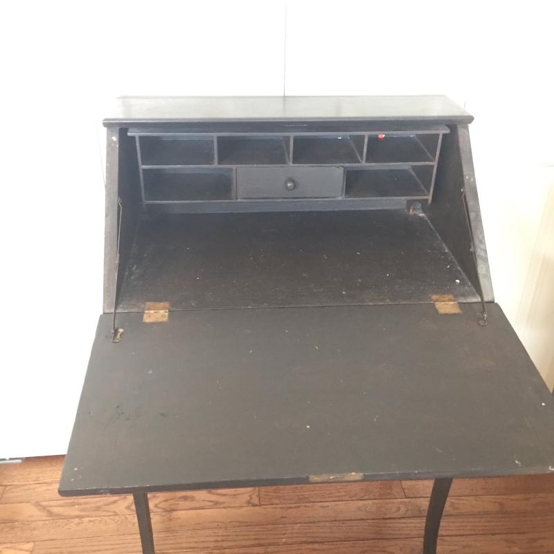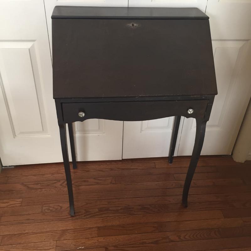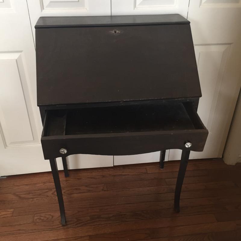 Enchanting small Vintage wood desk in Excellent shape. Key is missing. Desk Measures 26” x 15.5” 39” closed 26” x 28.5” x 39” open.
