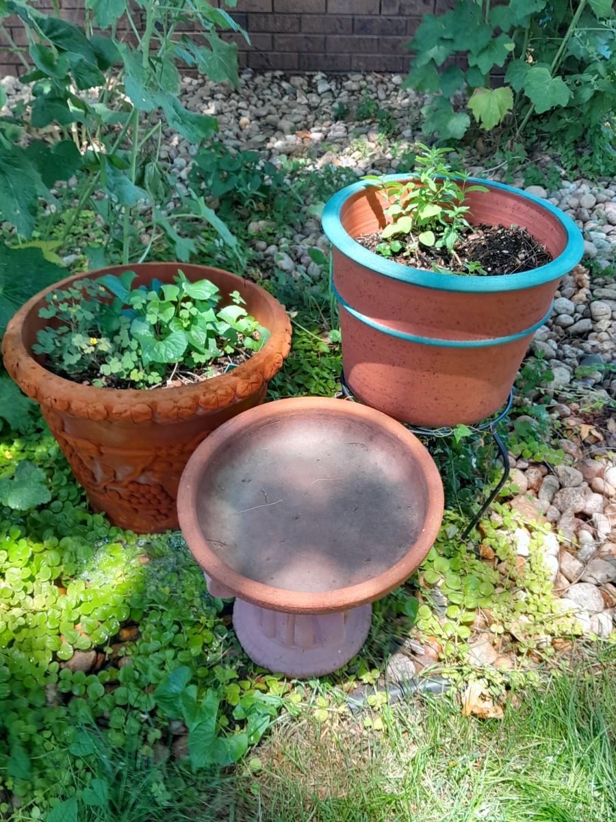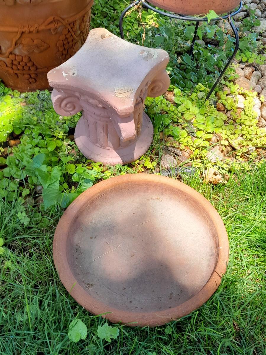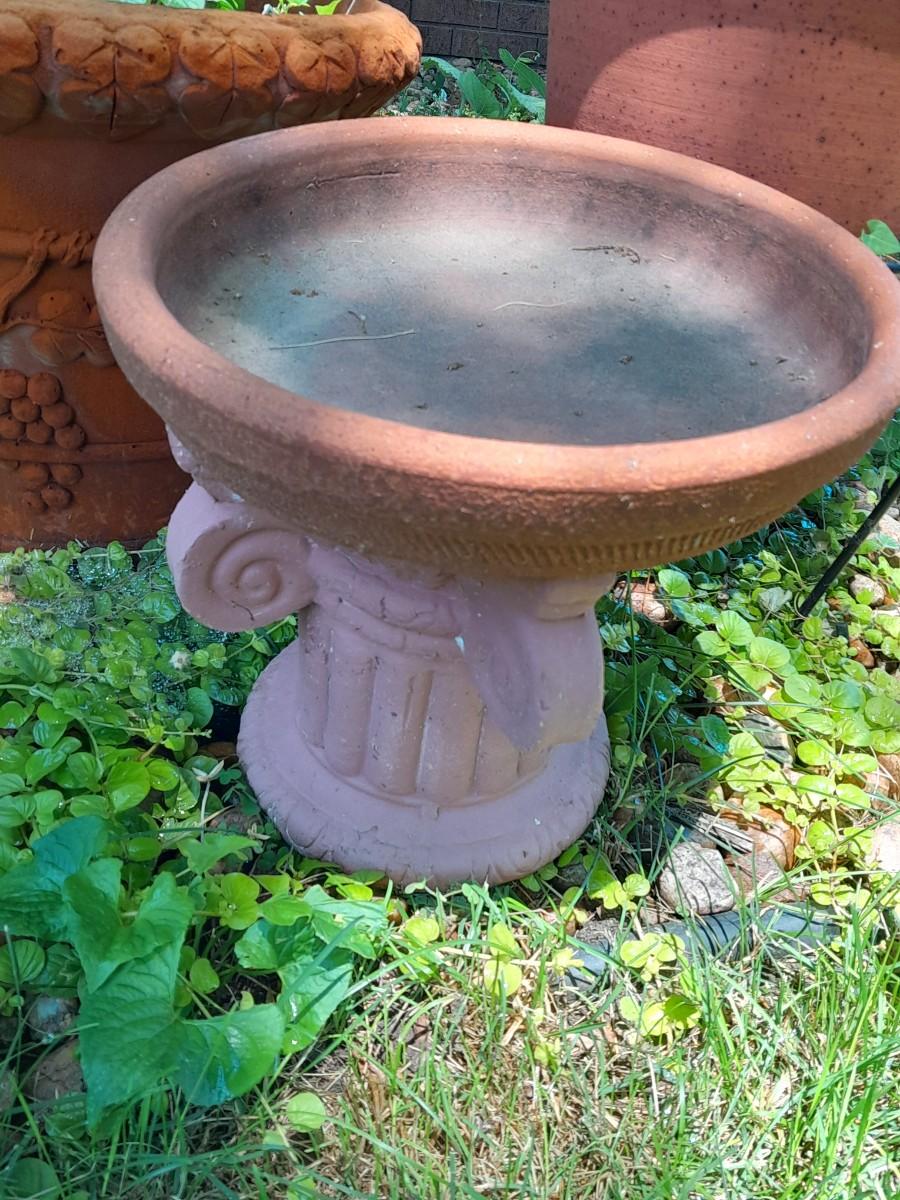 TWO LARGER SIZED FLOWER POTS, AND A TWO-PIECE SHORT FLOWERBED SIZED BIRD BATH / WATER BASIN.