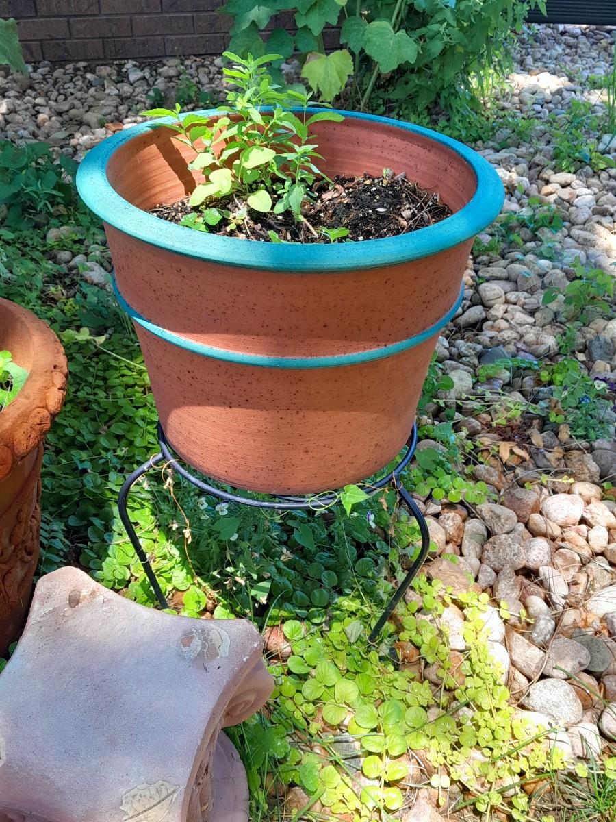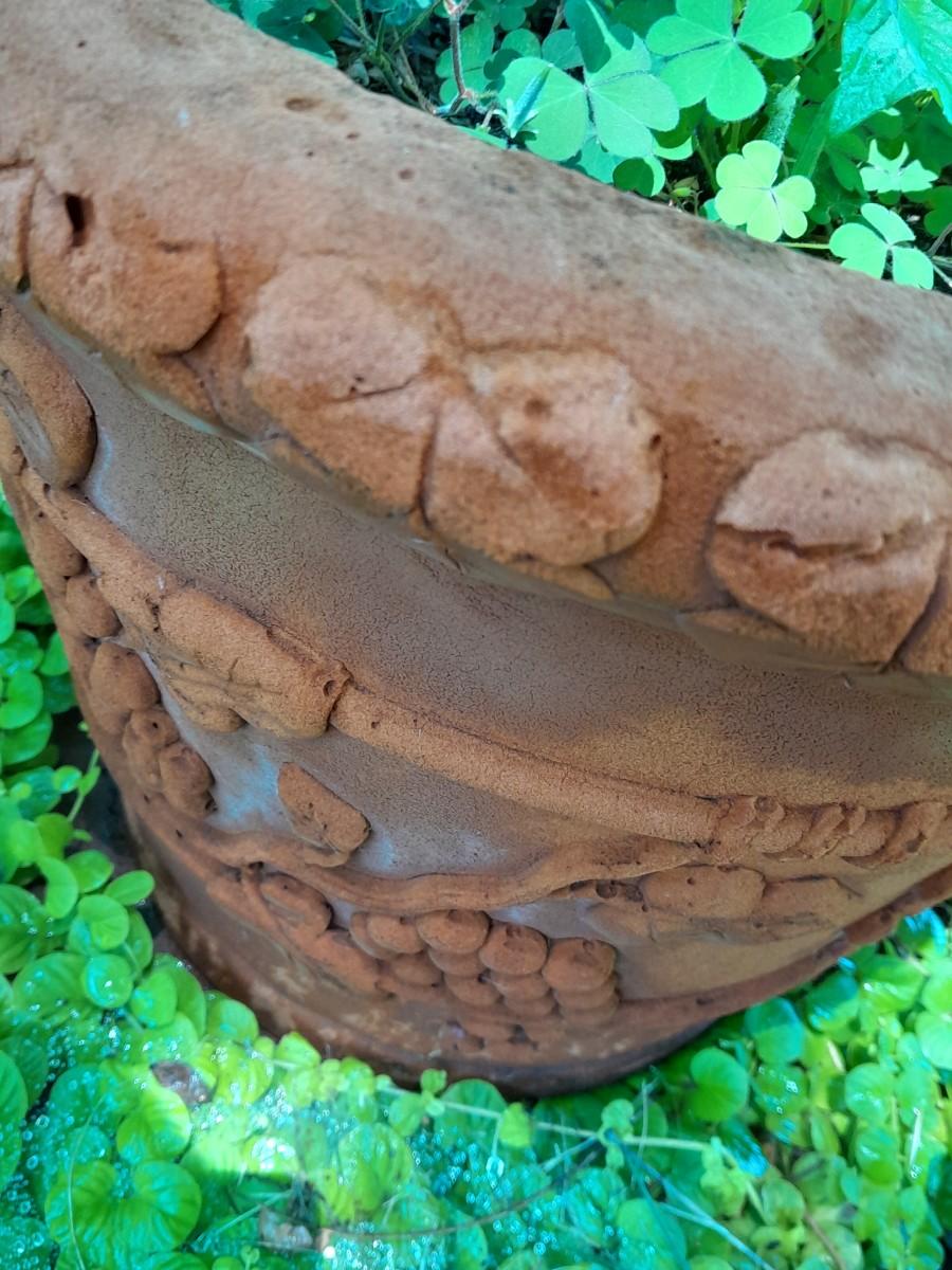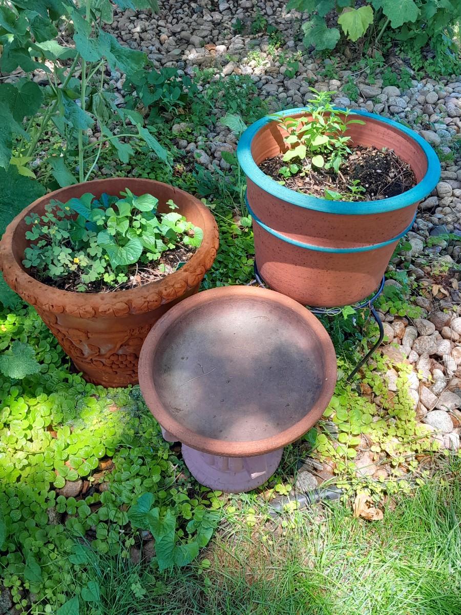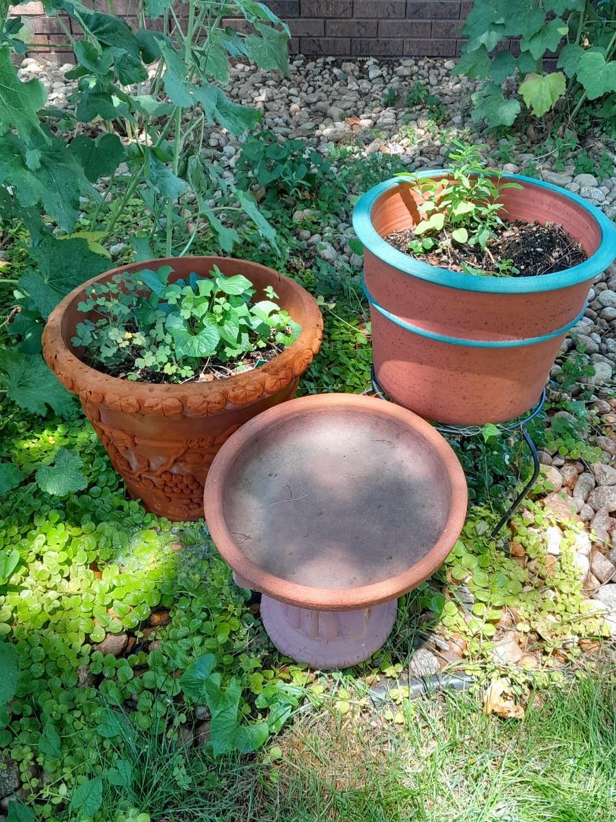 TWO LARGER SIZED FLOWER POTS, AND A TWO-PIECE SHORT FLOWERBED SIZED BIRD BATH / WATER BASIN.