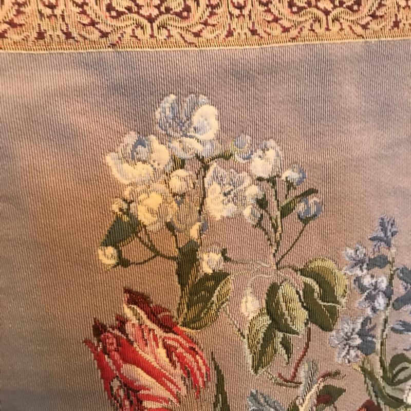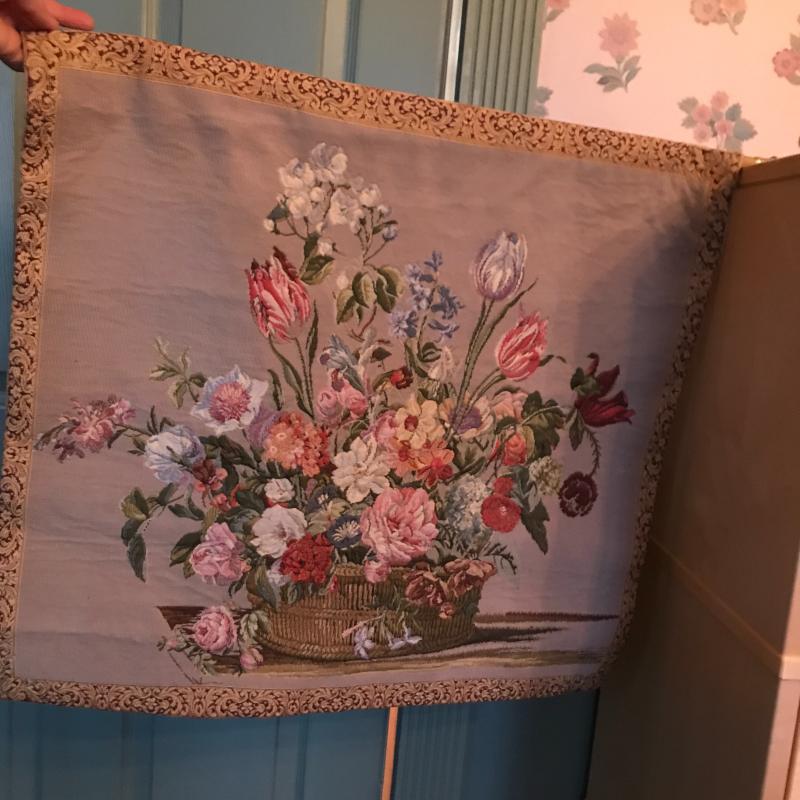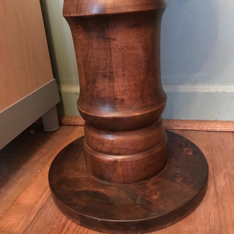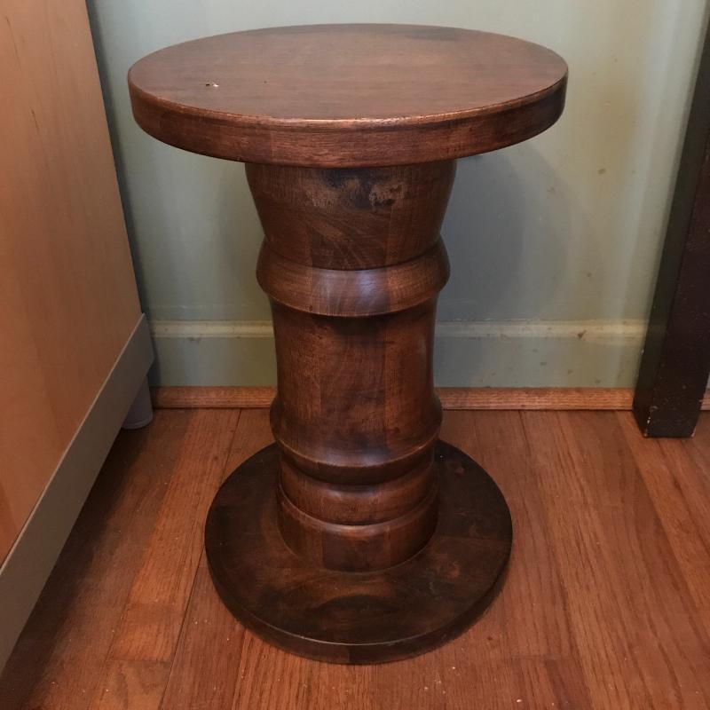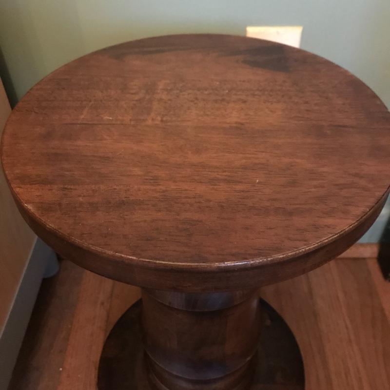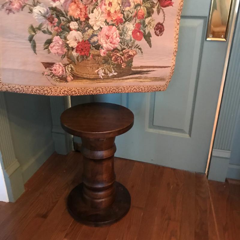 Cute stool or side table. Could also be used as a plant stand. Versatile piece has nice dark wood finish. Measures 12” diameter and 18” tall. Lot also includes fabric wall hanging with rod. No shipping. Local pick up only in Flat Rock, NC.