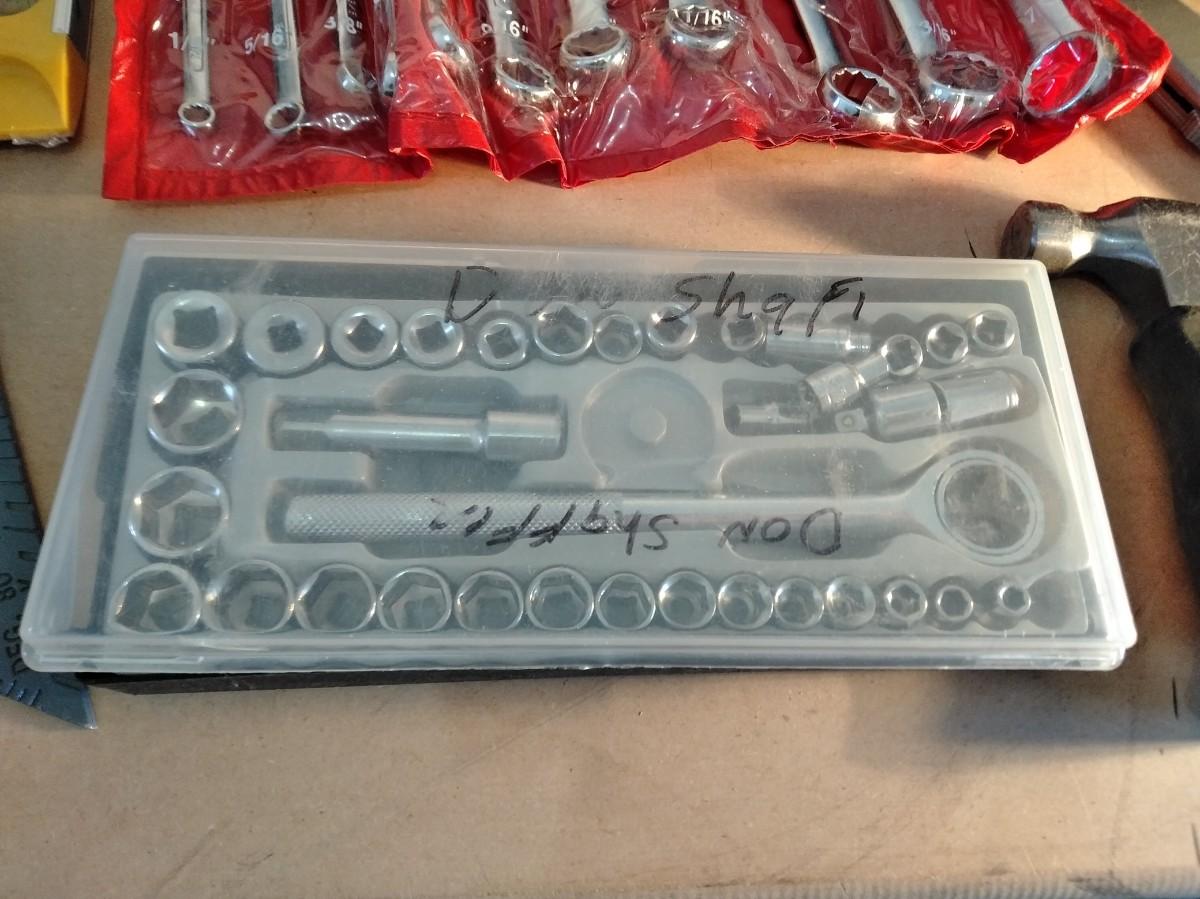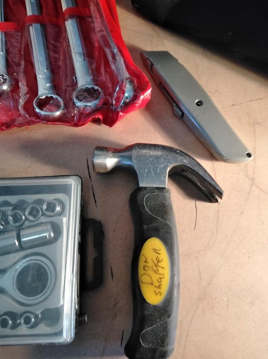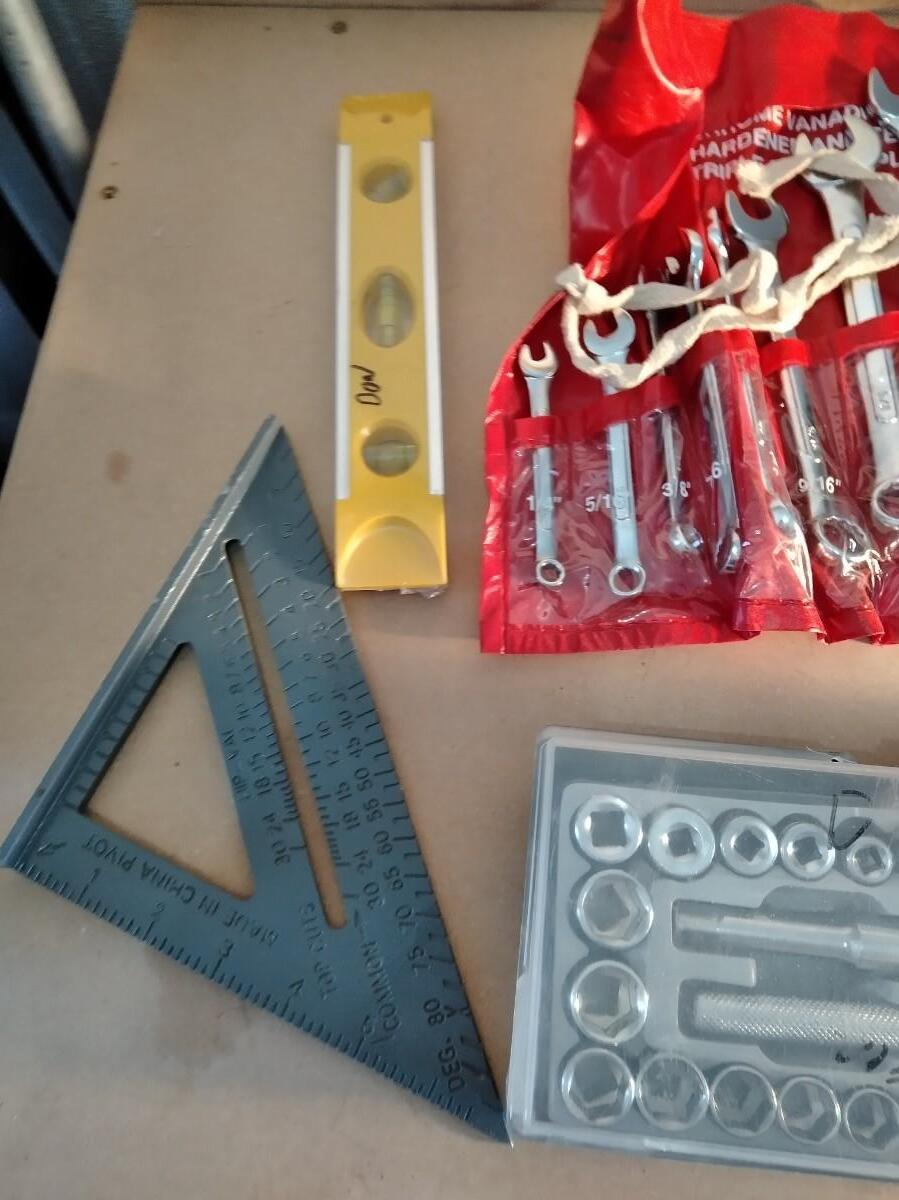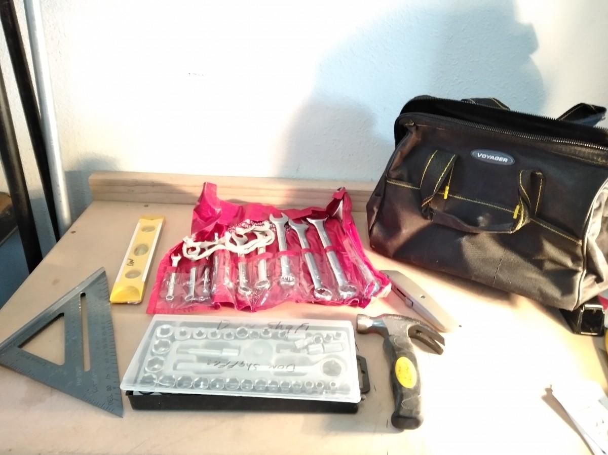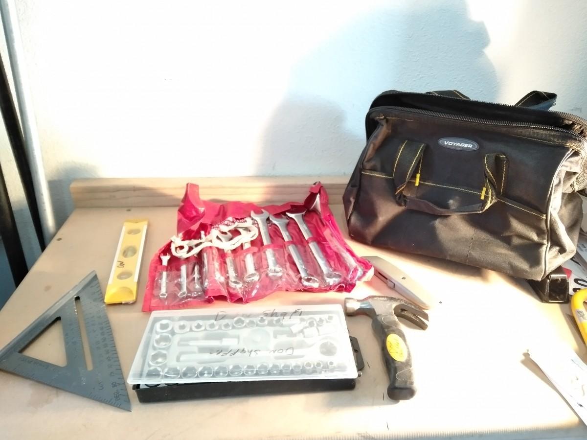 WRENCH SET, LEVEL, SMALL HAMMER, BIT SET WITH RATCHET, WITH OTHER TOOLS IN A TOOL BAG.