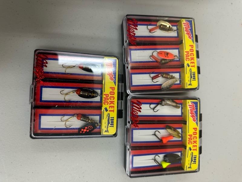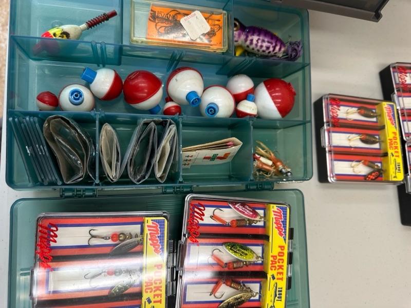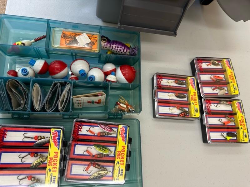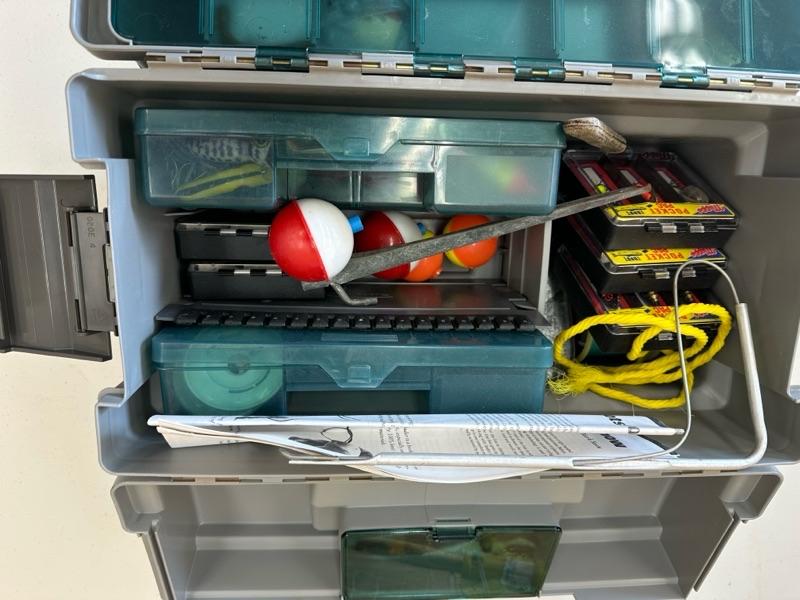 Fishing gear, Rubbermaid, tacklebox, net, and lures