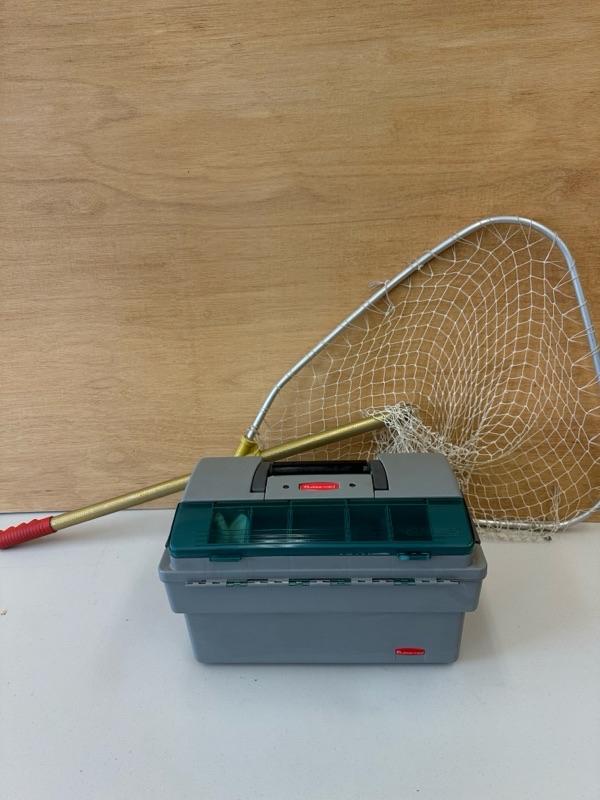 Lot 1383 fishing gear, Rubbermaid, tacklebox, and net