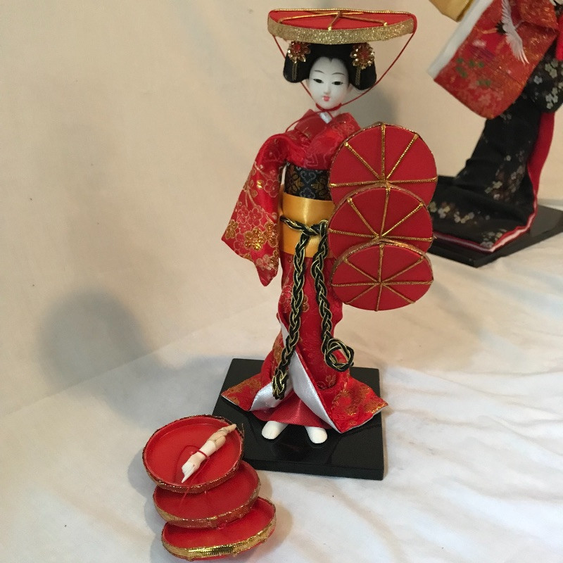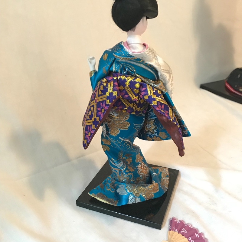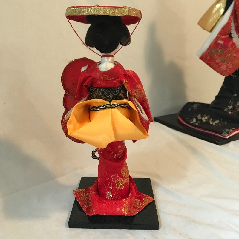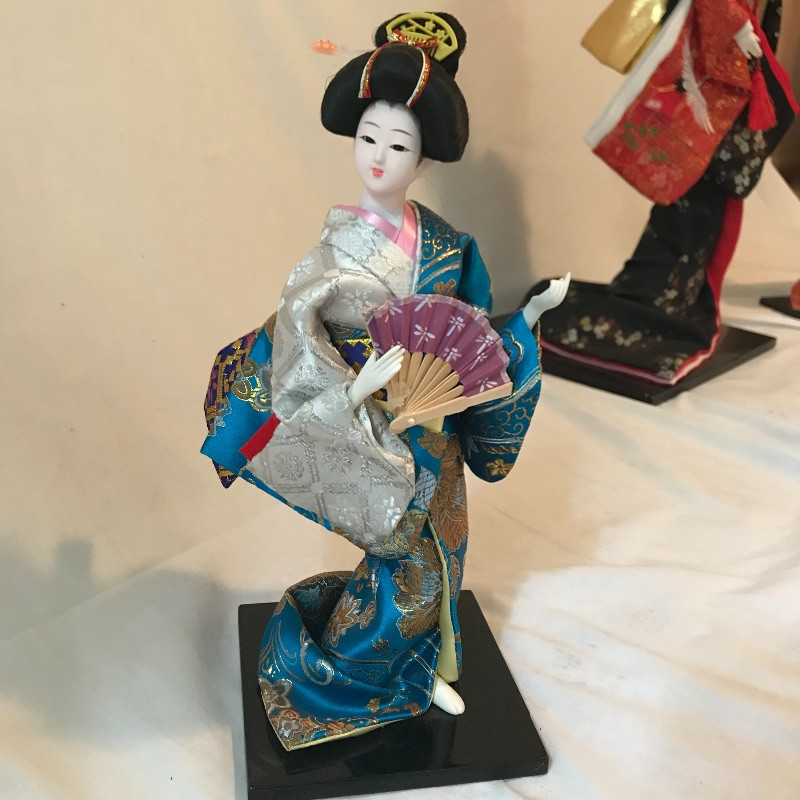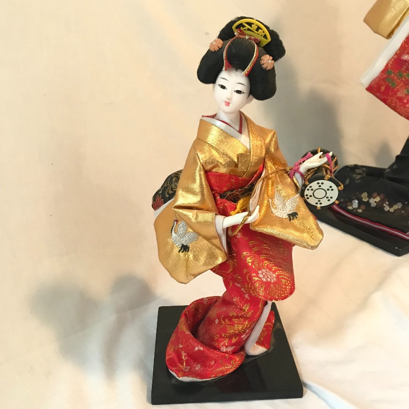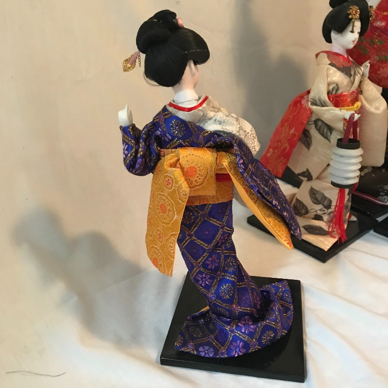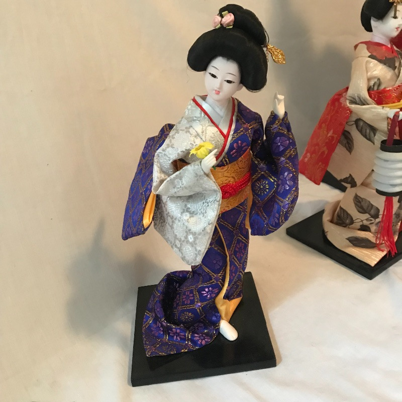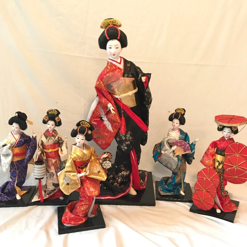 Five smaller lovely ladies each with a different stunning style. Each of the smaller dolls have a head that can turn and arms that could possibly be made of wire before their porcelain hands. Some have feet showing, but no legs. It is unclear what material makes the base of the dolls, as their garments are fixed in place. The geisha first photographed solo with the purple and gold kimono is slightly wobbly. The red and gold geisha has a detached arm, see photos. These smaller dolls are all about 12”. The larger 22” is manufactured the same way, with a soft wood or foam style body covered by her lovely kimono. Some dolls need some dusting. All six dolls appear to have glass eyes. See photos. Shipping available.
