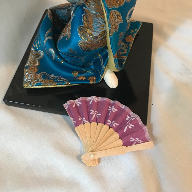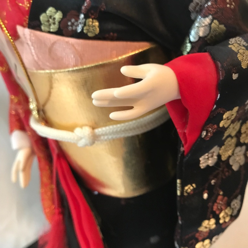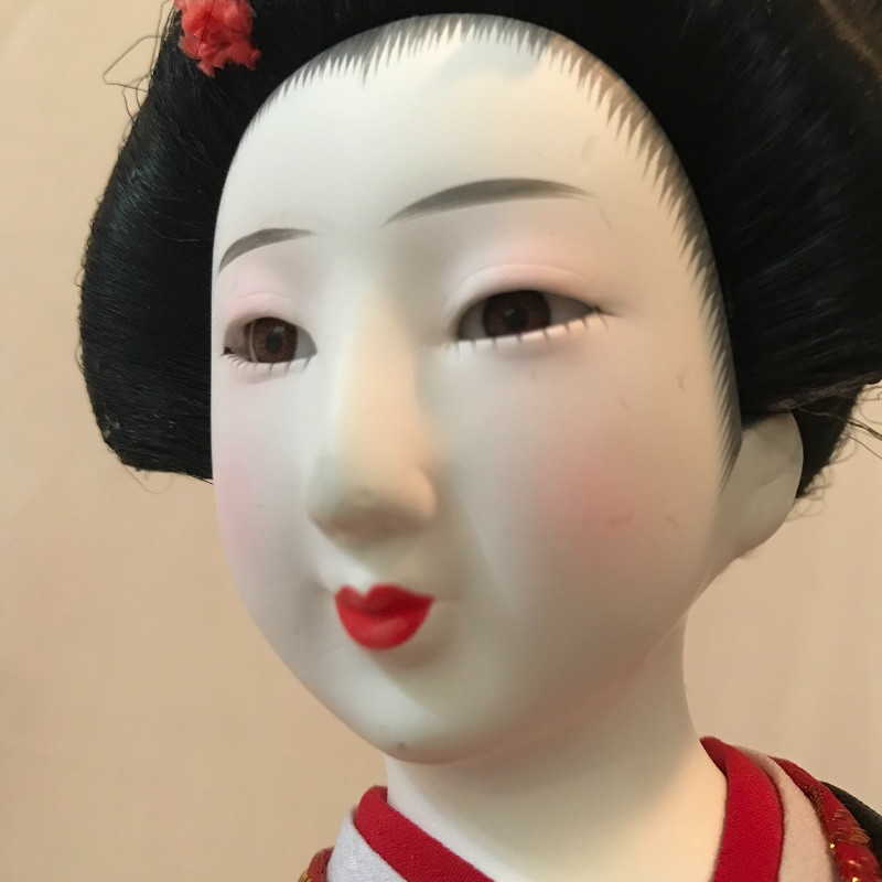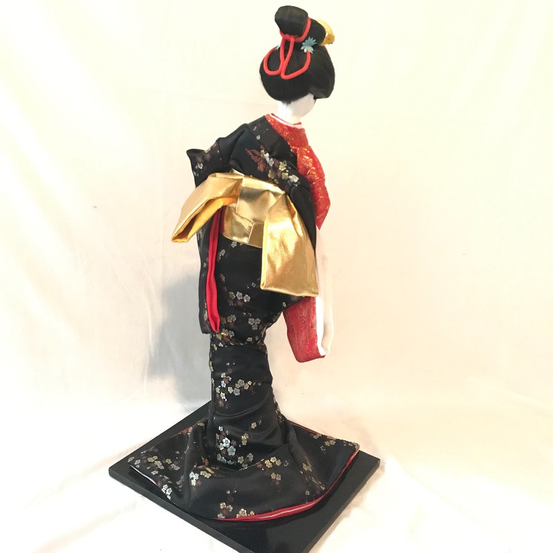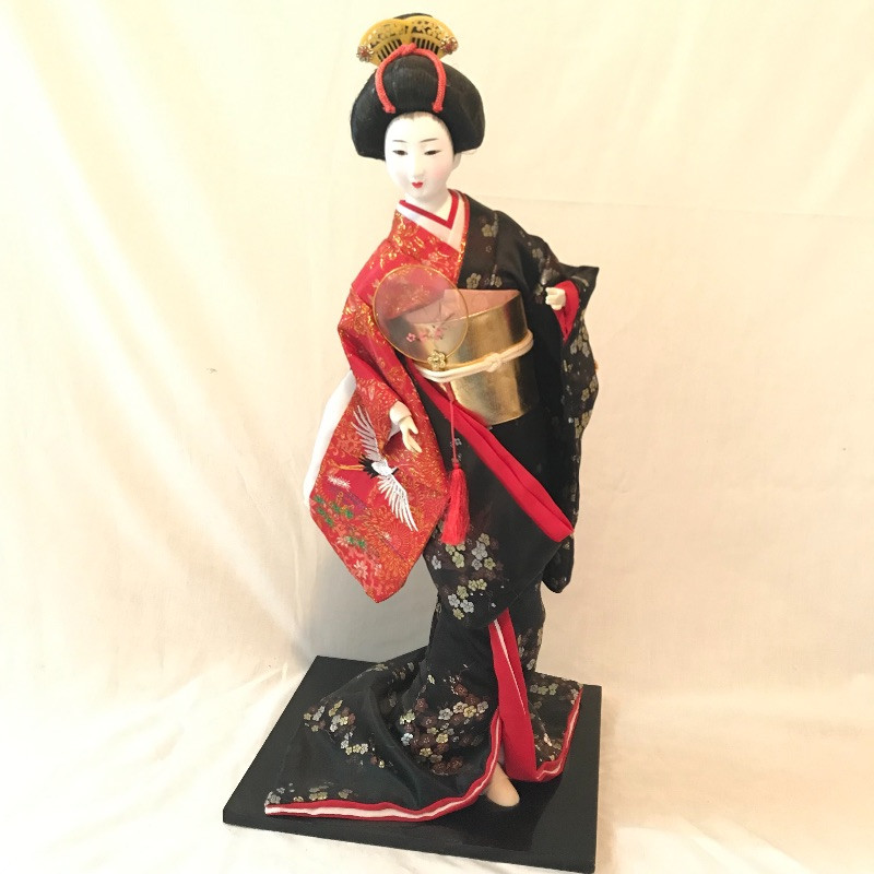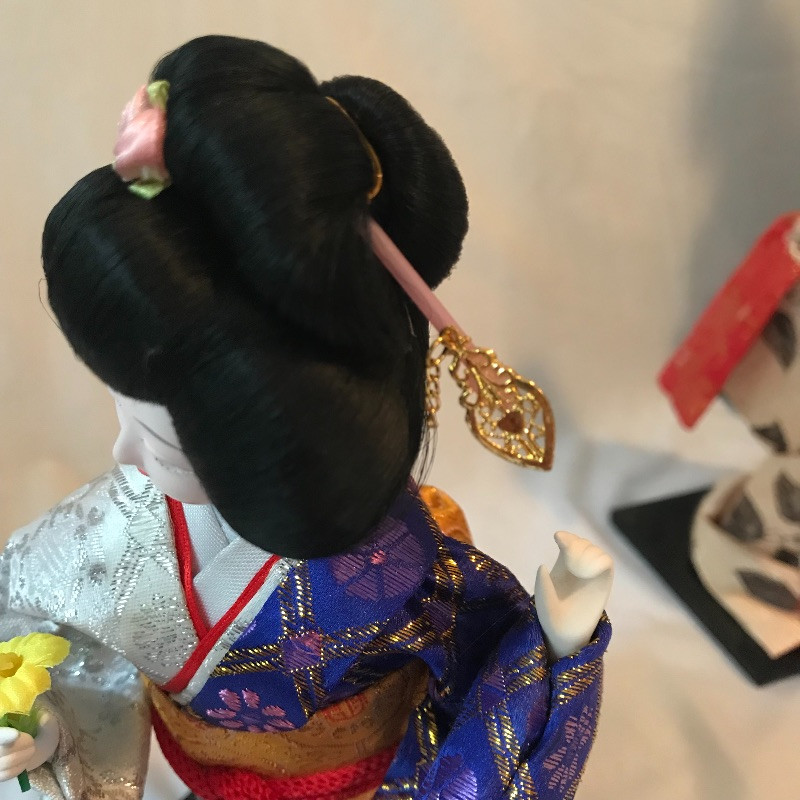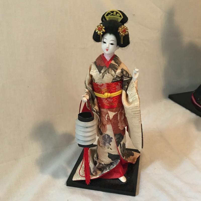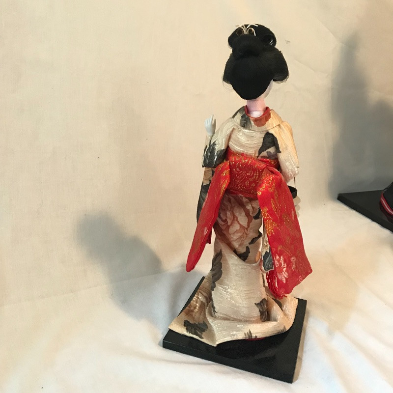 Five smaller lovely ladies each with a different stunning style. Each of the smaller dolls have a head that can turn and arms that could possibly be made of wire before their porcelain hands. Some have feet showing, but no legs. It is unclear what material makes the base of the dolls, as their garments are fixed in place. The geisha first photographed solo with the purple and gold kimono is slightly wobbly. The red and gold geisha has a detached arm, see photos. These smaller dolls are all about 12”. The larger 22” is manufactured the same way, with a soft wood or foam style body covered by her lovely kimono. Some dolls need some dusting. All six dolls appear to have glass eyes. See photos. Shipping available.