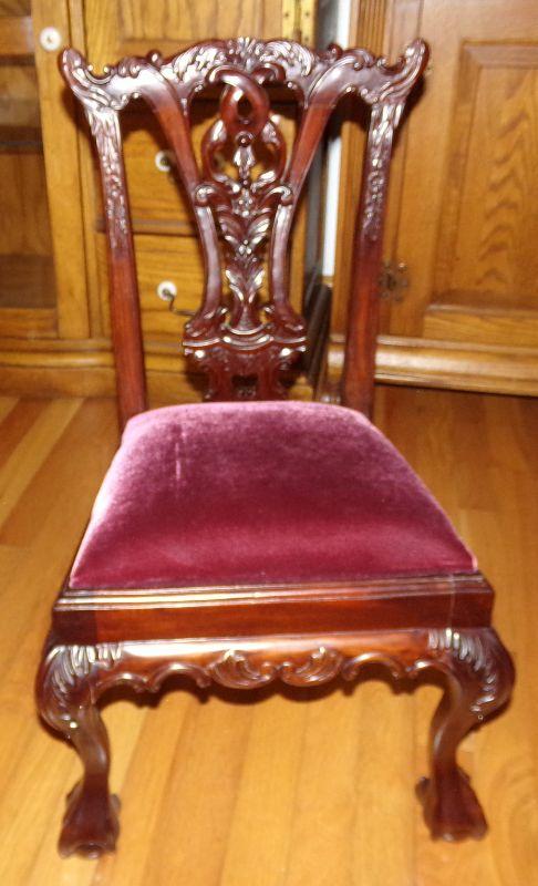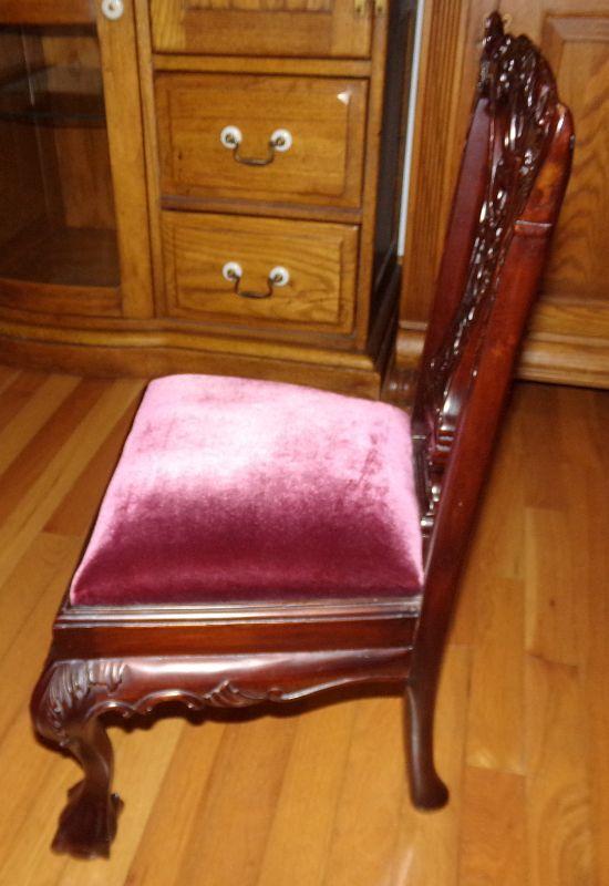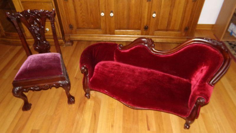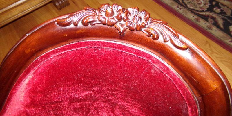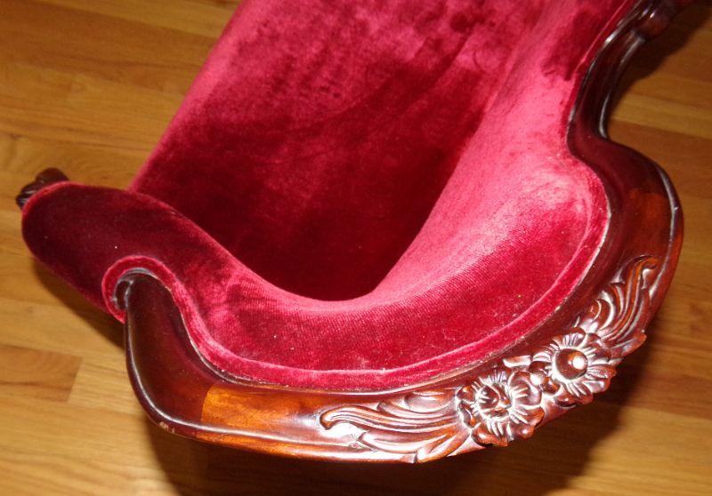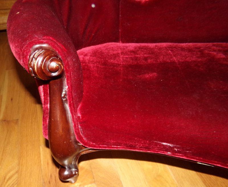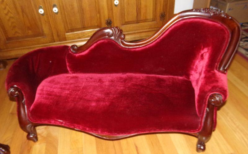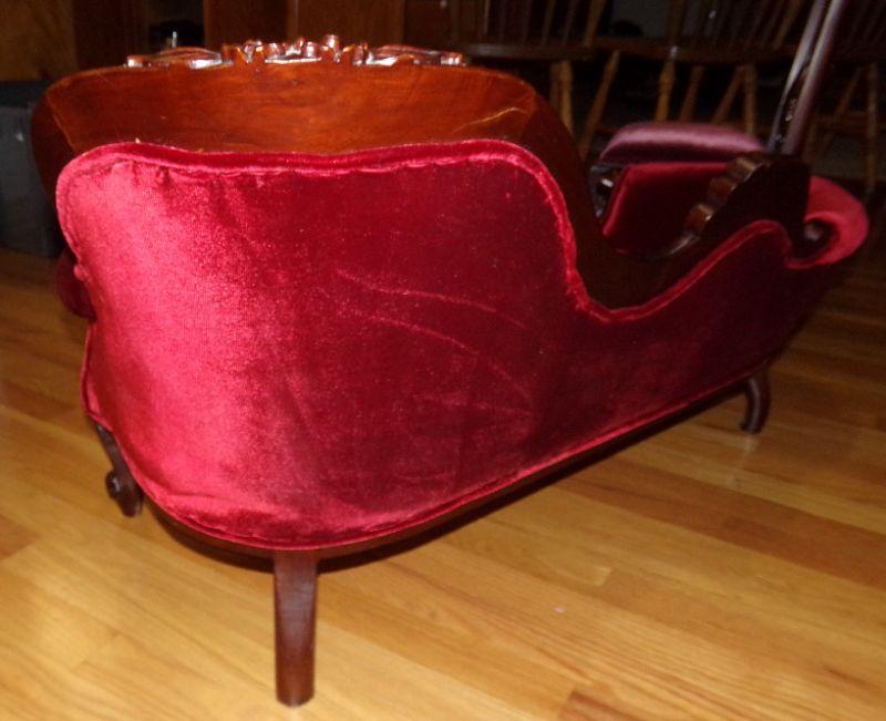 BURGUNDY VELVET CHAISE DOLL LOUNGE WITH ORNATE WOODEN FRAME MEASURES 48" X 18" X 19" TALL IN VG CONDITION