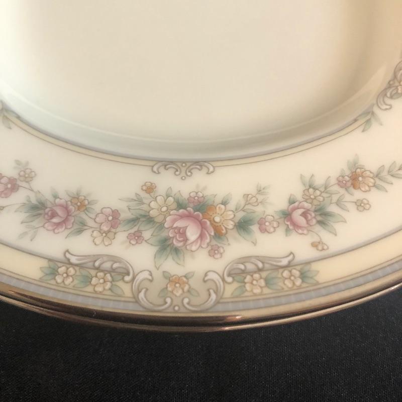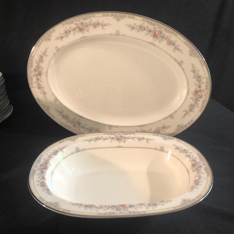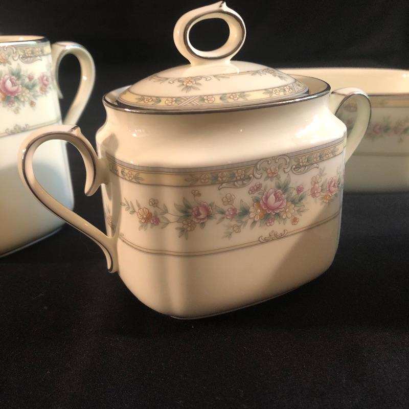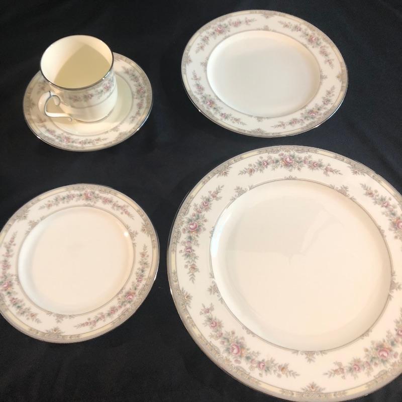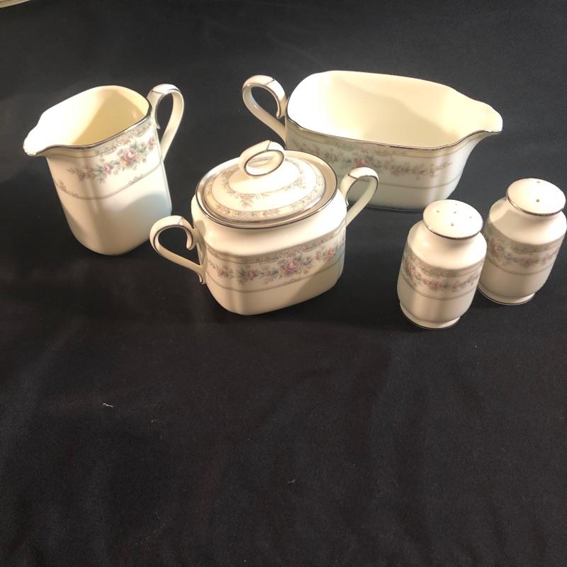 This charming bone china set is in lovely condition. It is patterned with delicate pink roses and rimmed with silver. The set includes dinner plates, salad plates, bread plates and cups with saucers. There are twelve of each. For reference, the dinner plates measures 10.5”d. There is an oval serving platter (10”x14”) and a serving bowl, four small bowls, two small platters, salt and pepper shakers, gravy boat and cream and sugar containers. The maker is Noritake and is numbered 9729. All of the pieces are in great condition. This will make your dinner table look lovely. Shipping available.