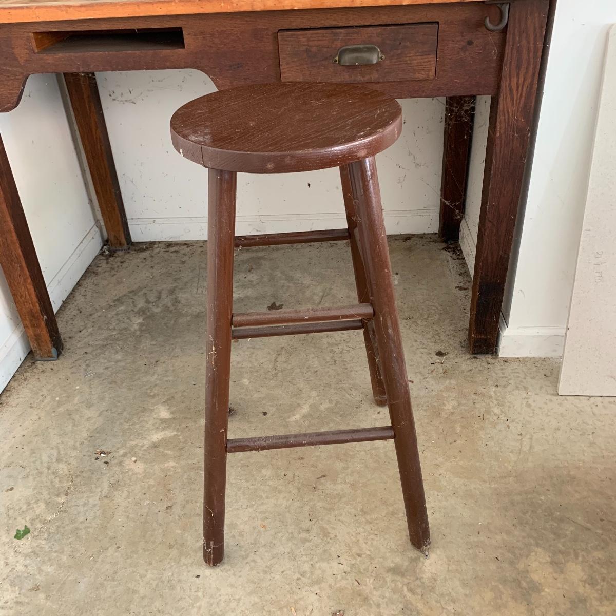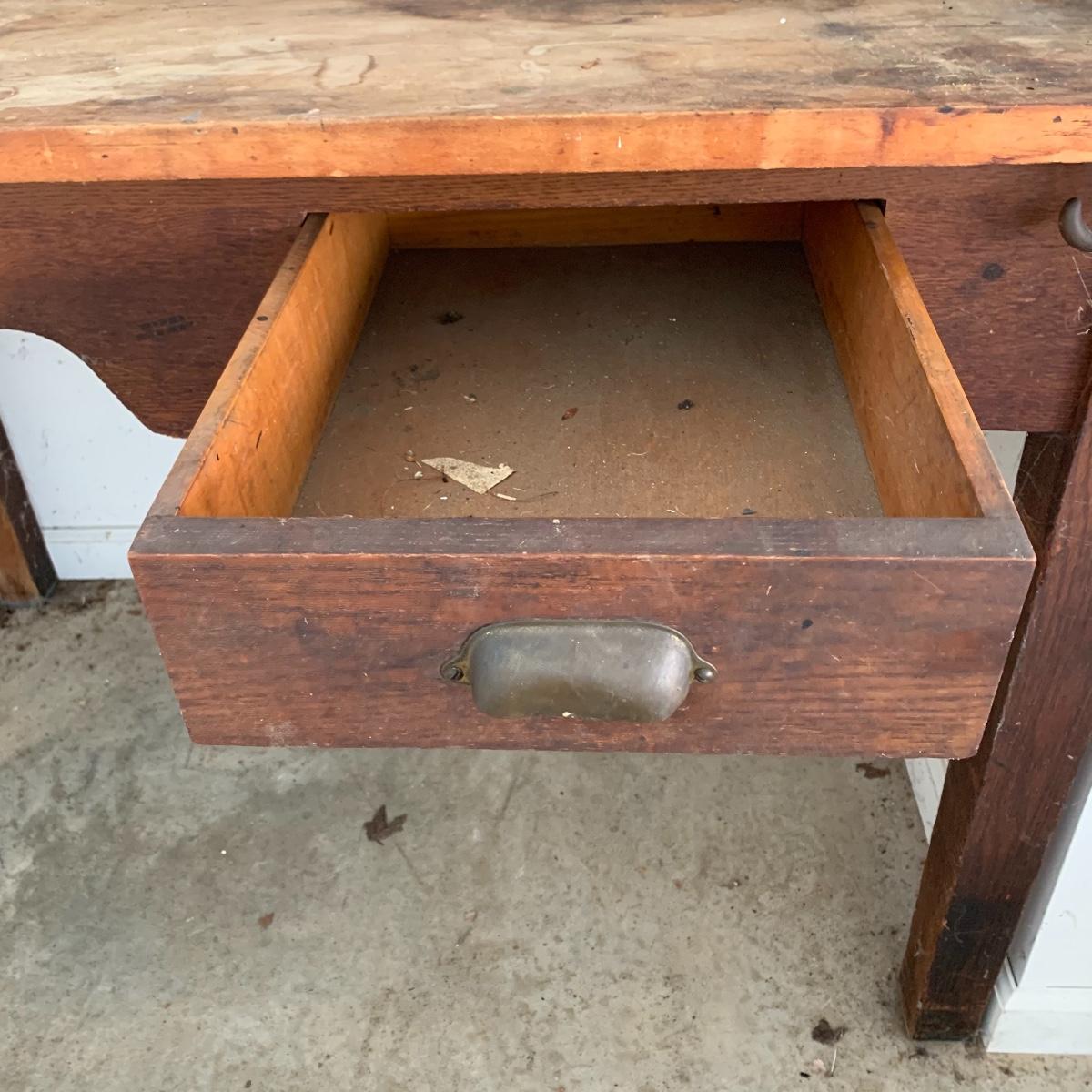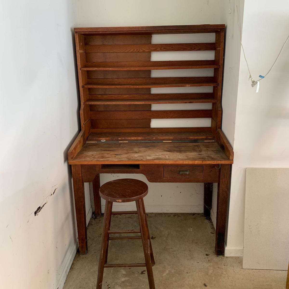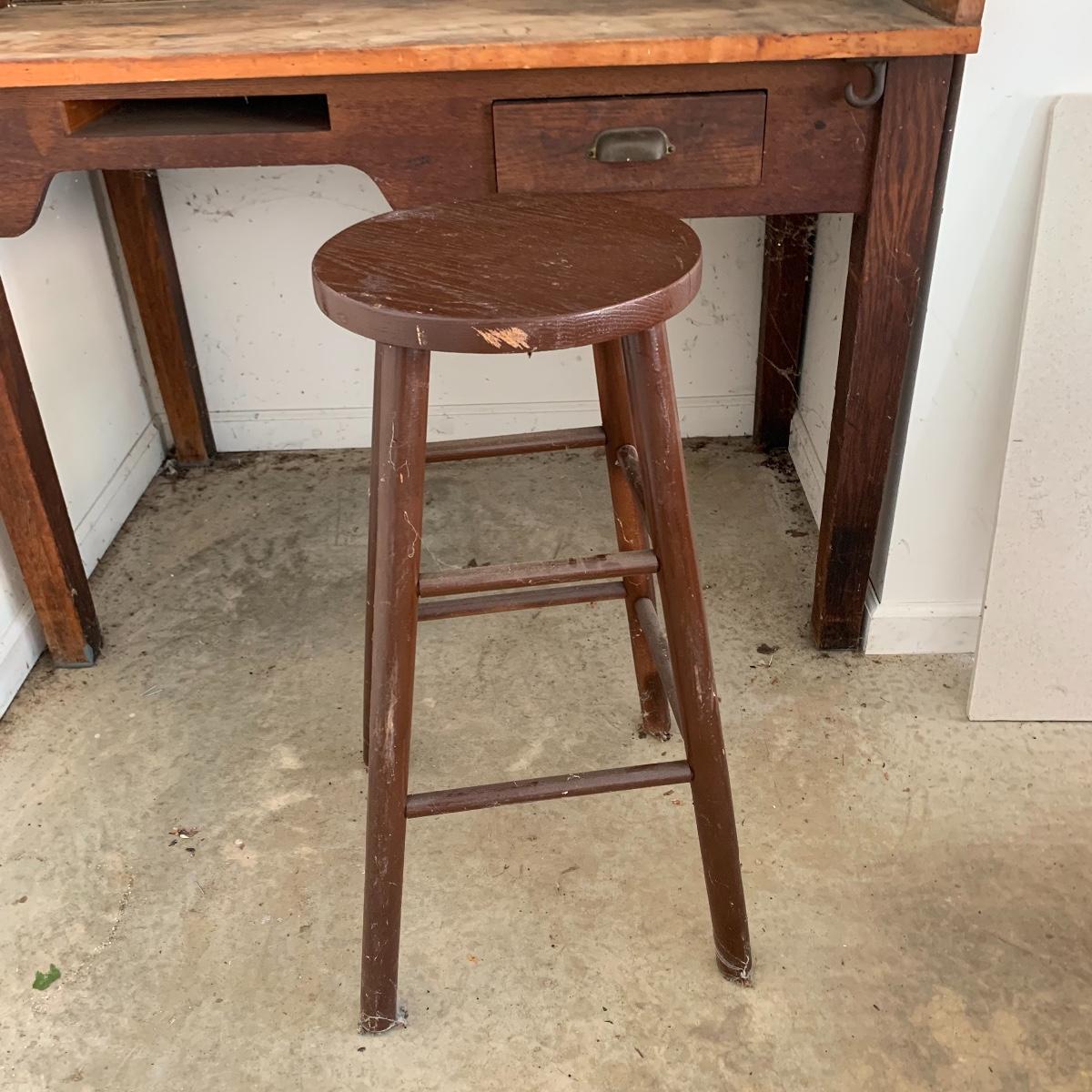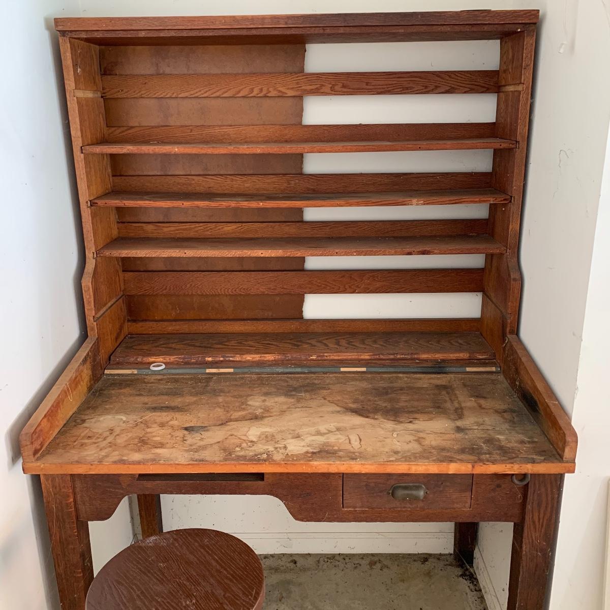 Here’s that sturdy, classic workbench and stool for your shop or garage. This lot features a great work bench with several shelves, a work deck and a drawer. This piece measures 6’ tall X 4’ wide X 30” deep. The work deck is 34” off the floor. Local pickup only