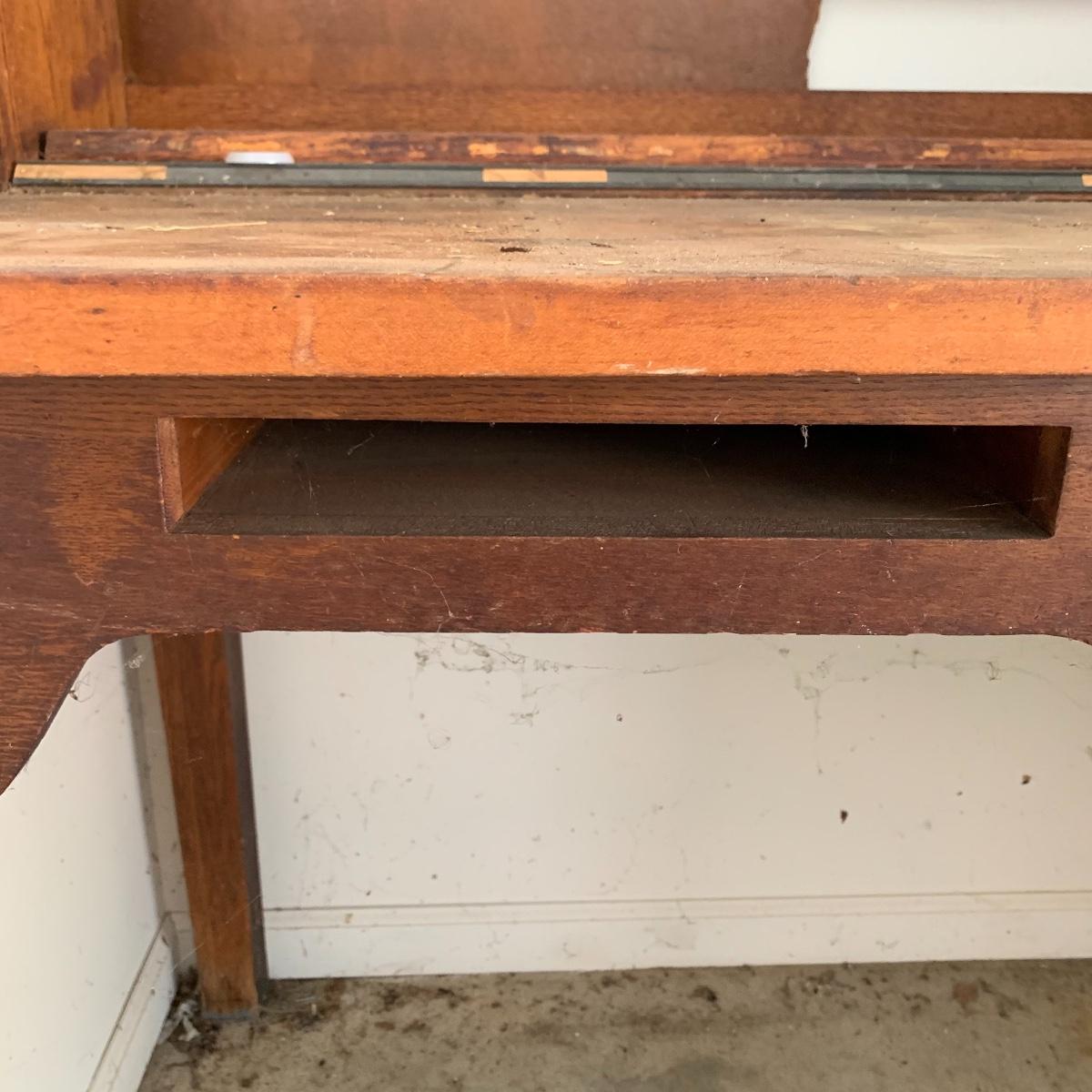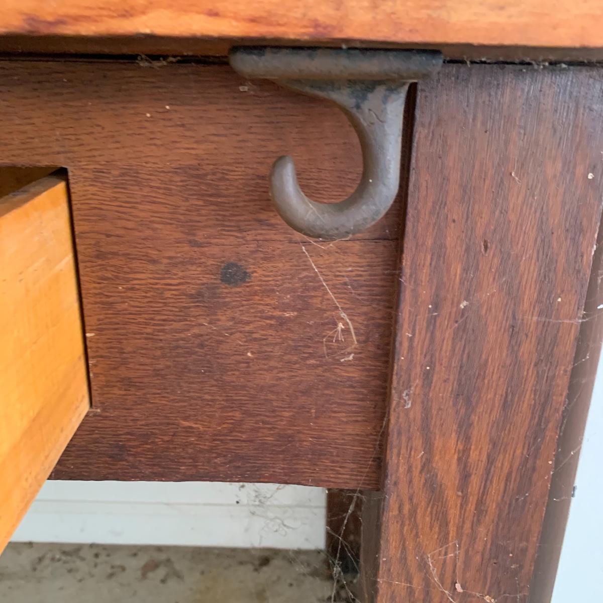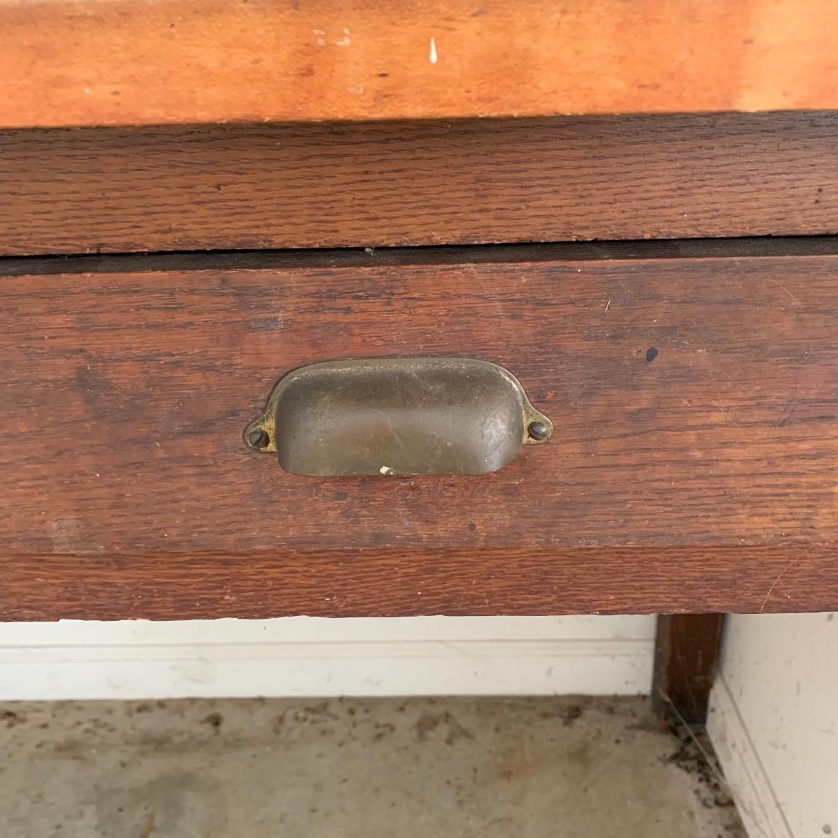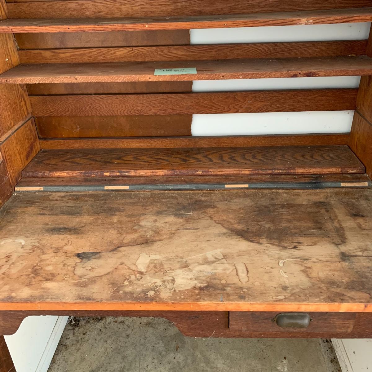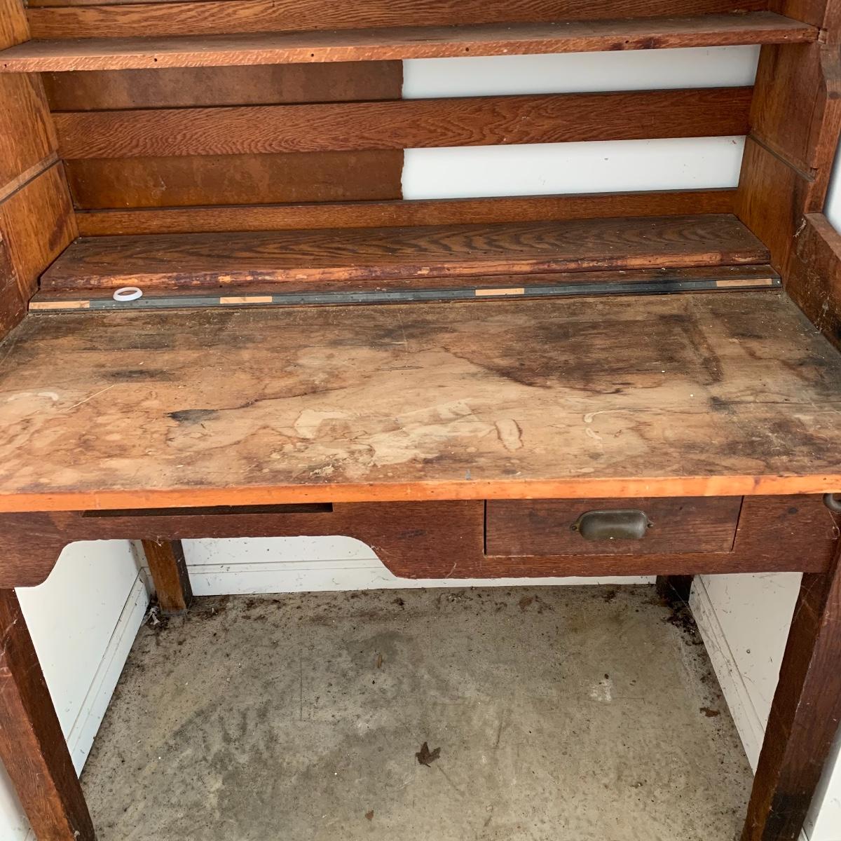 Here’s that sturdy, classic workbench and stool for your shop or garage. This lot features a great work bench with several shelves, a work deck and a drawer. This piece measures 6’ tall X 4’ wide X 30” deep. The work deck is 34” off the floor. Local pickup only