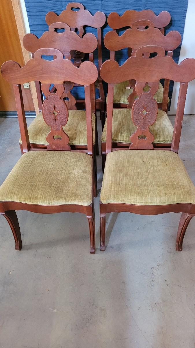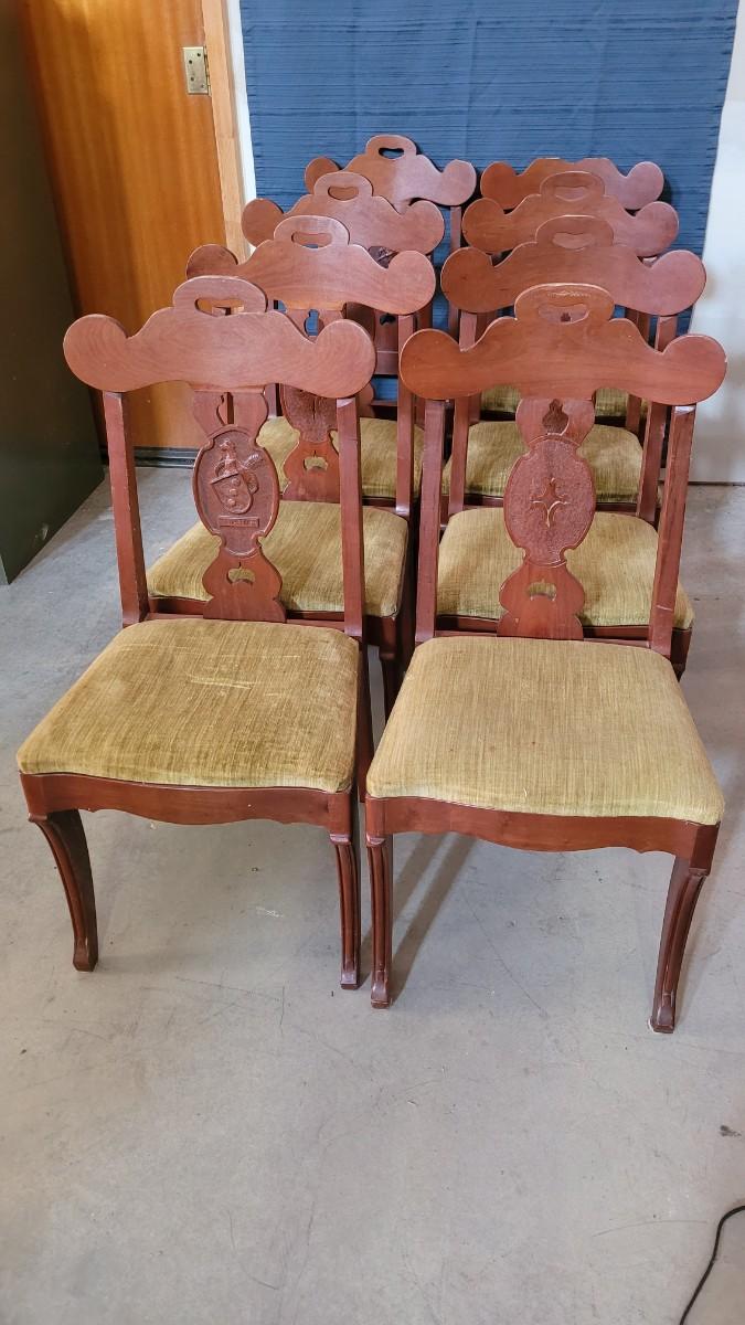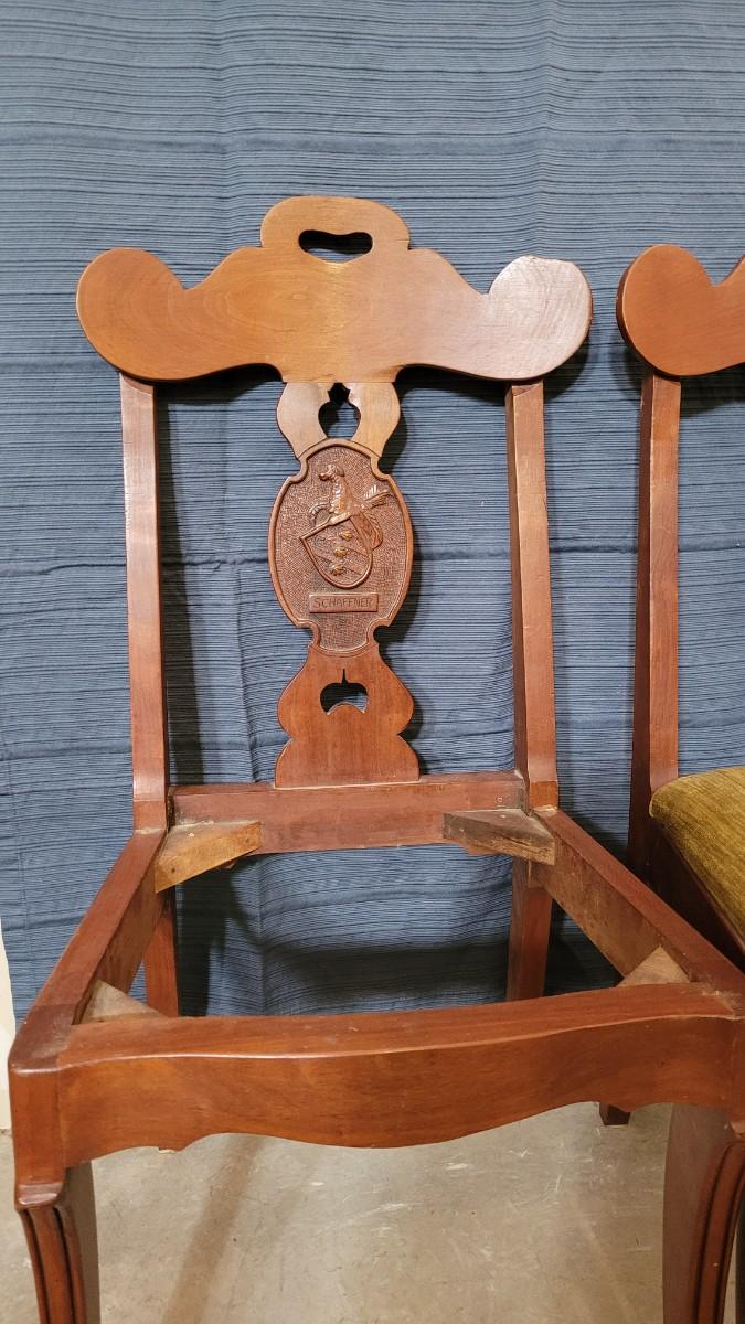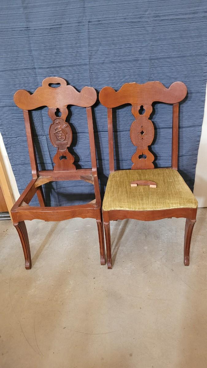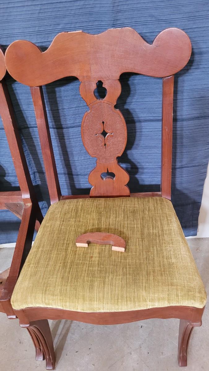 ****1 chair has broken top piece but the piece comes with the chair to be repaired & the Monogrammed Chair's seat Cushion has been located!****
