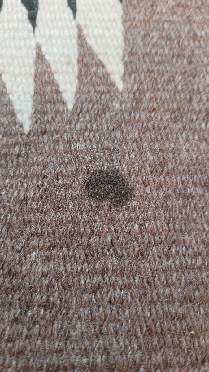 Has some red discoloration in a spot on one side. The other side the red/pink it is very faint. One spot has small moth? spots. There is also a round dark spot on one side.