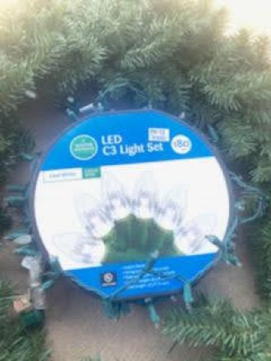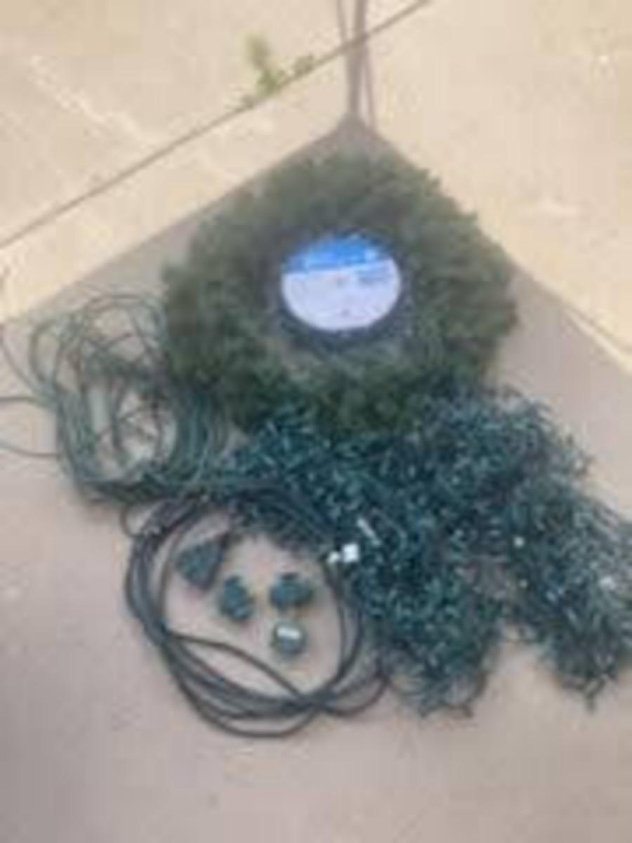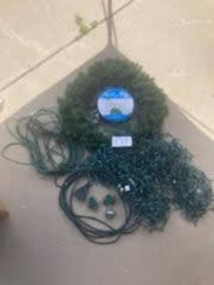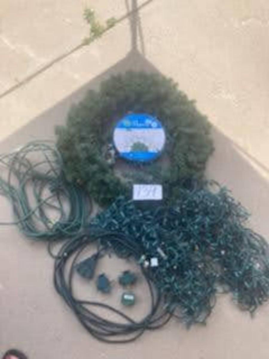 LOT 139  CHRISTMAS LIGHTS, EXTENSION CORDS AND A WREATH (G)